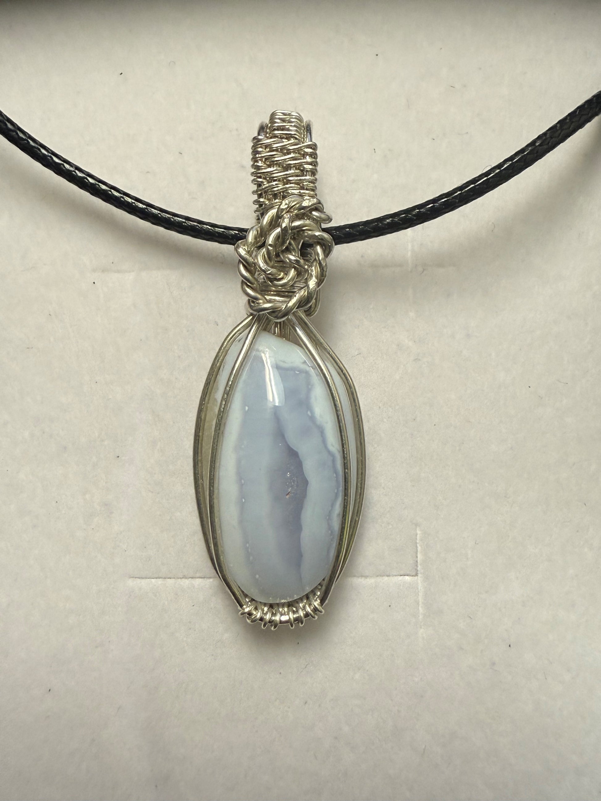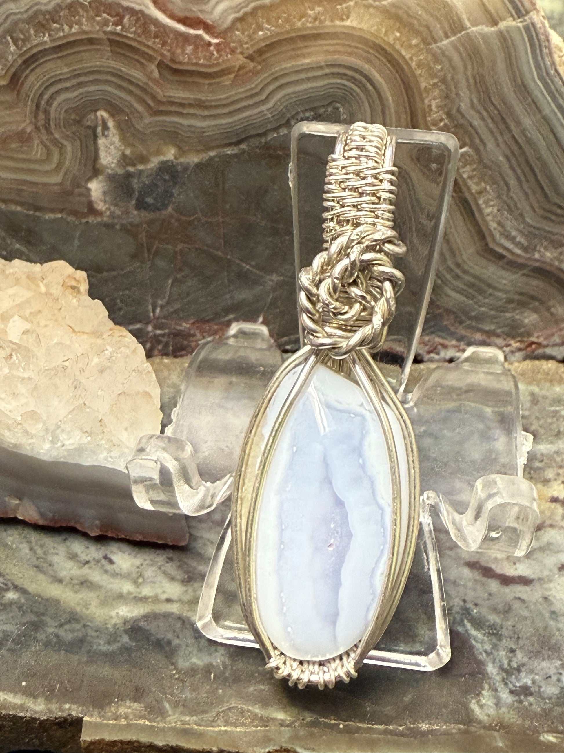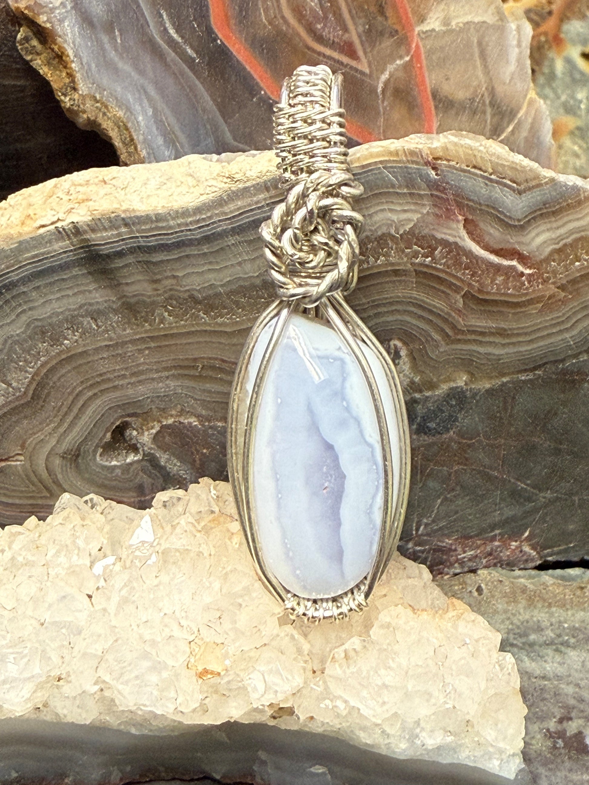 Handgeformter und polierter, wunderschöner blauer Spitzenachat. Dieser Anhänger ist mit einem Sterling-Silberdraht (925) umwickelt. Er ist langlebig und sowohl der Stein als auch der Draht sind hervorragend poliert.