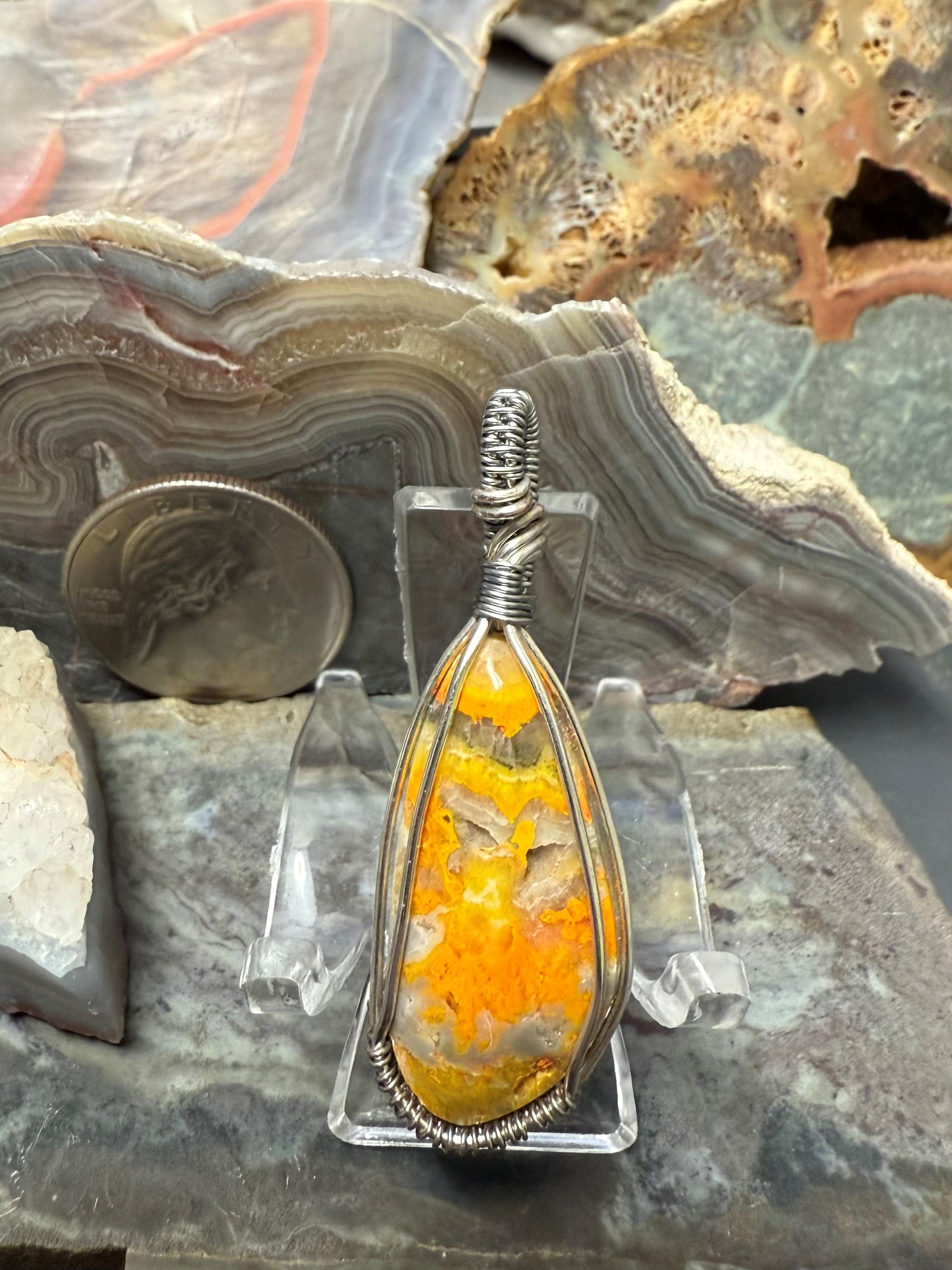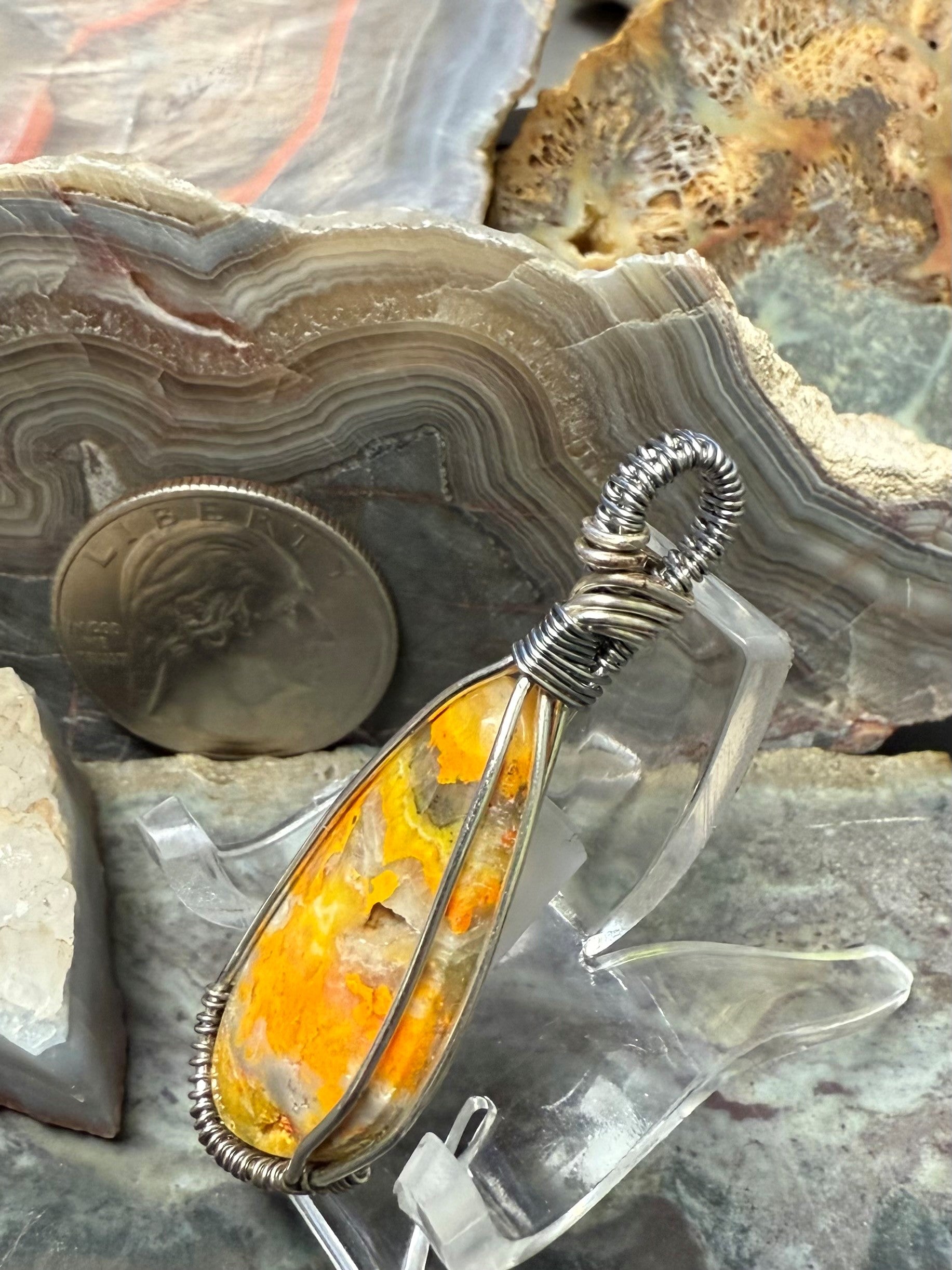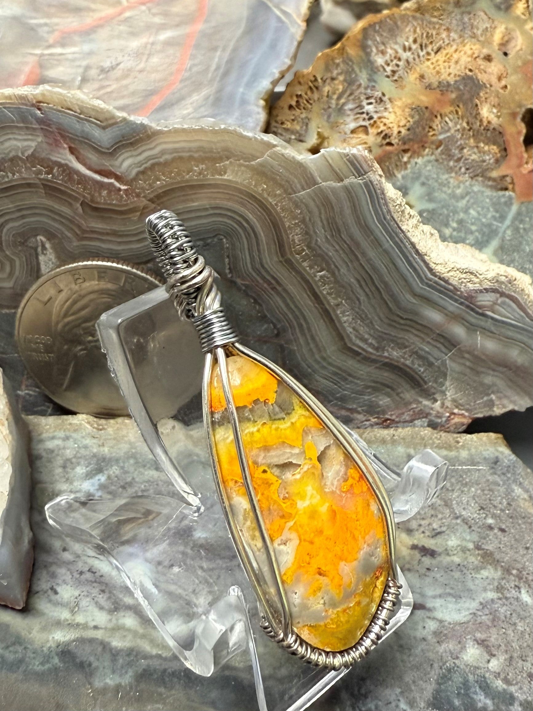 Handgeformter und polierter, natürlicher und schöner gelber Hummeljaspis. Dieser Anhänger ist mit einem silberfarbenen Kupferdraht umwickelt, der so konzipiert und beschichtet ist, dass er schneller Oxidation widersteht.