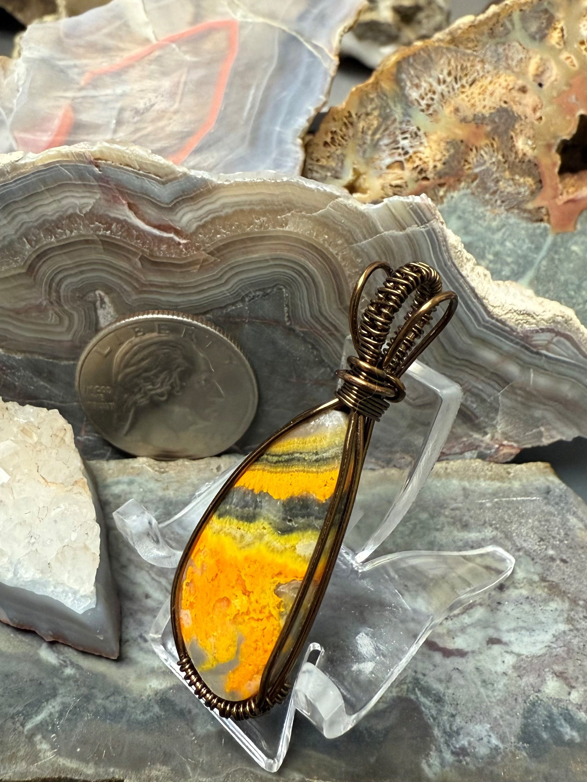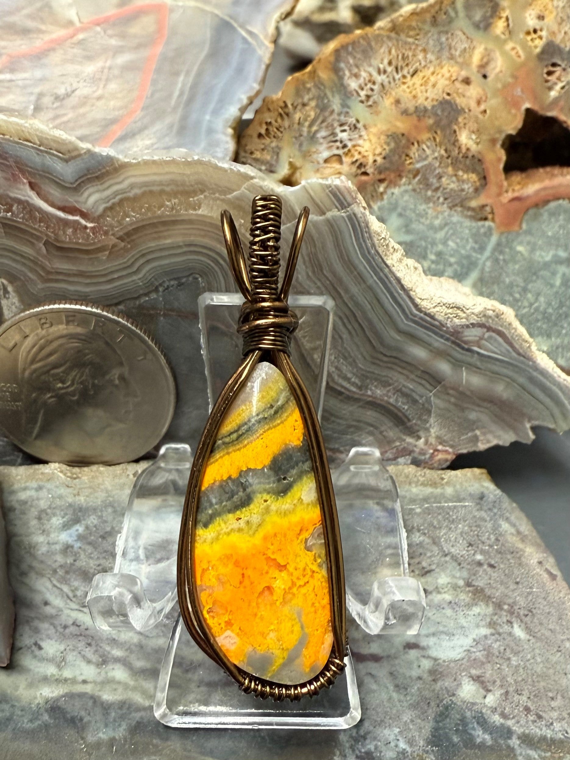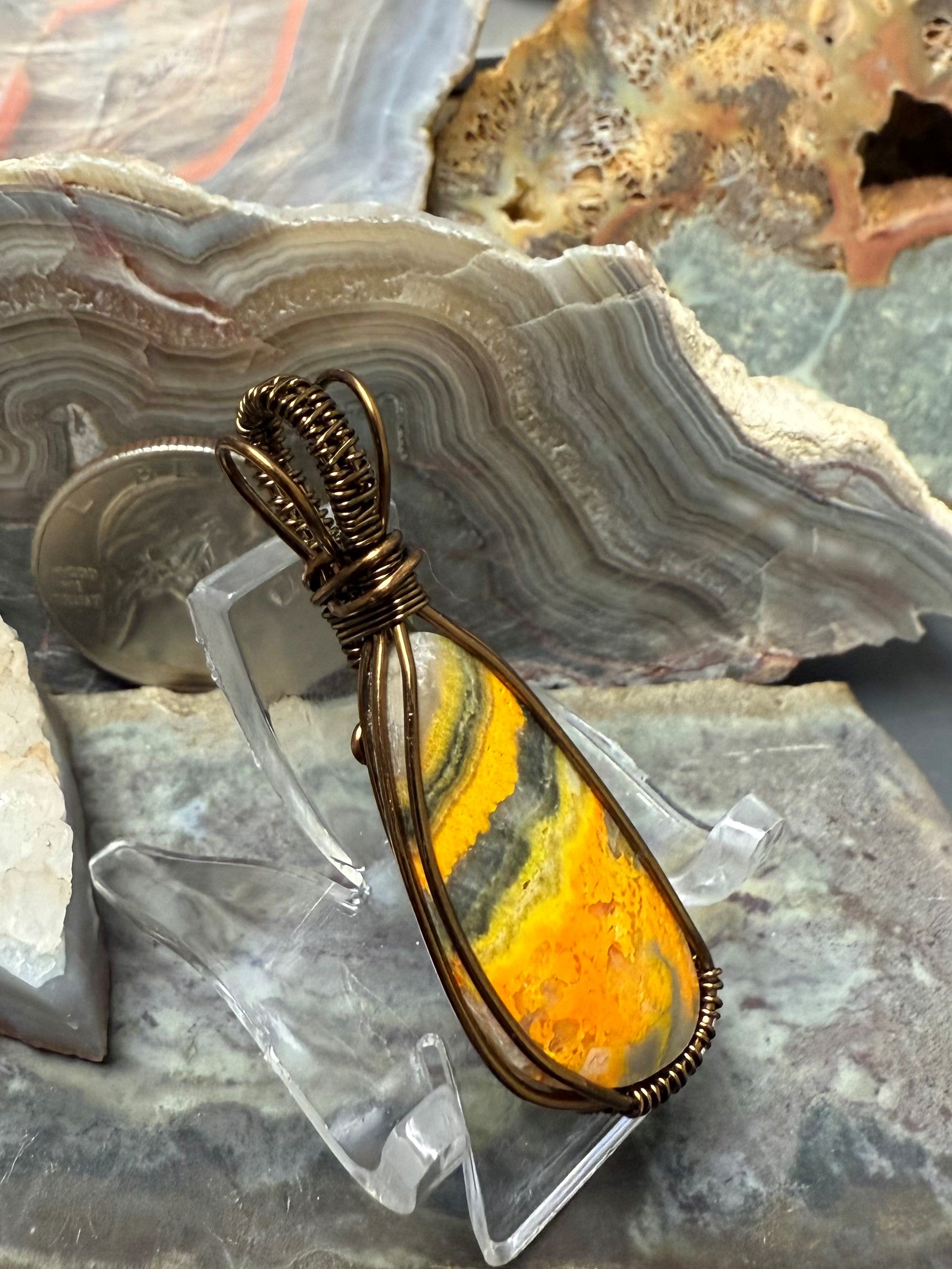 Handgeformter und polierter, natürlicher und schöner gelber Hummeljaspis. Dieser Anhänger ist mit einem bronzefarbenen Kupferdraht umwickelt, der so konzipiert und beschichtet ist, dass er schneller Oxidation widersteht.