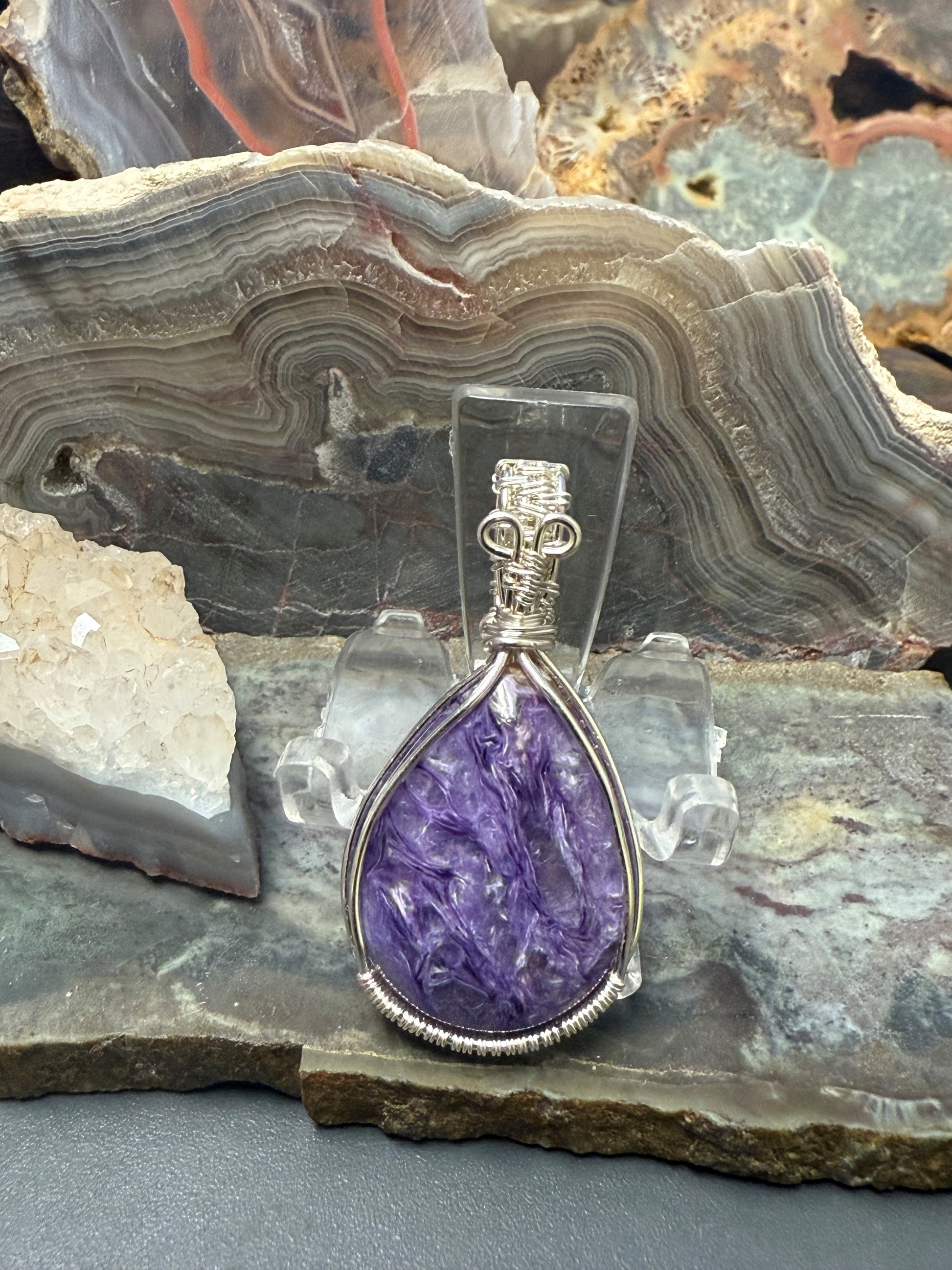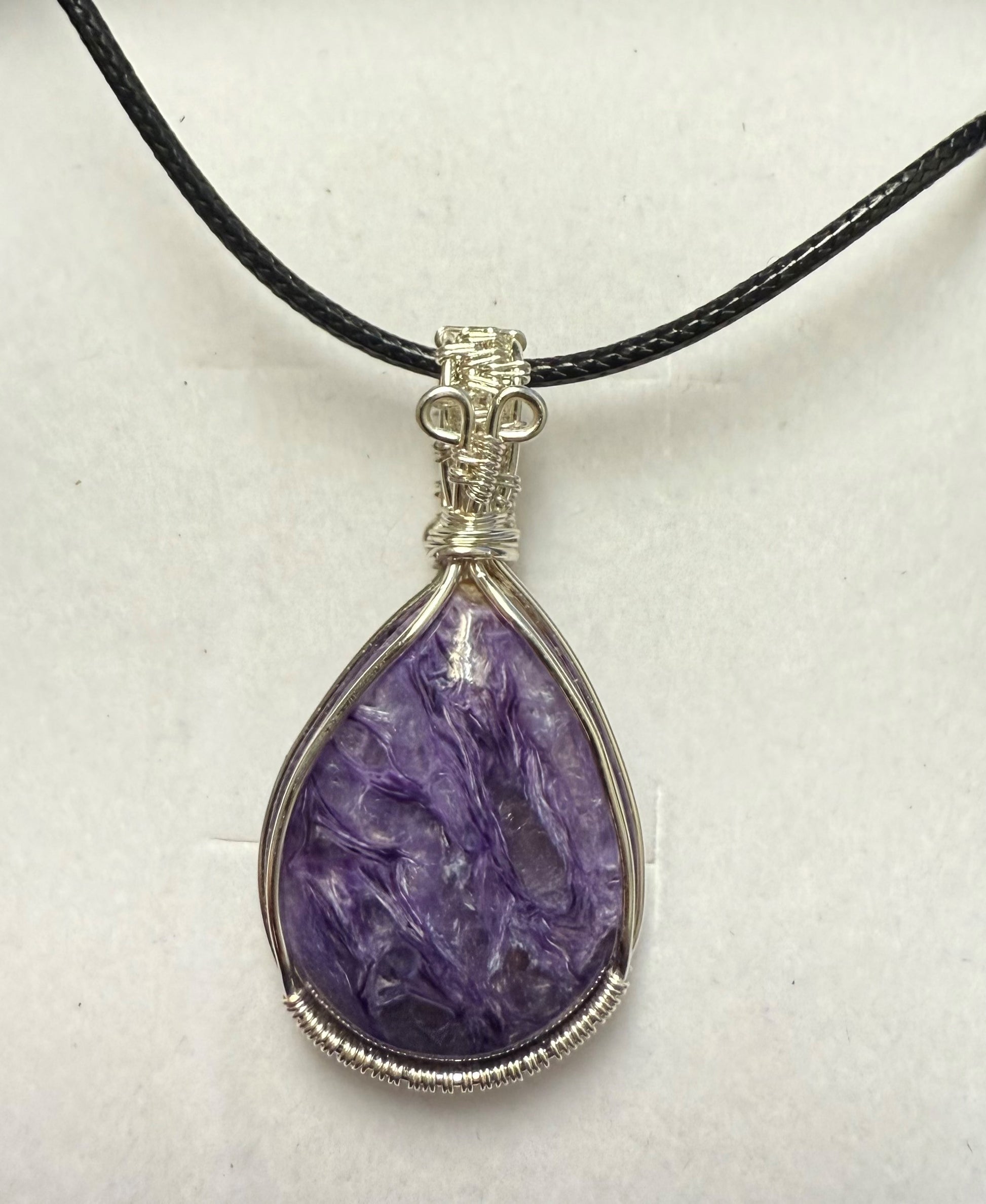 Von Hand geformt und poliert, natürlich und wunderschön, violett mit Perlenglanz, Charoit. Dieser Anhänger ist mit einem silberfarbenen Kupferdraht umwickelt, der so konzipiert und beschichtet ist, dass er schneller Oxidation widersteht.