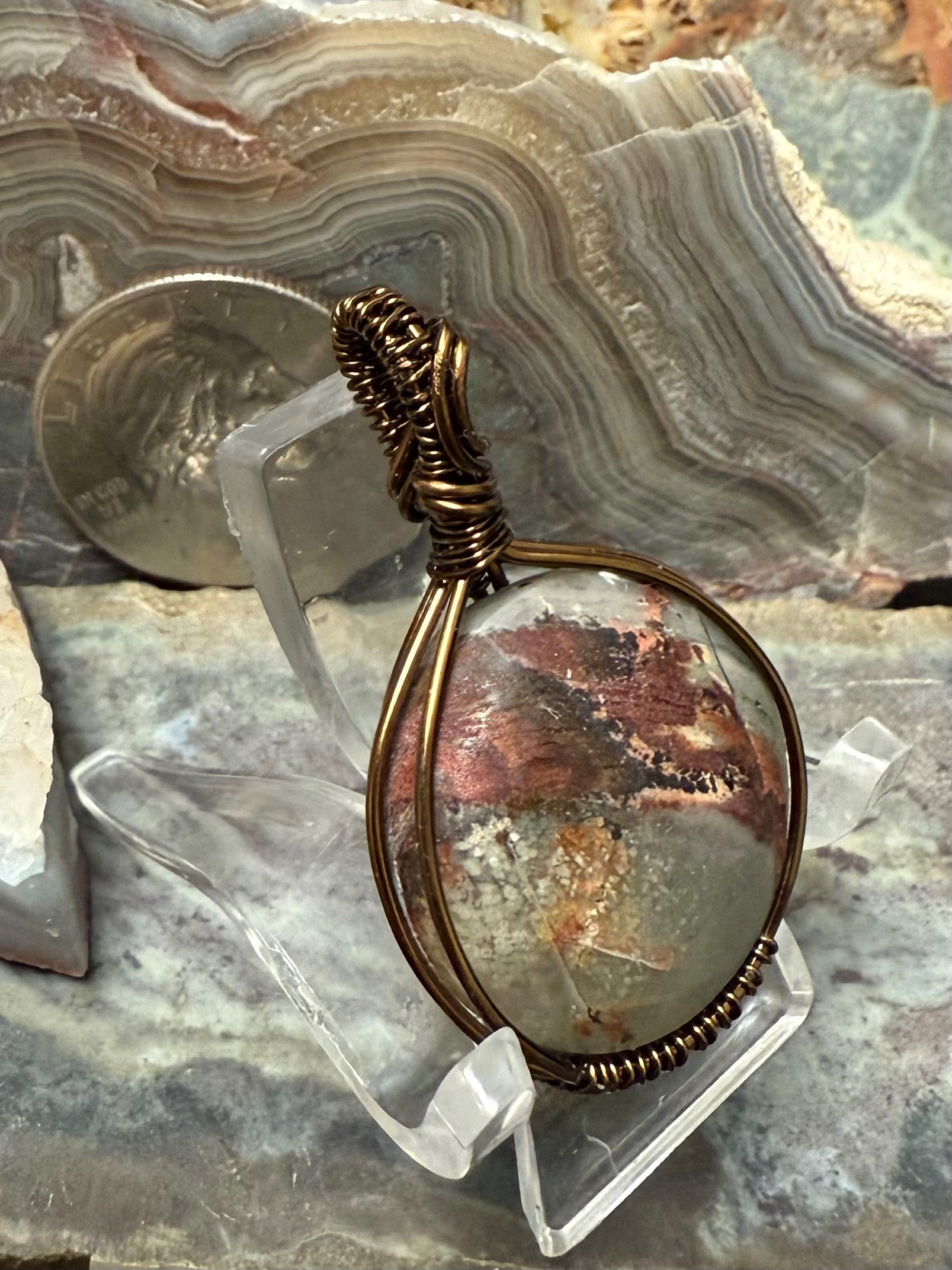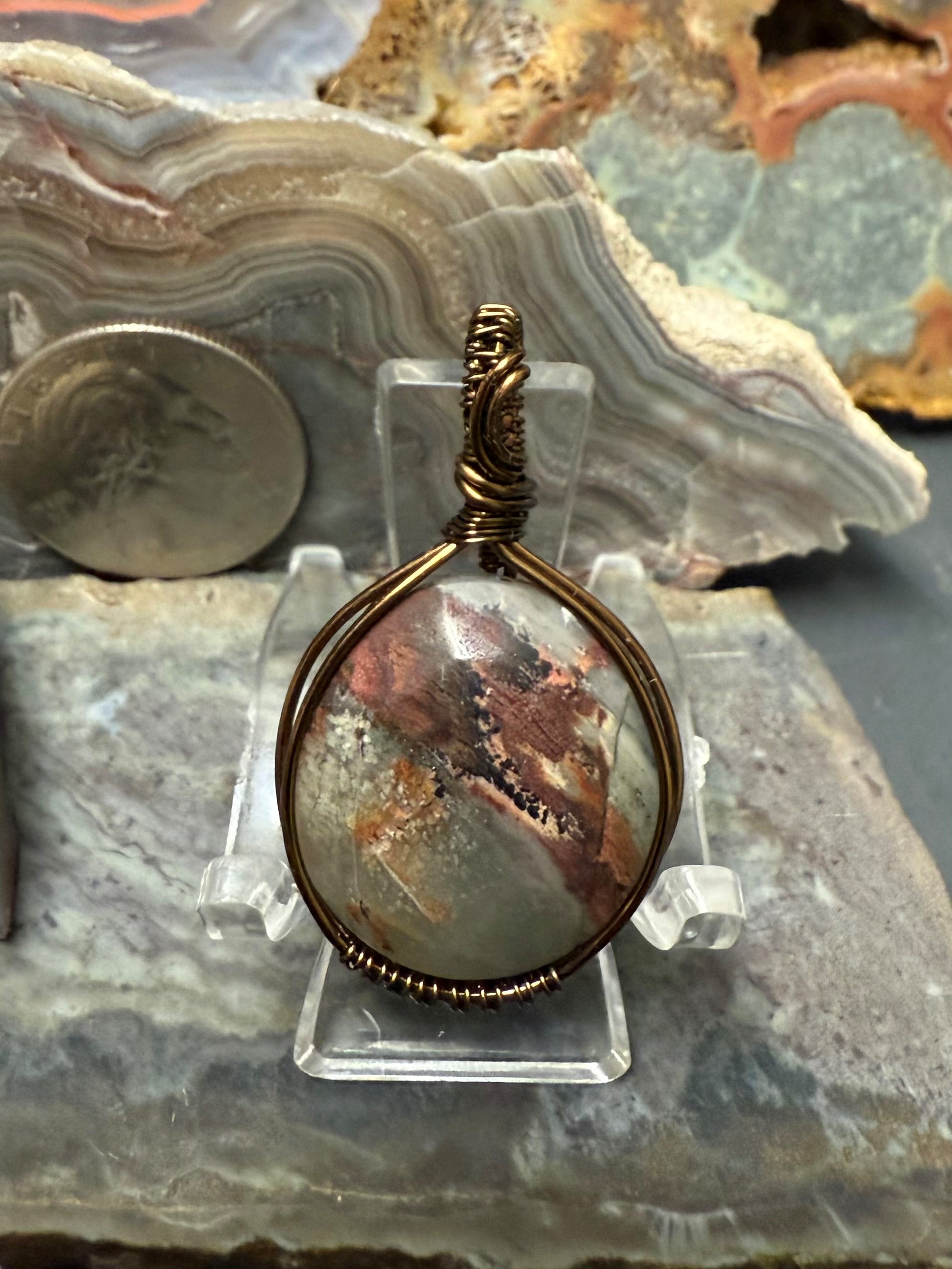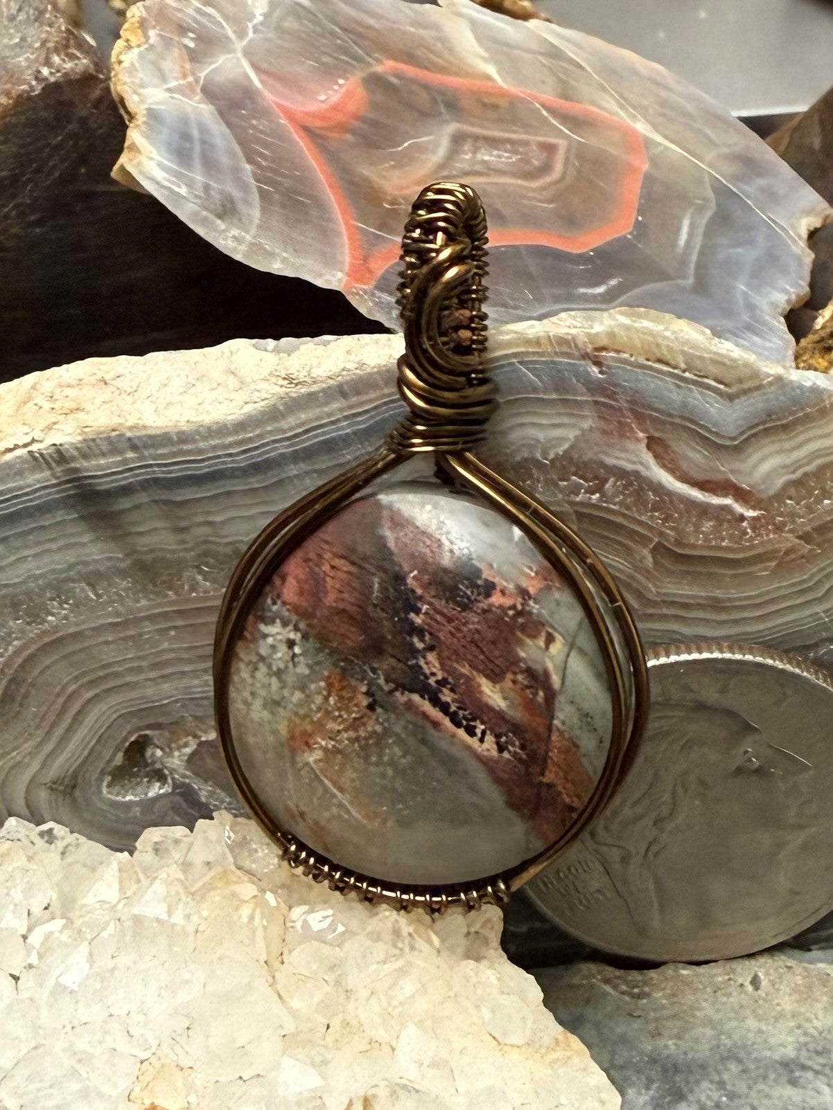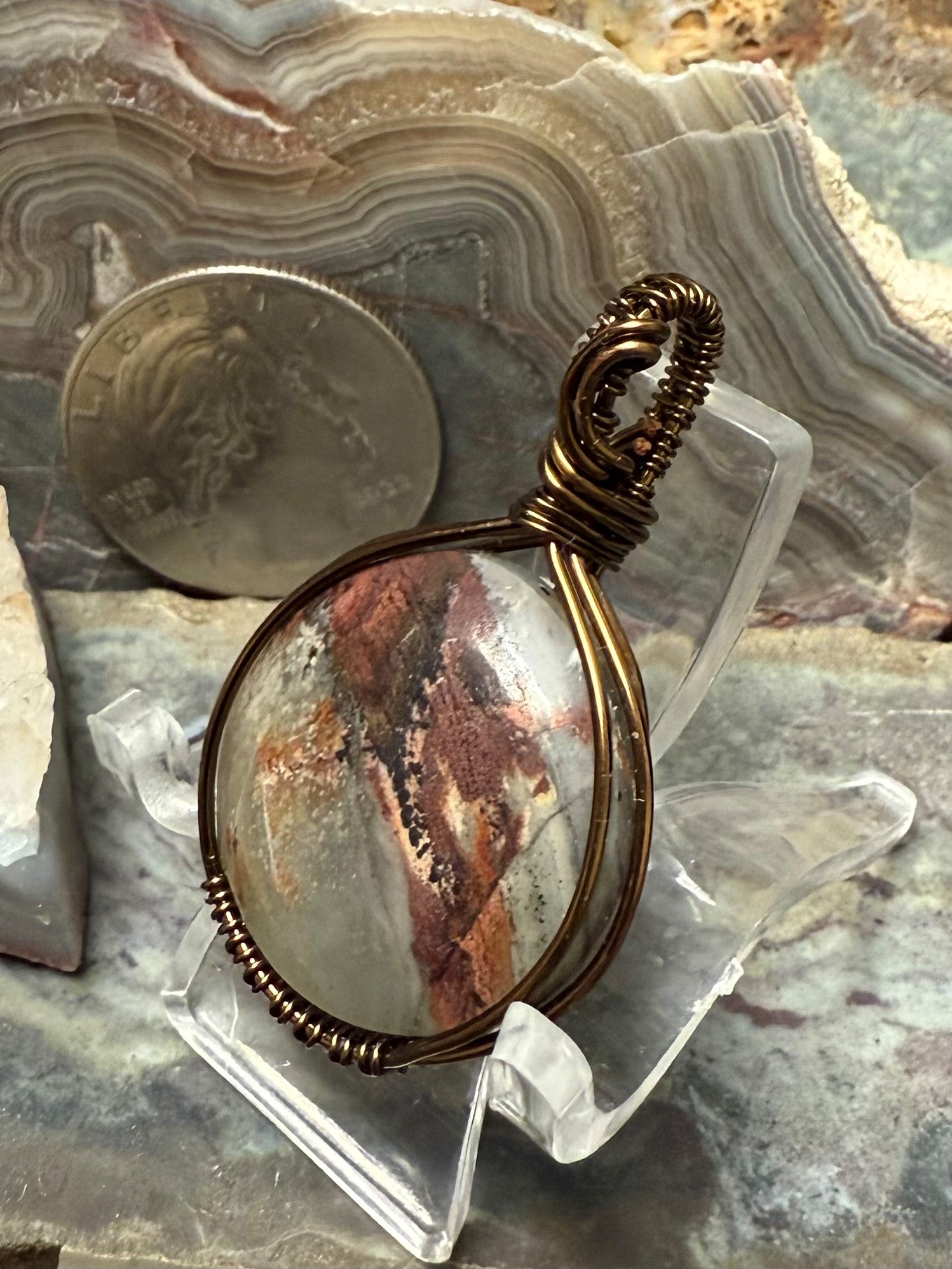 Von Hand geformter und polierter, natürlicher und wunderschöner grauer und brauner Kirschgarten-Jaspis. Dieser Anhänger ist mit einem antikfarbenen Kupferdraht umwickelt, der so konzipiert und beschichtet ist, dass er schneller Oxidation widersteht.