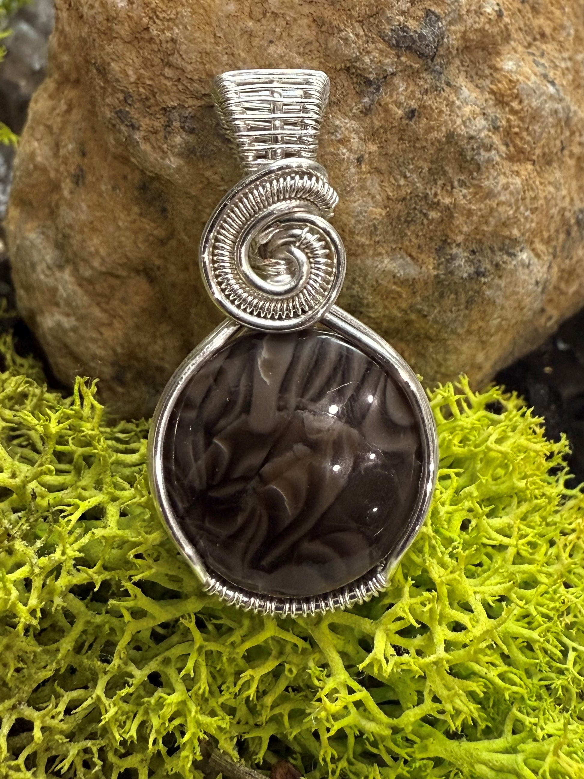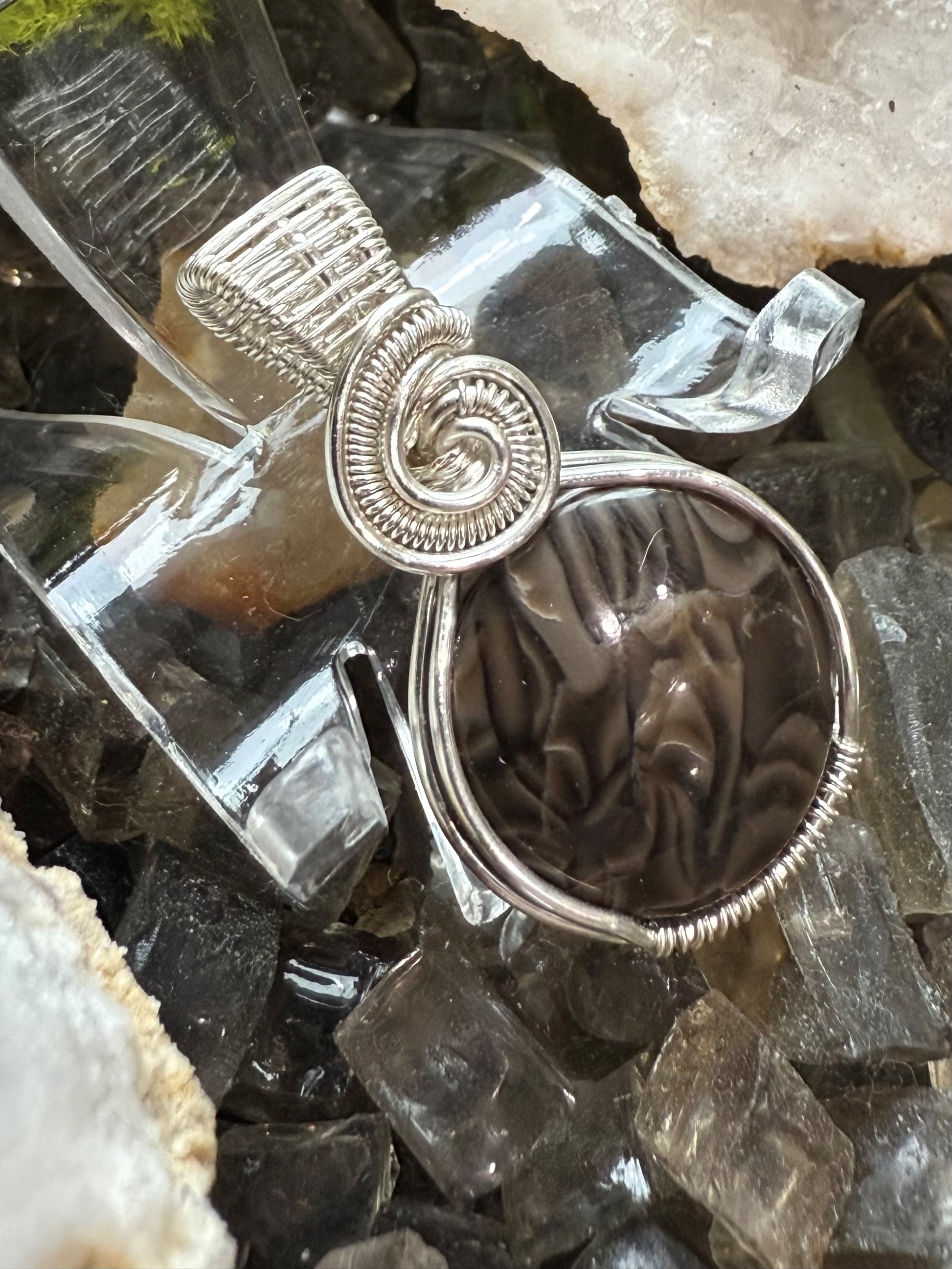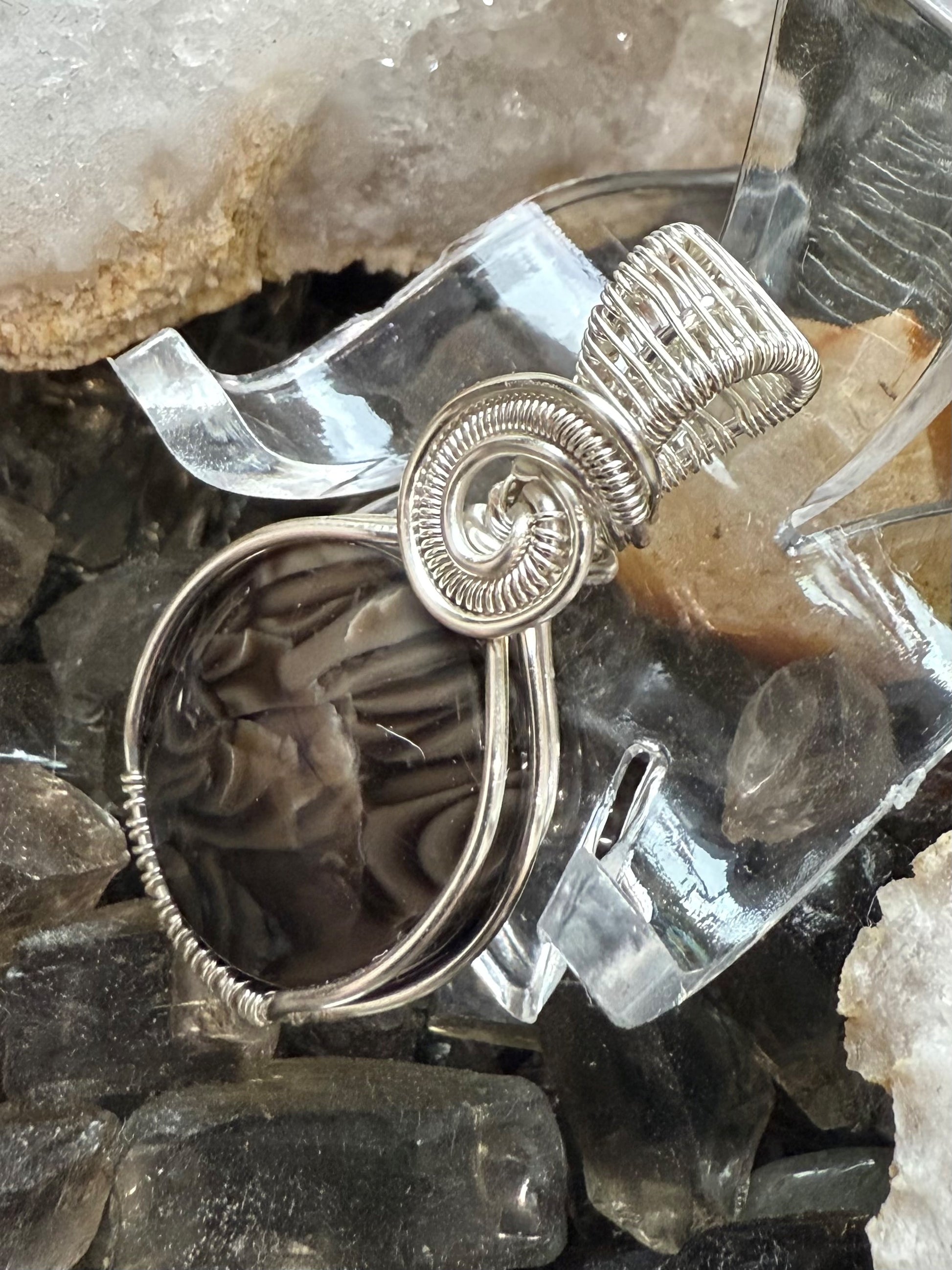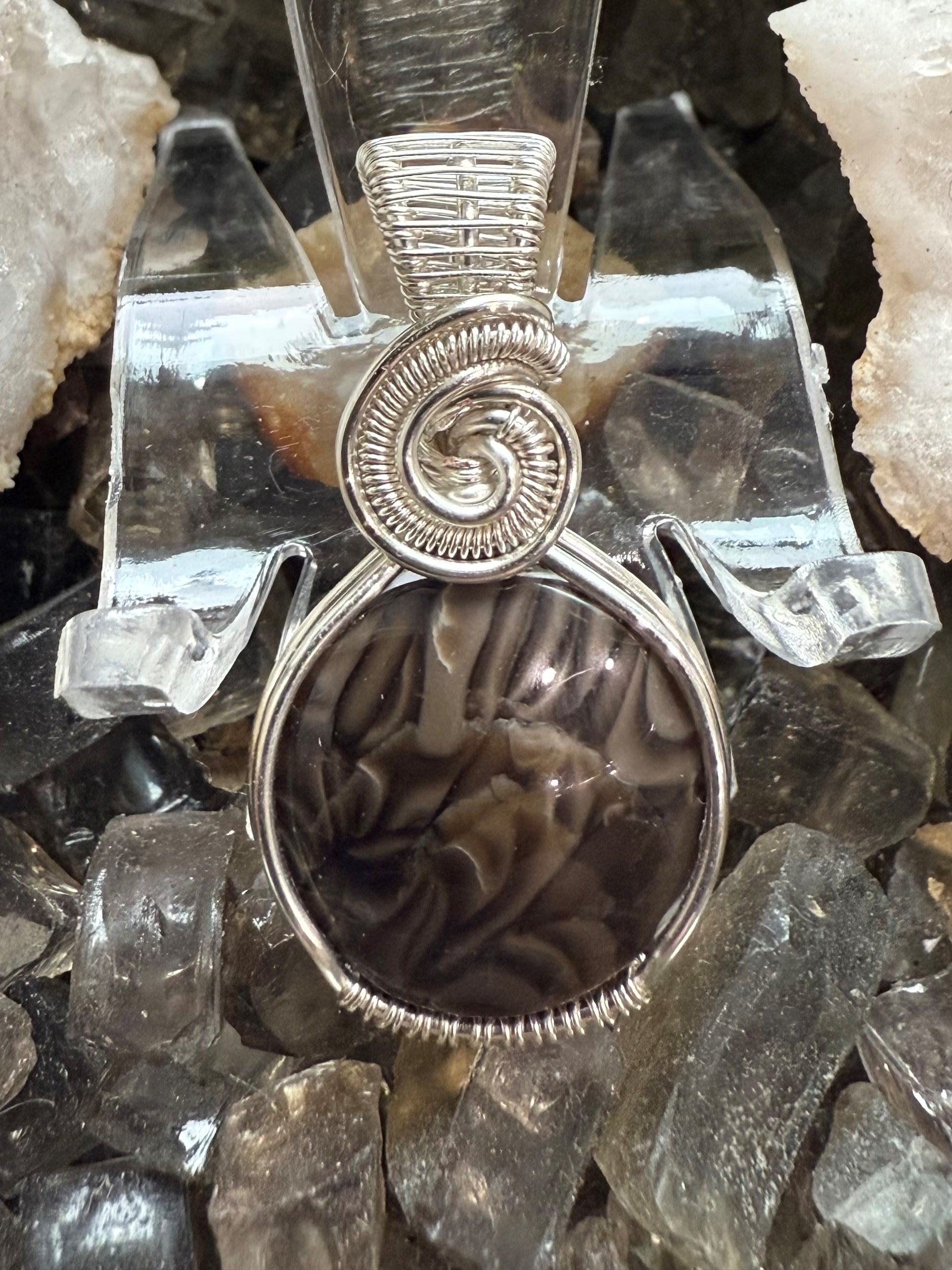 Handgeformter und polierter, natürlicher und wunderschöner brauner Schokoladenwirbel. Dieser Anhänger ist mit einem silberfarbenen Kupferdraht umwickelt, der so konzipiert und beschichtet ist, dass er einer schnellen Oxidation widersteht.