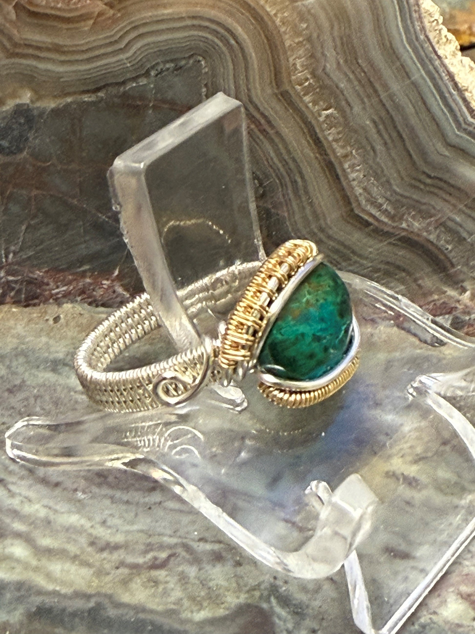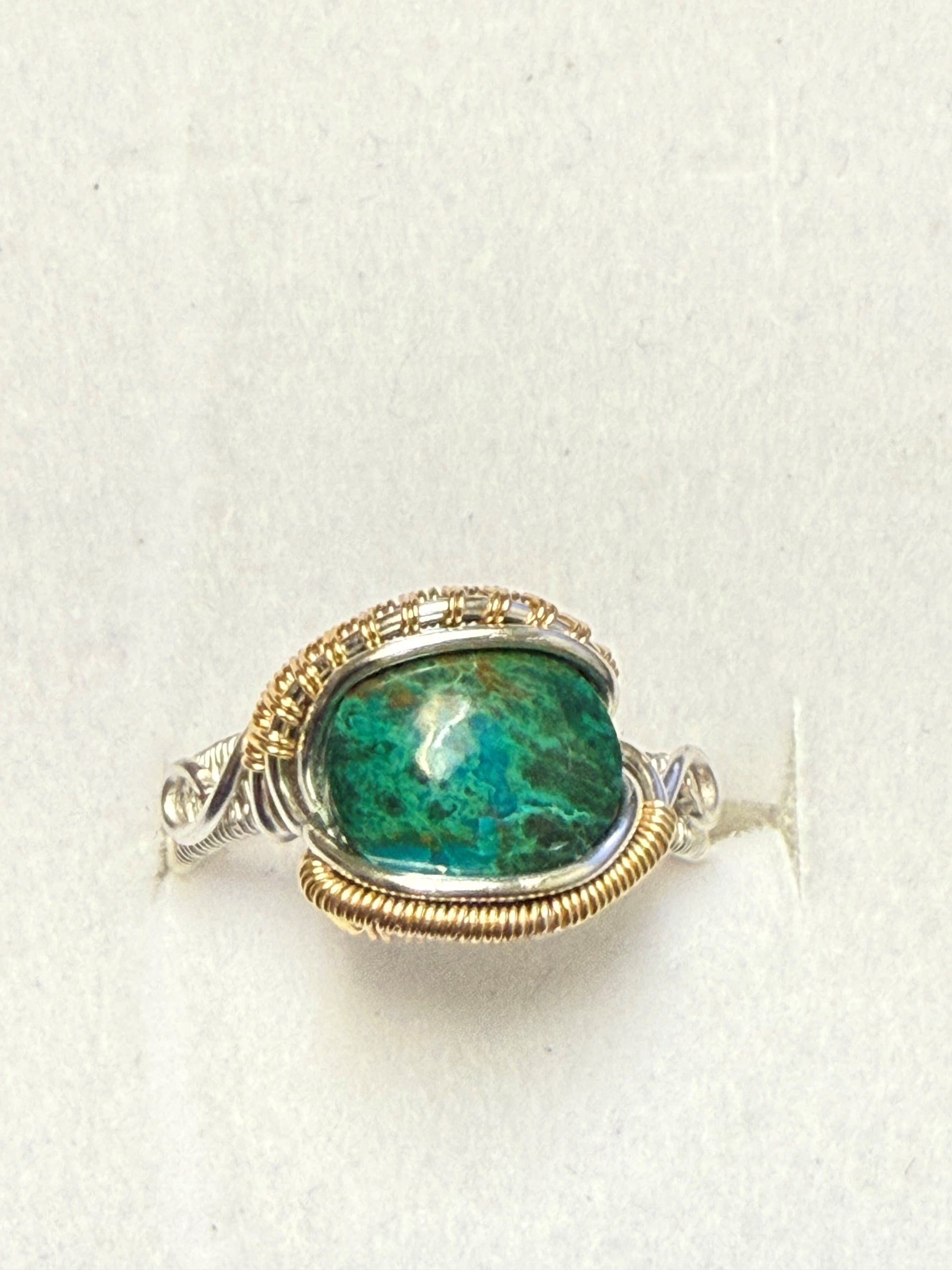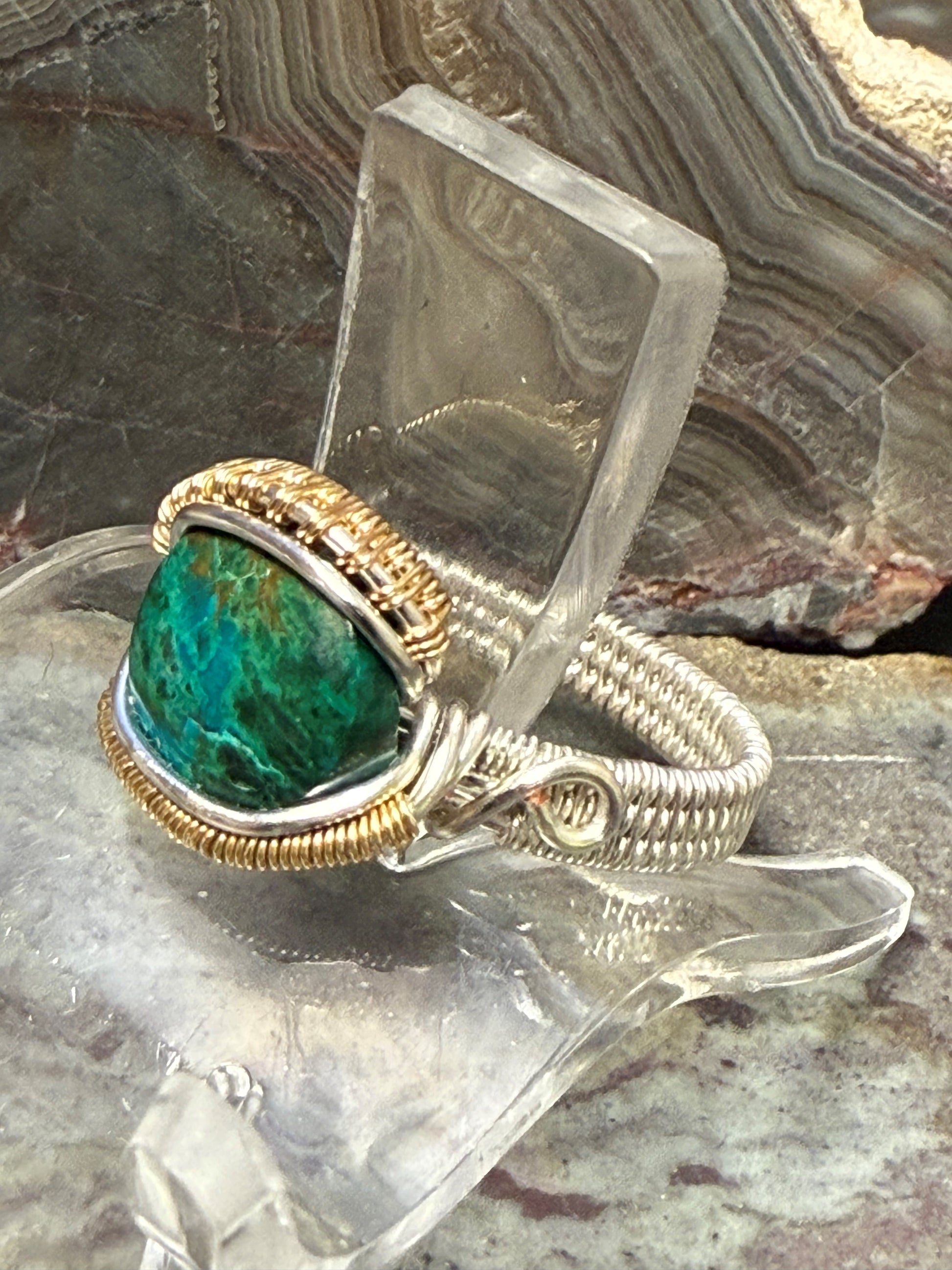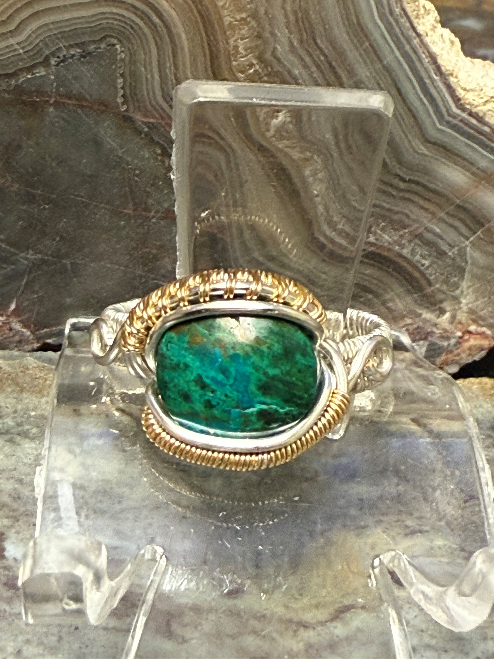 Wunderschöner, handgeformter und polierter Chrysokoll-Ring. Dieser Ring ist mit einem silber- und goldfarbenen Kupferdraht umwickelt, der so konzipiert und beschichtet ist, dass er schneller Oxidation widersteht.