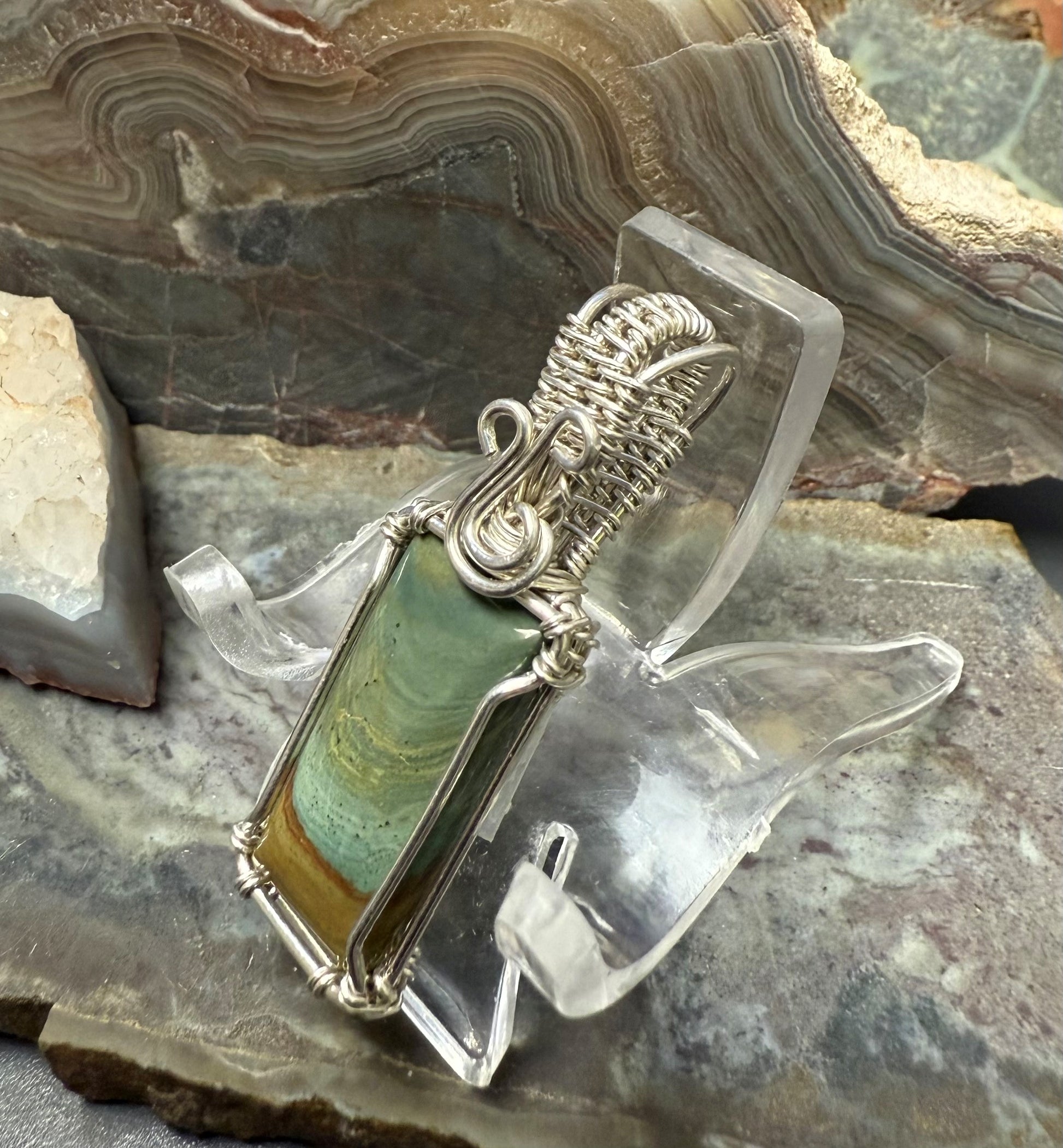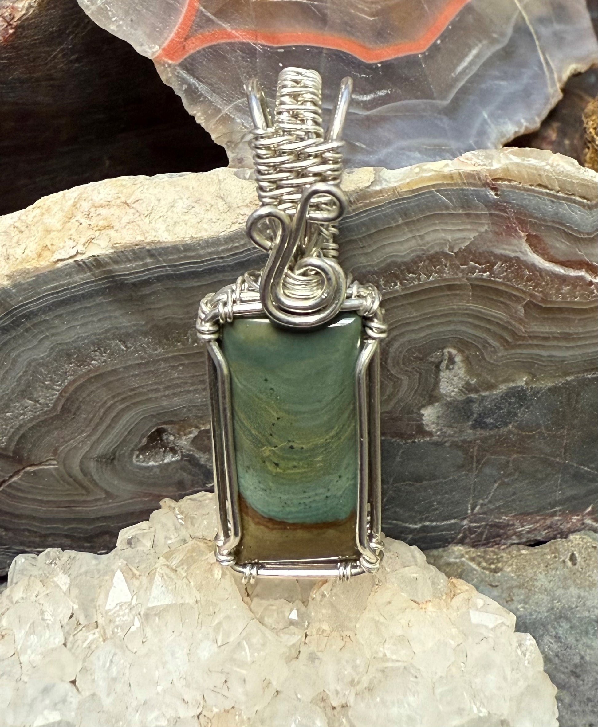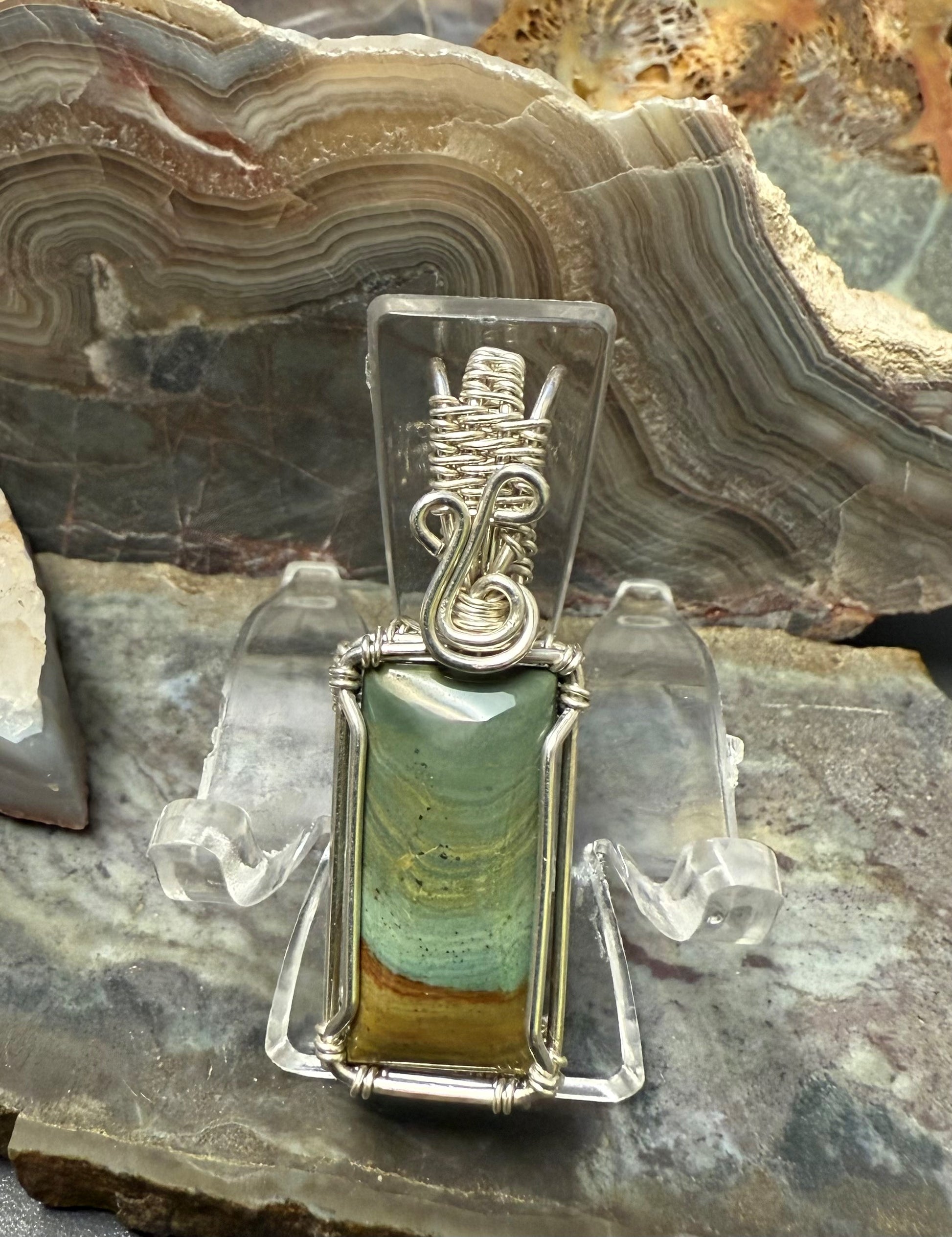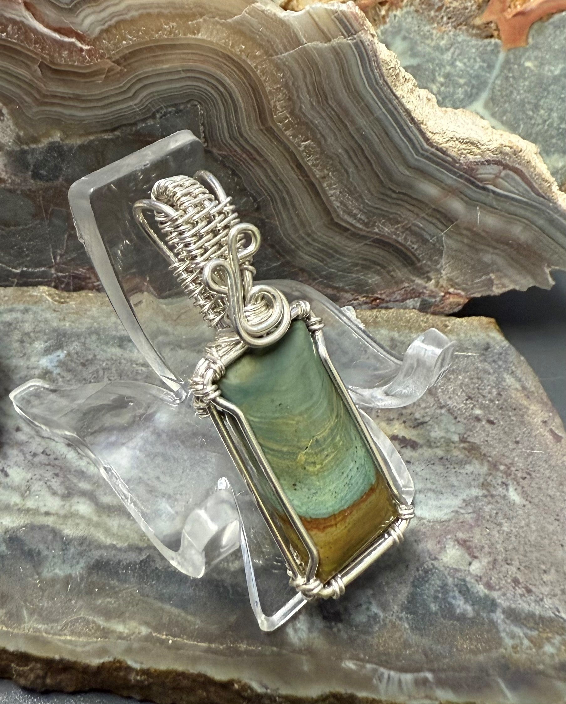 Von Hand geformt und poliert, natürlich und wunderschön, Freedom Jasper. Dieser Anhänger ist mit einem silberfarbenen Kupferdraht umwickelt, der so konzipiert und beschichtet ist, dass er schneller Oxidation widersteht.