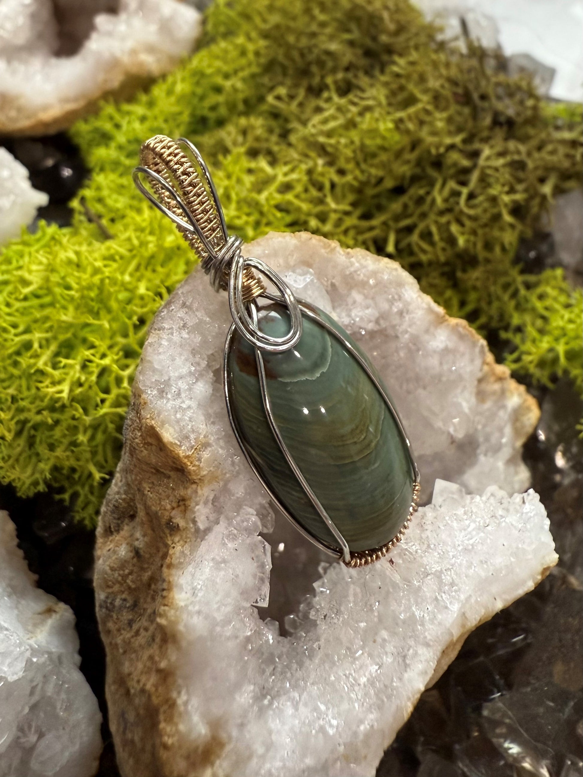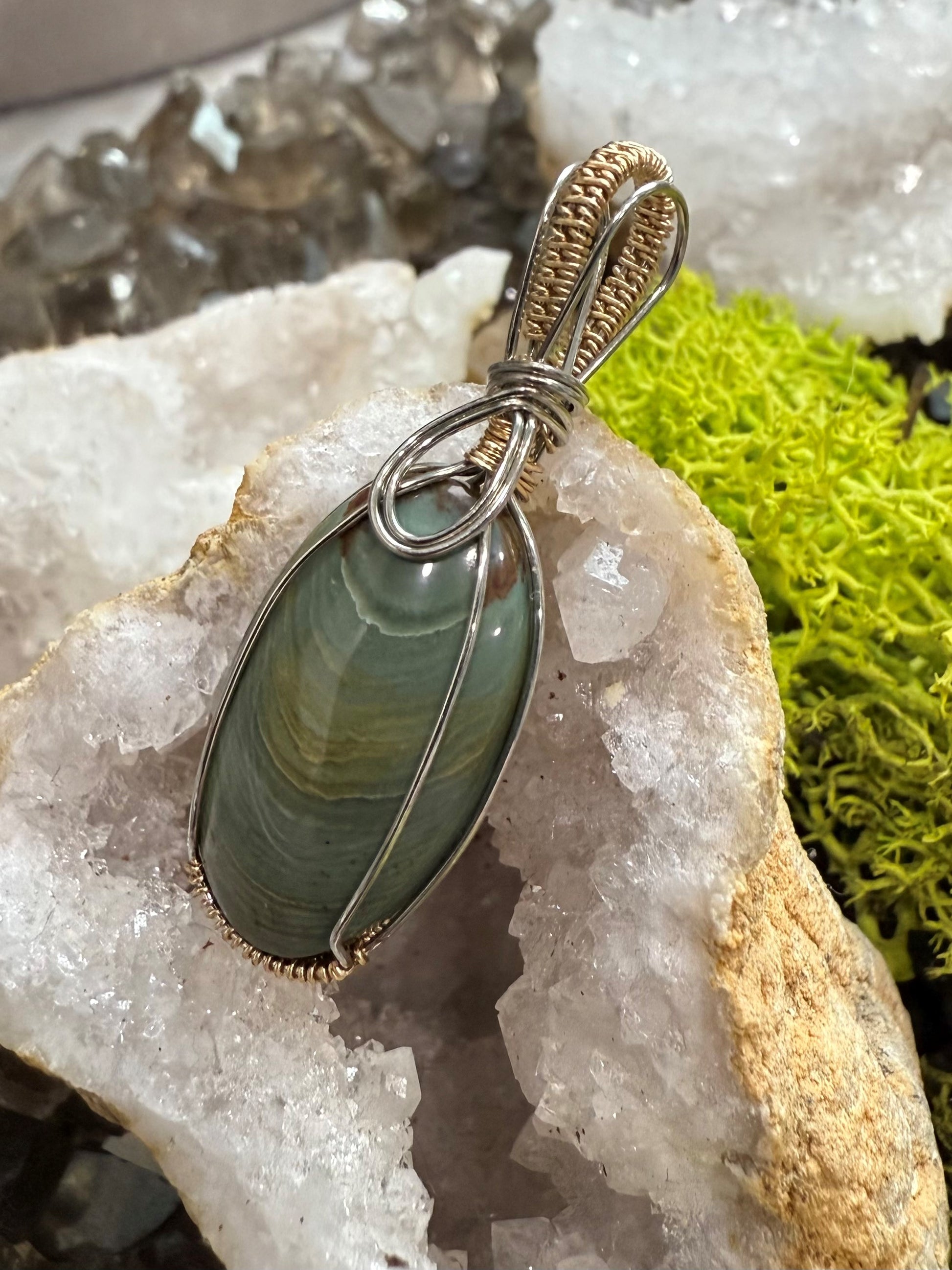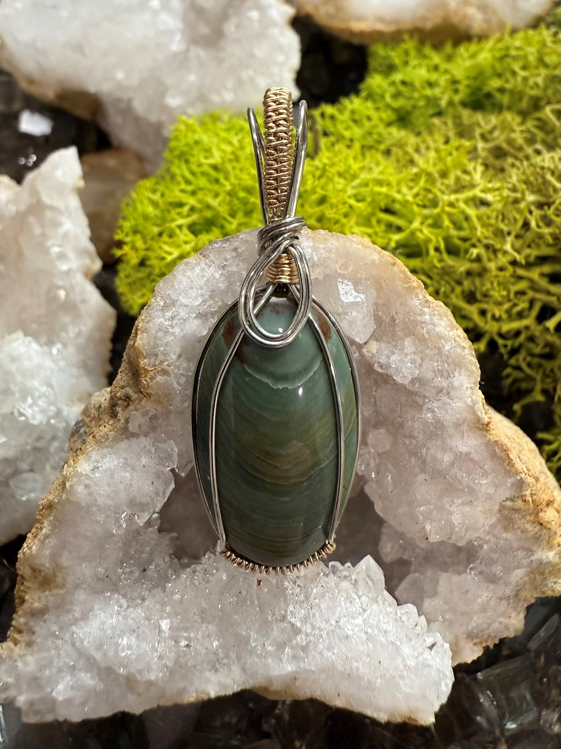 Von Hand geformter und polierter, natürlicher und wunderschöner grüner Freedom Jasper. Dieser Anhänger ist mit einem silber- und goldfarbenen Kupferdraht umwickelt, der so konzipiert und beschichtet ist, dass er schneller Oxidation widersteht.