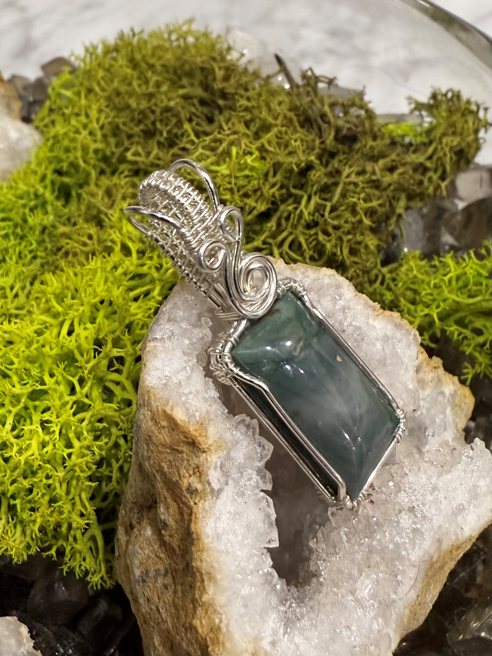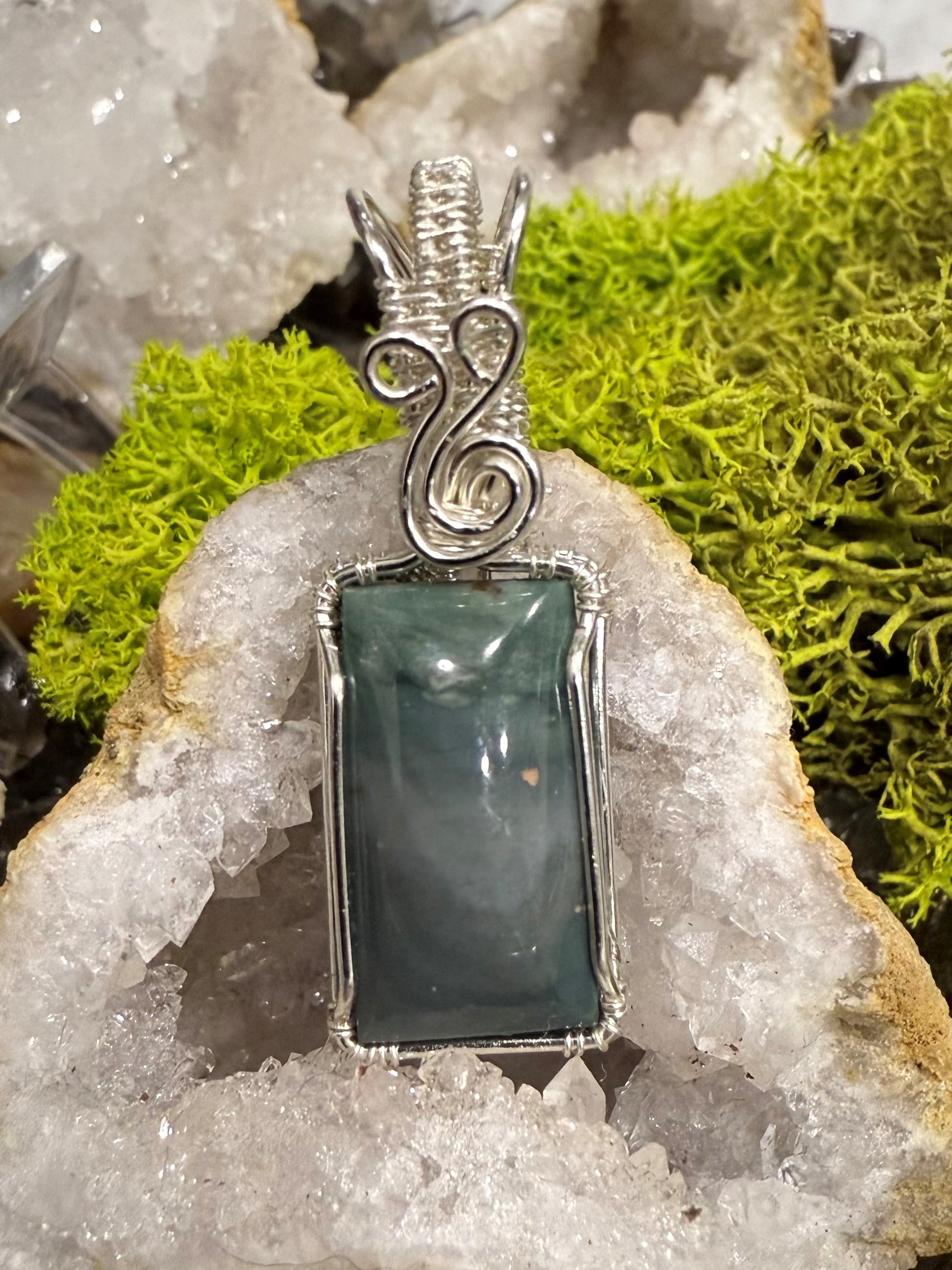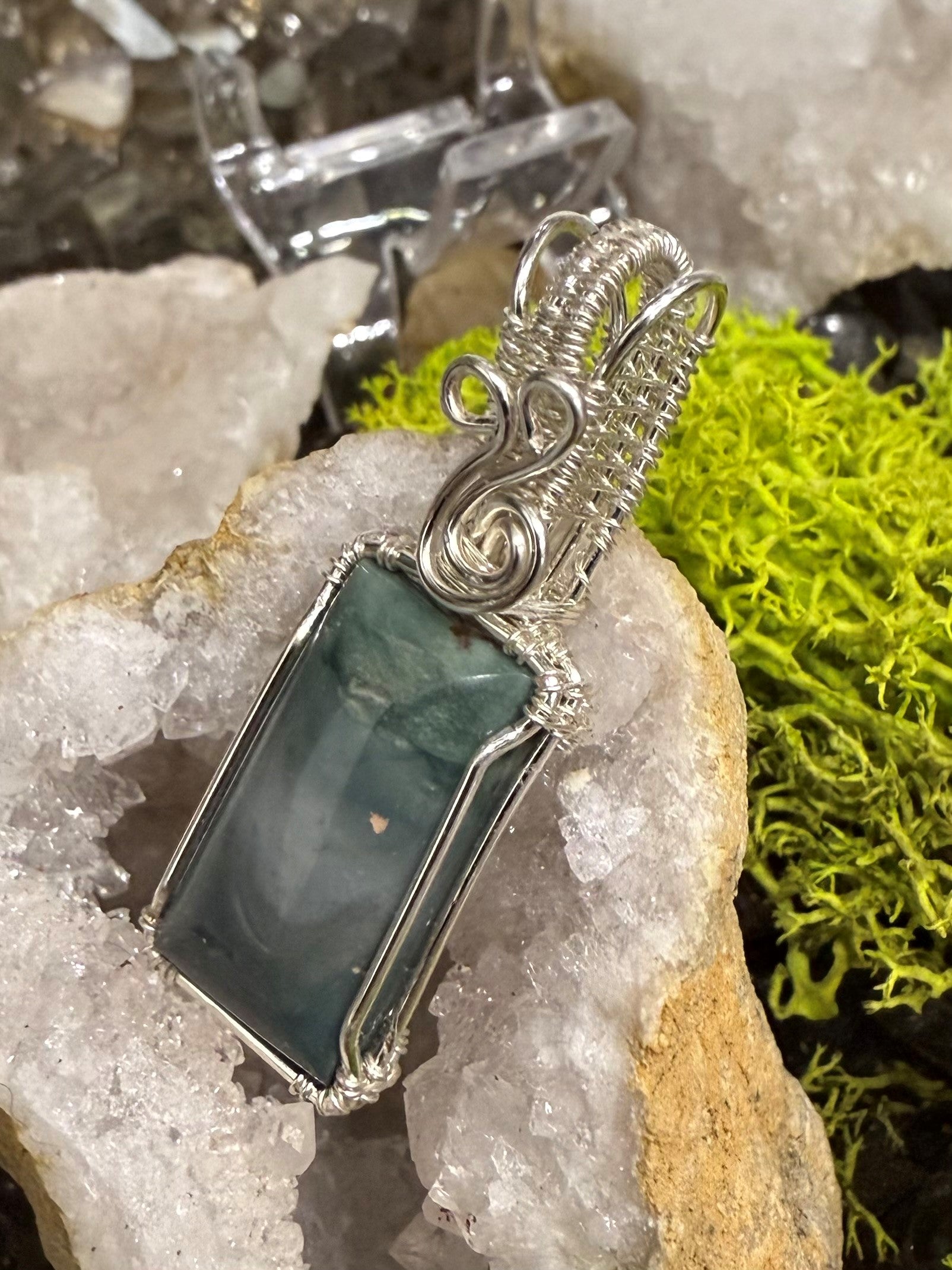 Handgeformt und poliert, natürlich und schön, grün, Freedom Jasper. Dieser Anhänger ist mit einem silberfarbenen Kupferdraht umwickelt, der so konzipiert und beschichtet ist, dass er schneller Oxidation widersteht.
