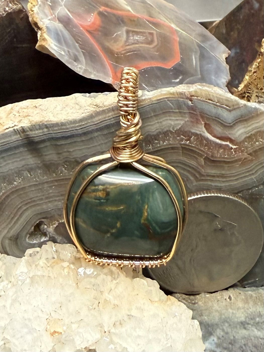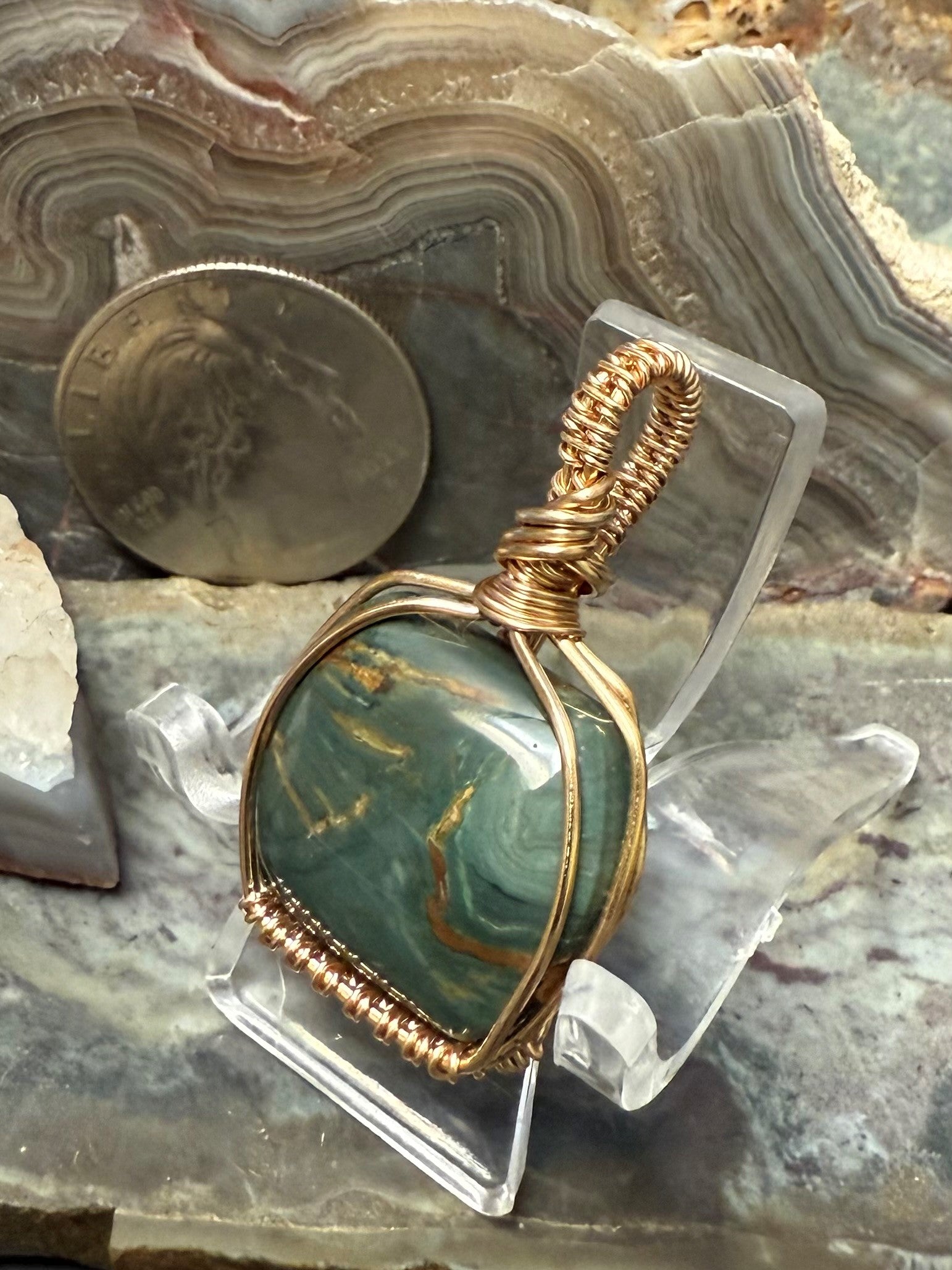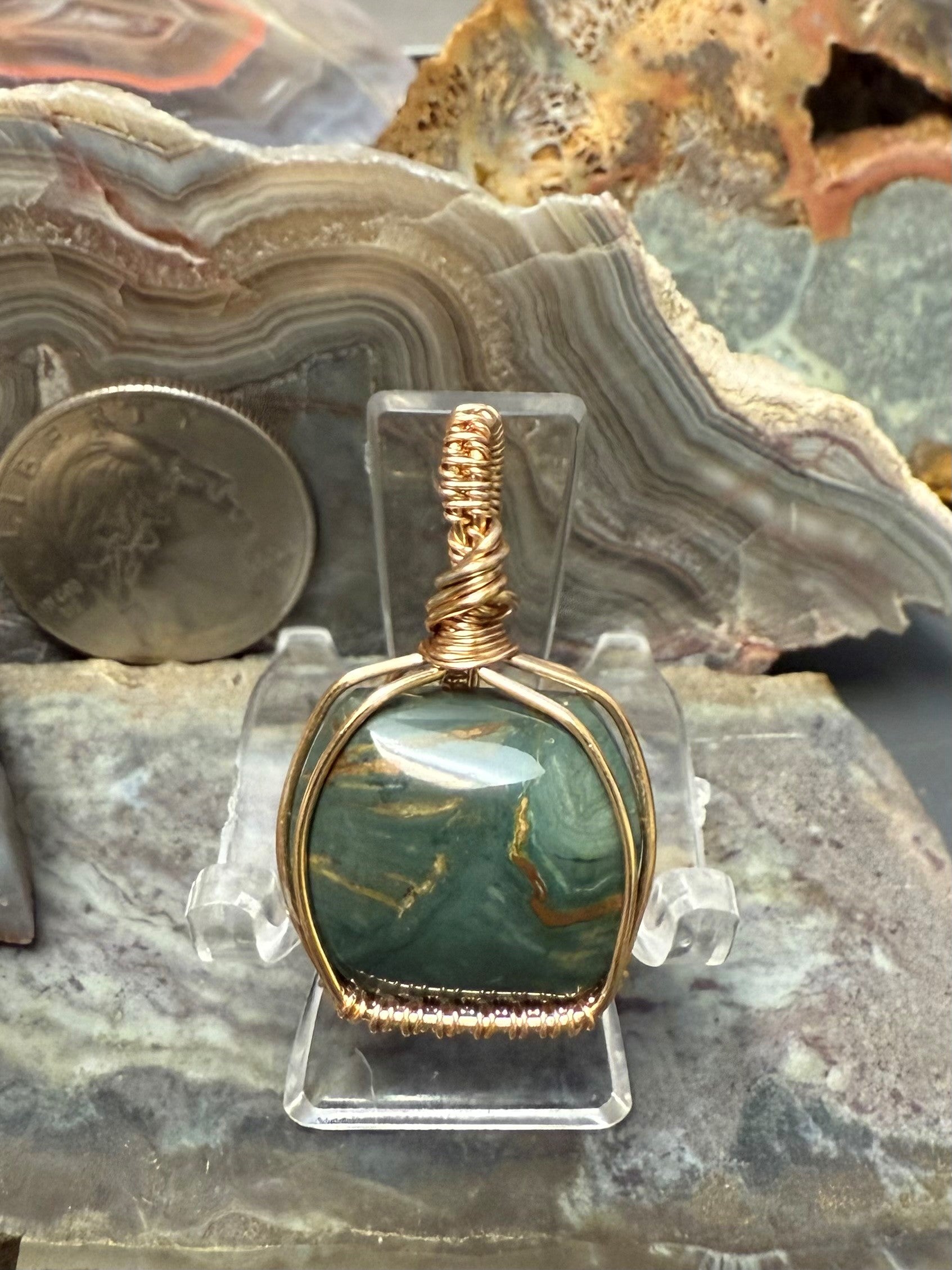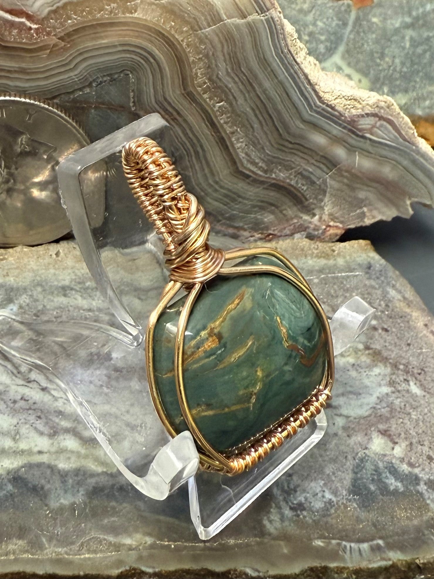 Von Hand geformter und polierter, natürlicher und wunderschöner grüner Freedom Jasper. Dieser Anhänger ist mit einem goldfarbenen Kupferdraht umwickelt, der so konzipiert und beschichtet ist, dass er schneller Oxidation widersteht.