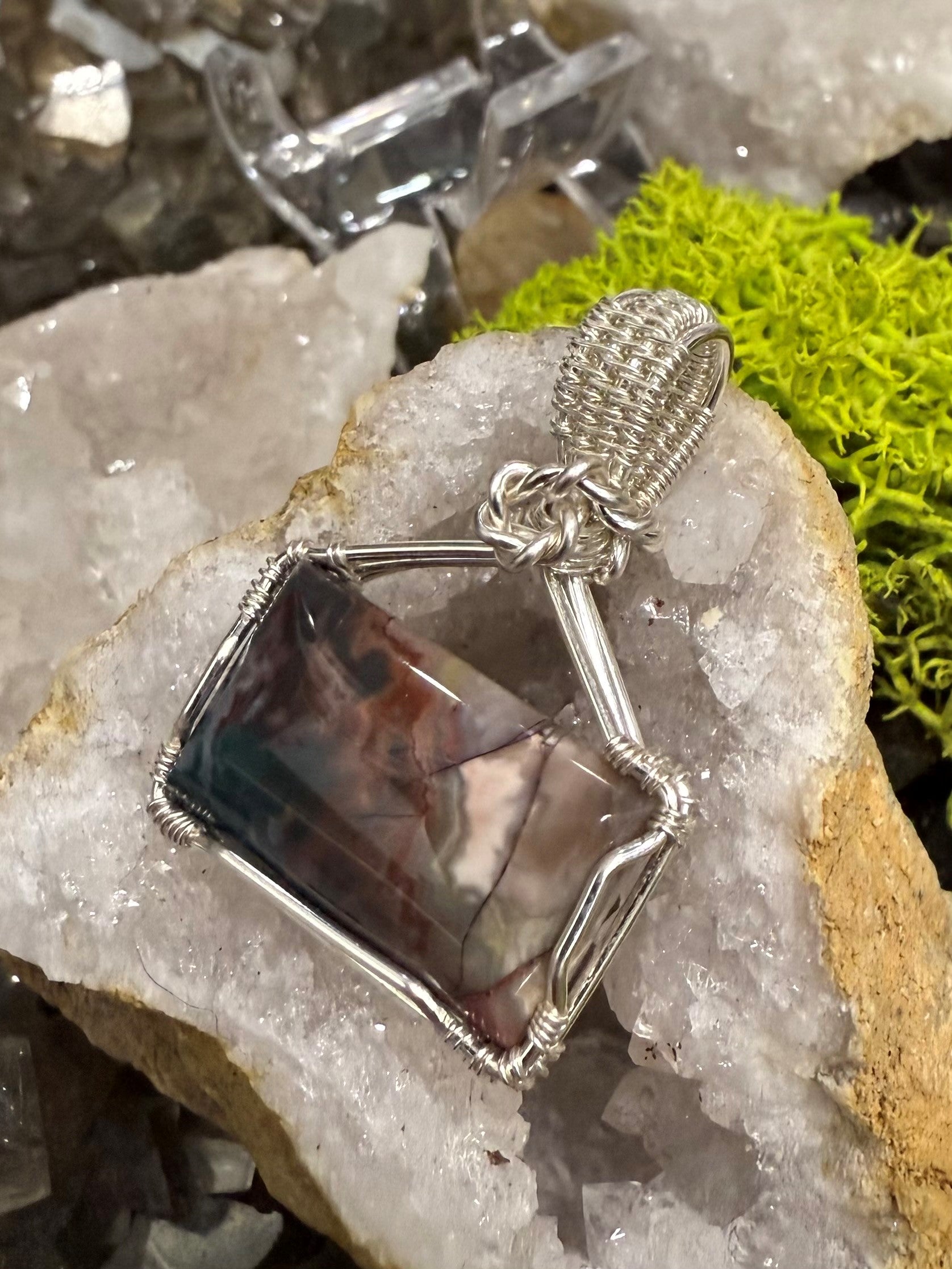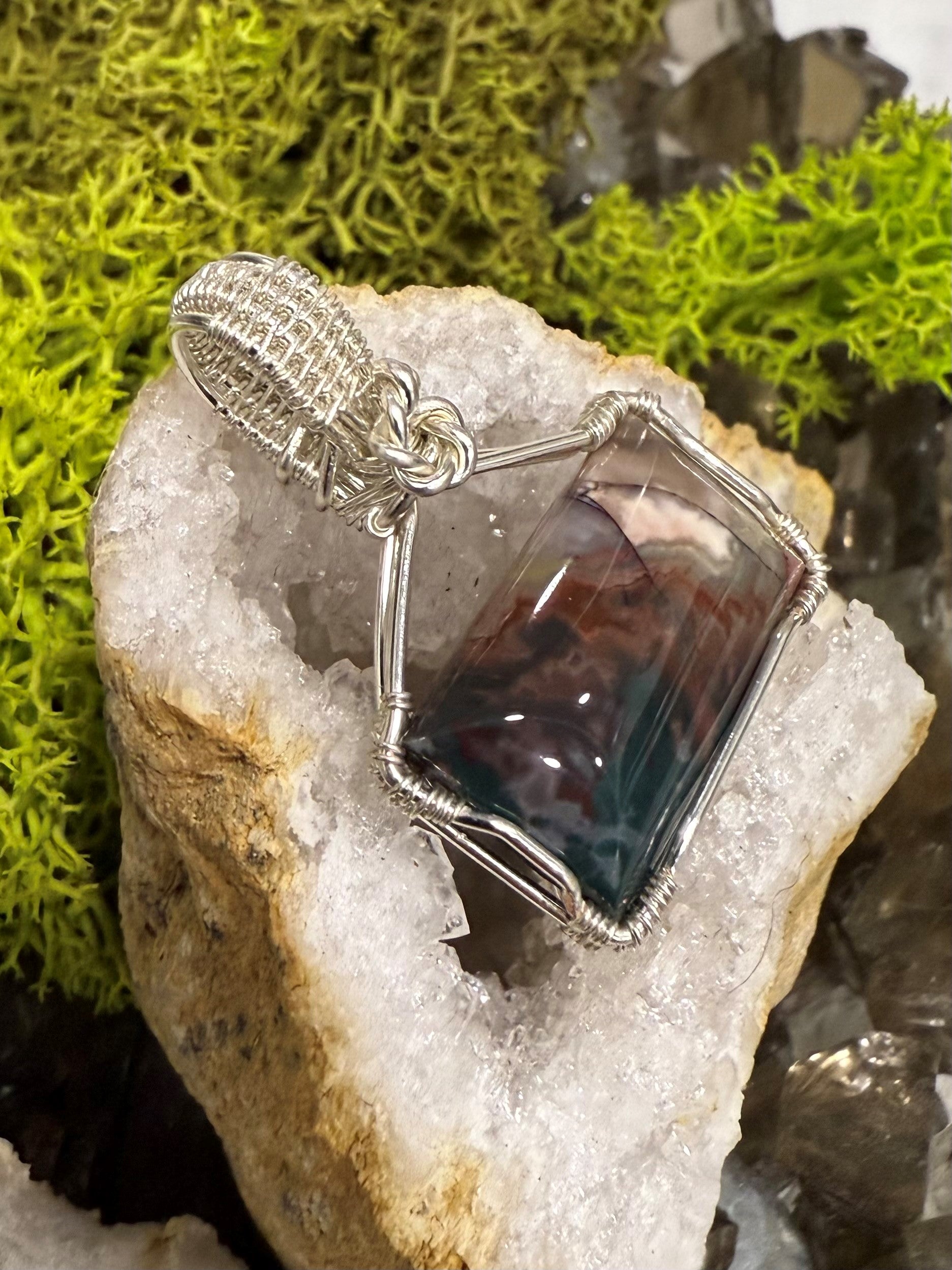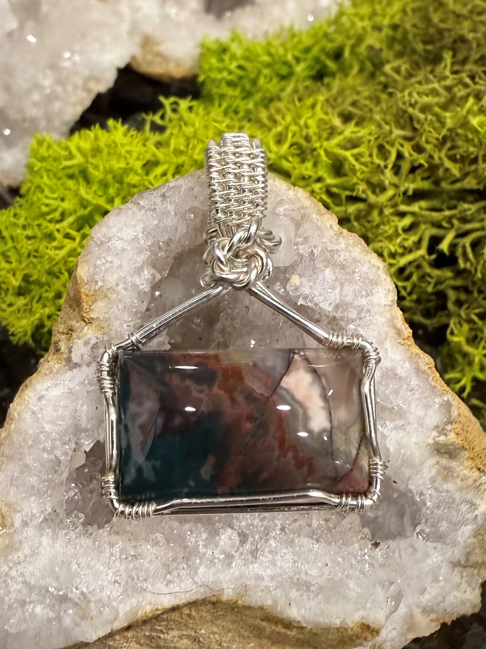 Von Hand geformt und poliert, natürlich und wunderschön, Idaho Sunset Jasper. Dieser Anhänger ist mit einem silberfarbenen Kupferdraht umwickelt, der so konzipiert und beschichtet ist, dass er schneller Oxidation widersteht.