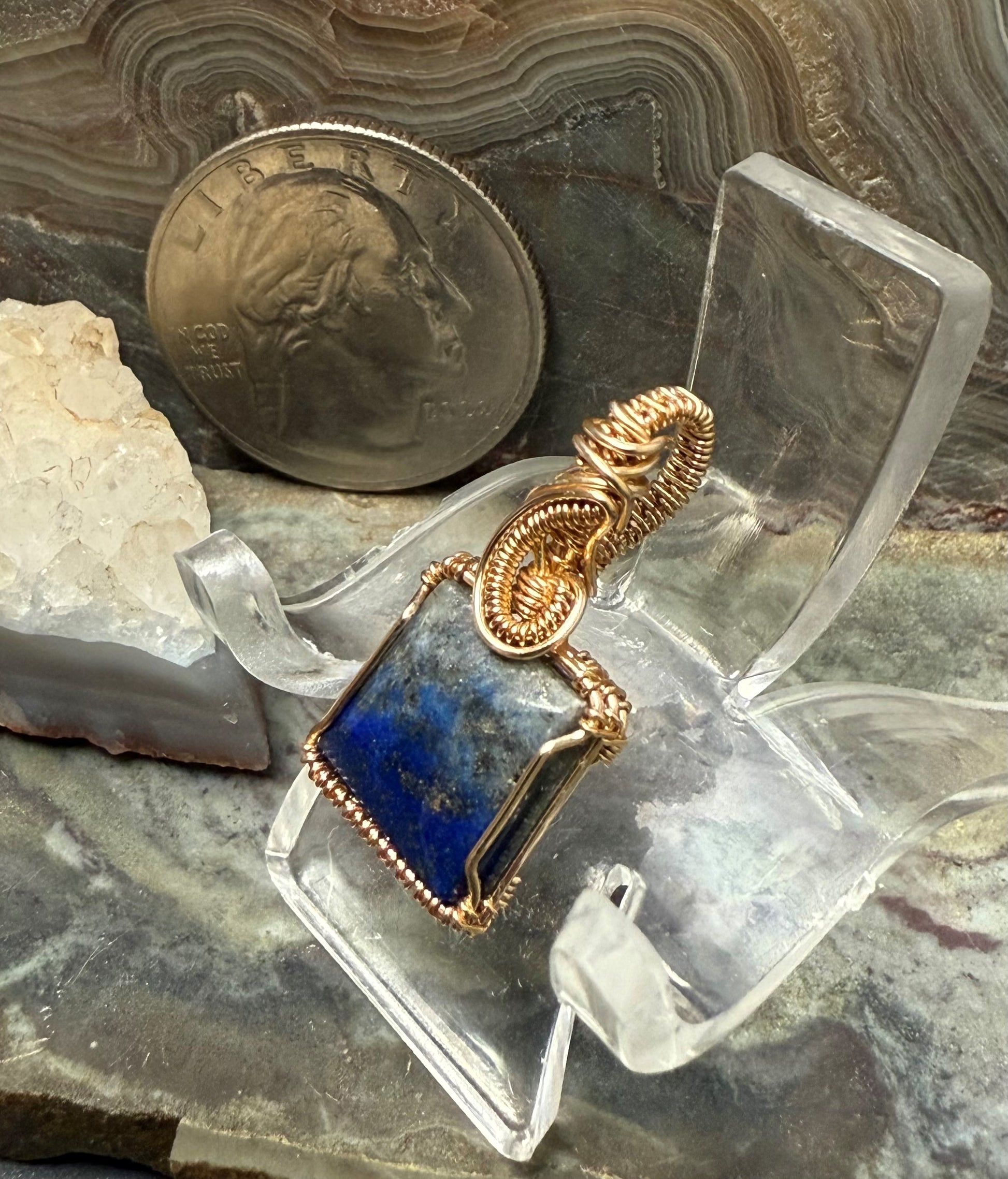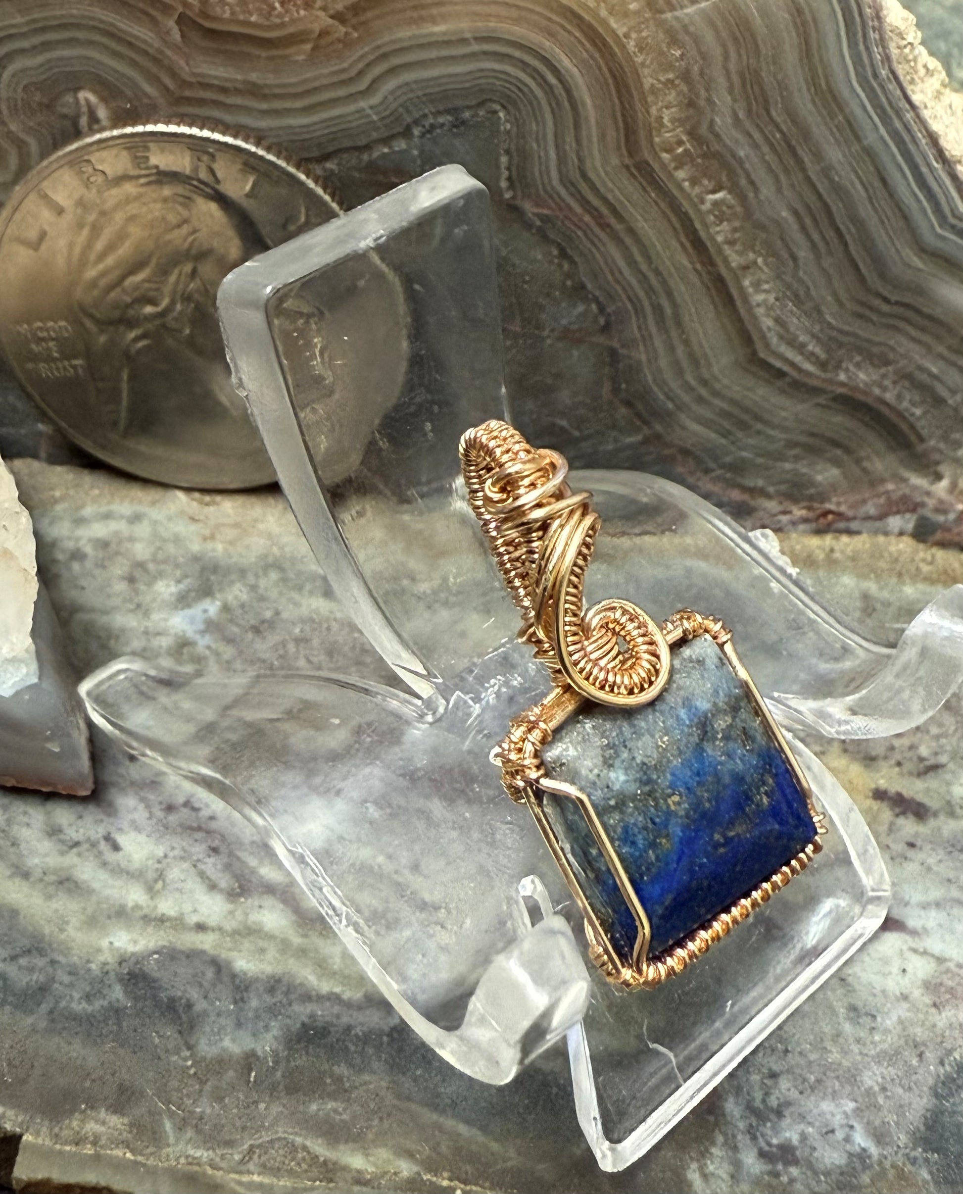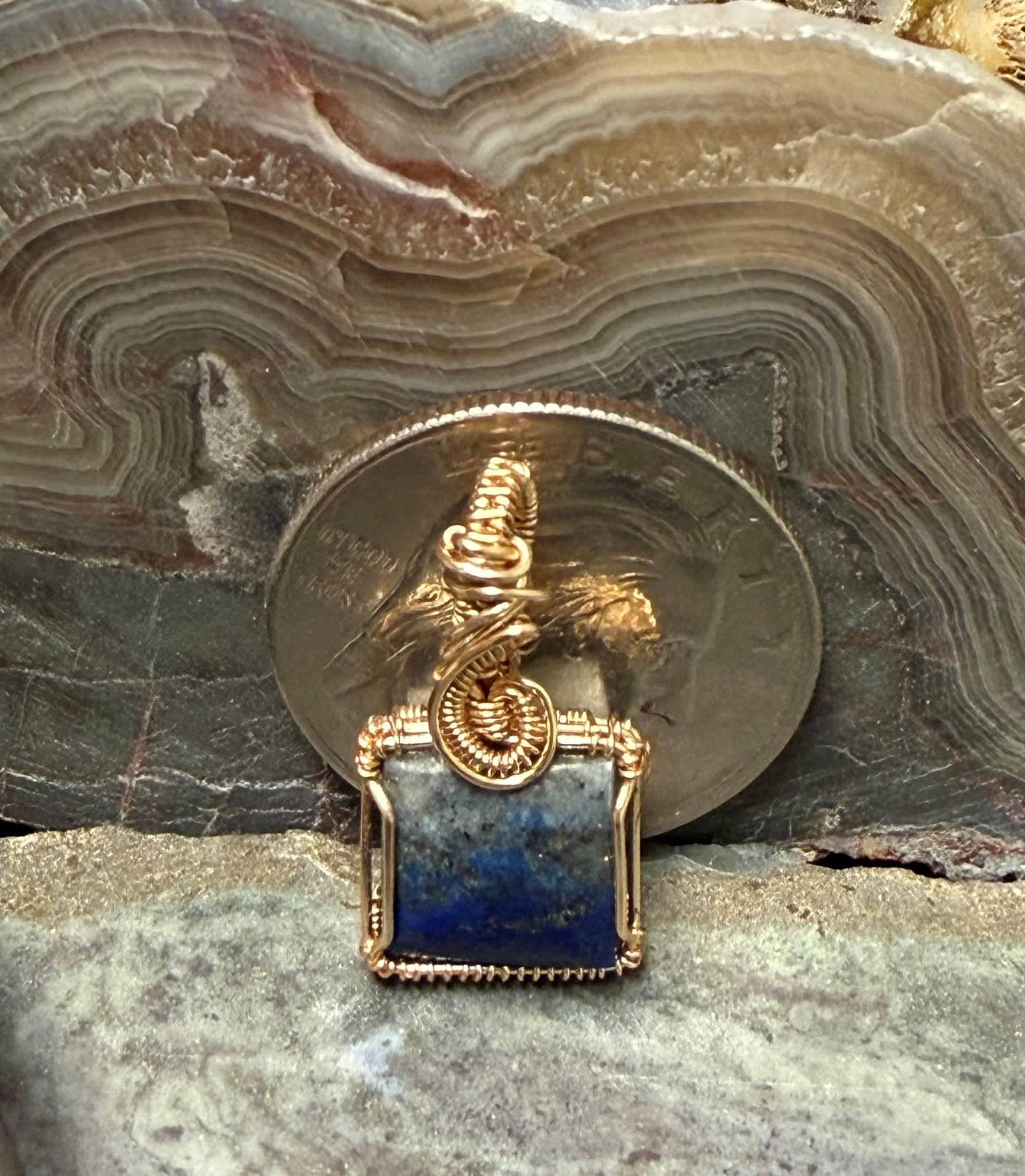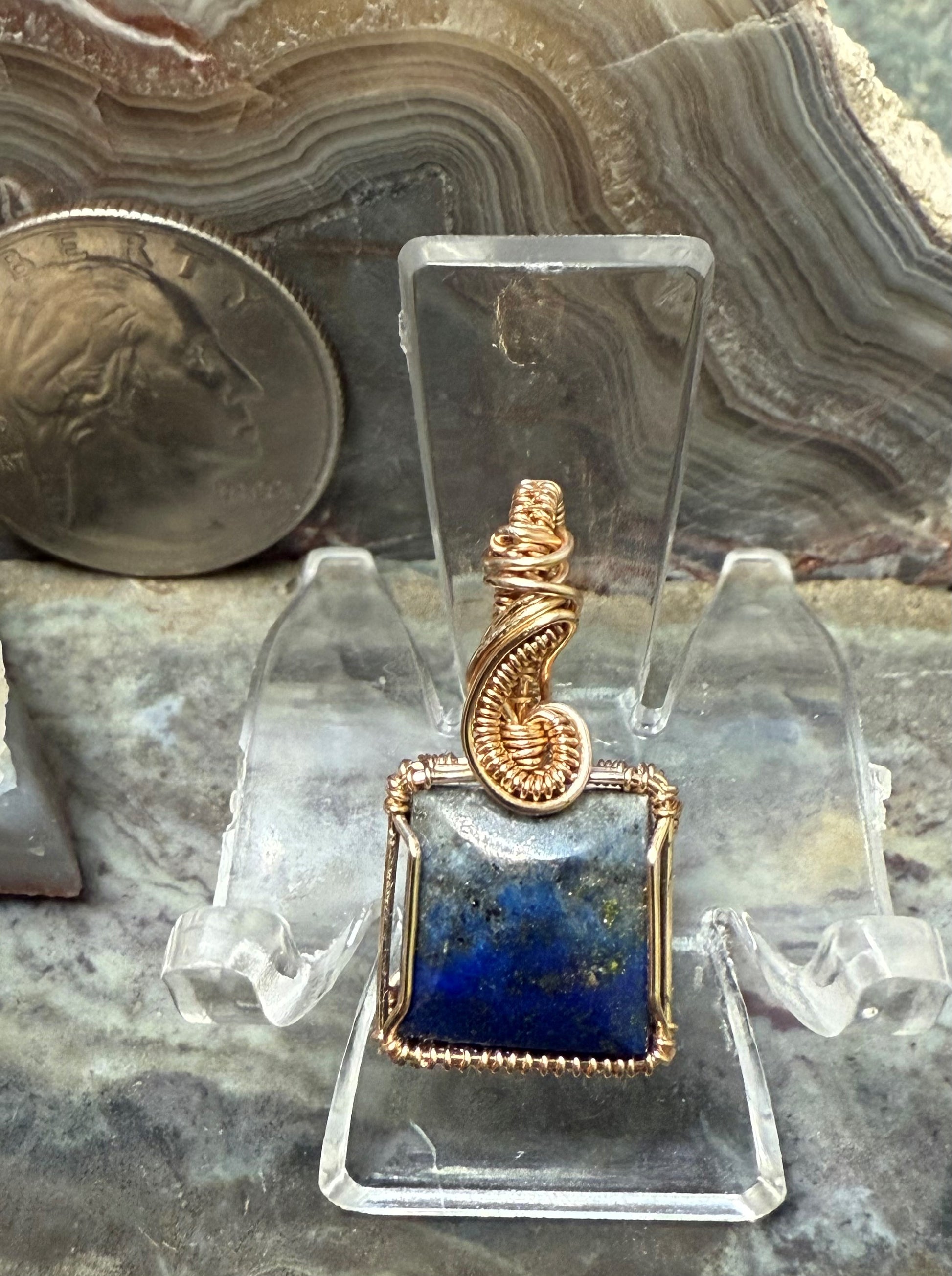 Wunderschöner blauer Lapislazuli, handgeformt und poliert. Dieser Anhänger ist mit einem goldfarbenen Kupferdraht umwickelt, der so konzipiert und beschichtet ist, dass er schneller Oxidation widersteht. Dies ist ein sehr kleiner Anhänger, ein Mini-Anhänger mit einer Gesamthöhe von etwa 7/8 Zoll.