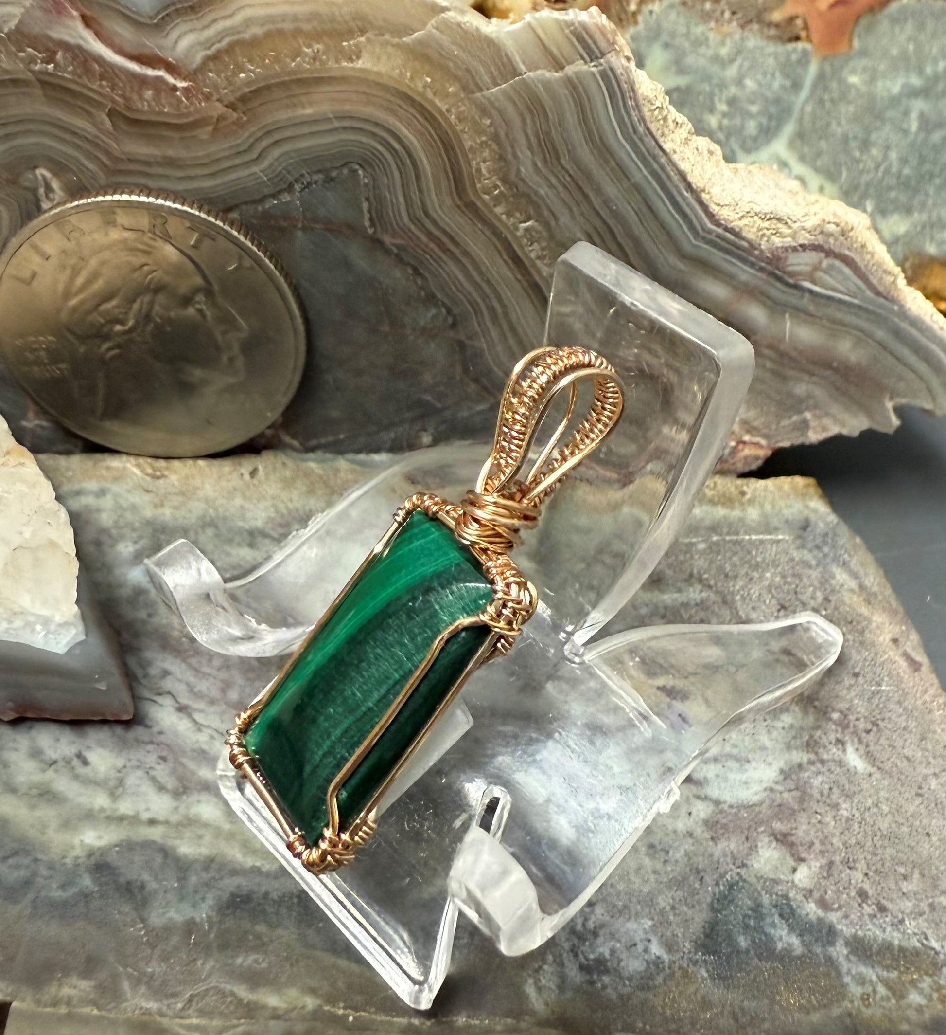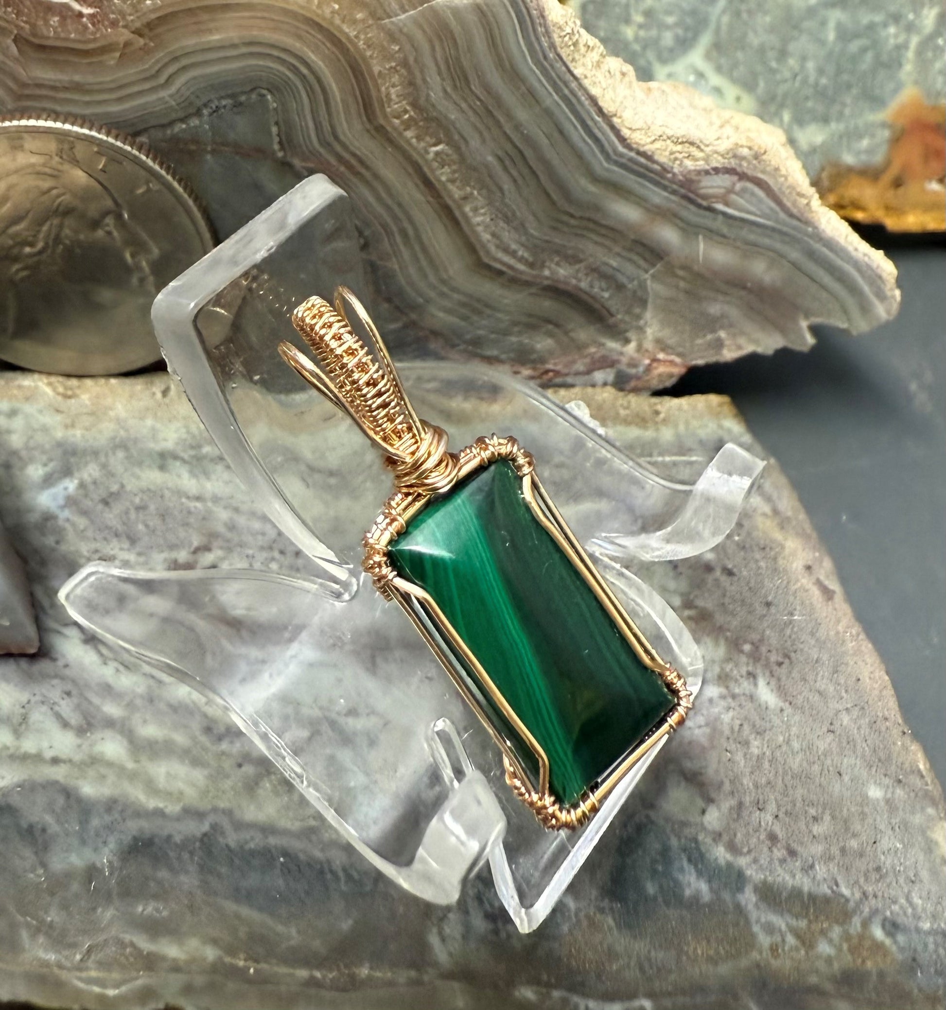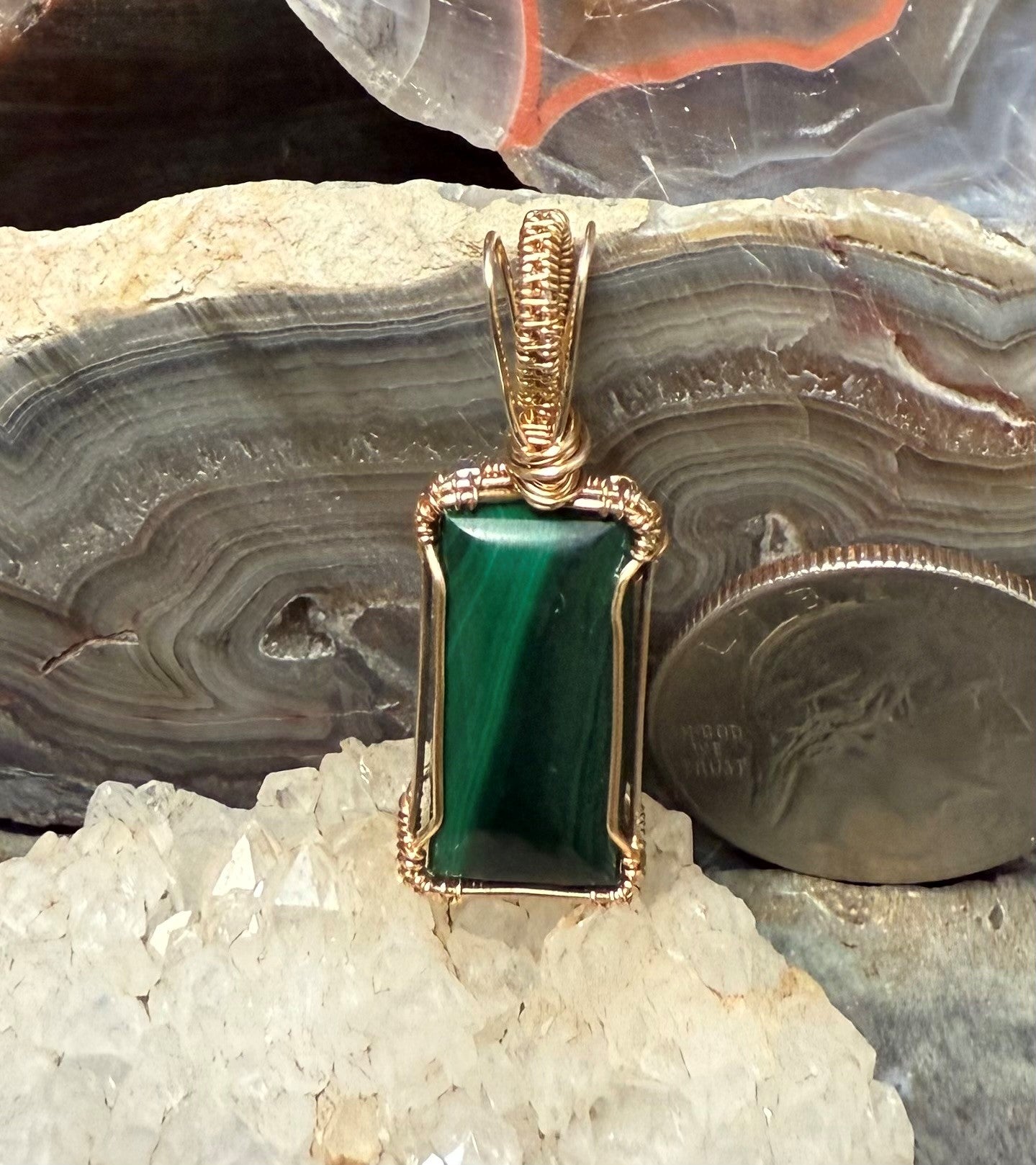 Mit Draht umwickelte Steine ​​und mit Draht umwickelte Anhänger gibt es schon seit Tausenden von Jahren. Wir sind stolz darauf, diese Tradition fortzuführen und die Edelsteinschleiferei in den Mittelpunkt zu stellen. Wir kombinieren die Farbe des Kupferdrahts mit dem Farbton des Steins, um einen wunderschönen und einzigartigen Anhänger herzustellen, den Sie stolz als Halskette tragen können.
