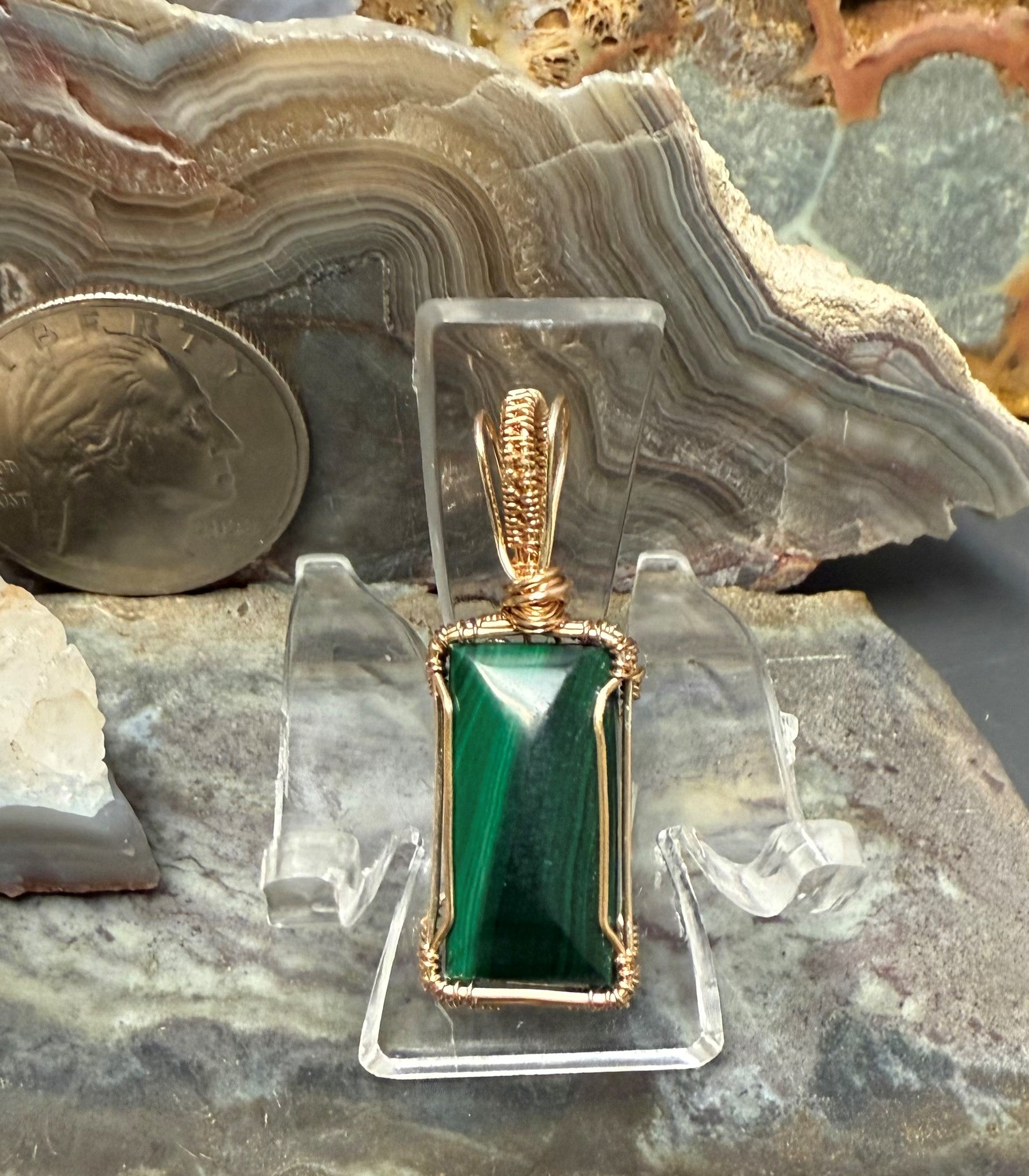 Handgeformter und polierter, wunderschöner grüner Malachit. Dieser Anhänger ist mit einem goldfarbenen Kupferdraht umwickelt, der so konzipiert und beschichtet ist, dass er schneller Oxidation widersteht. Dies ist ein sehr kleiner Anhänger, ein Mini-Anhänger mit einer Gesamthöhe von etwa 3,2 cm.