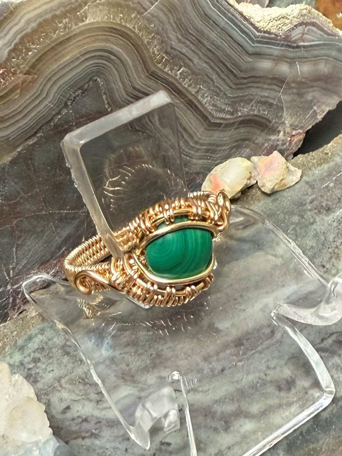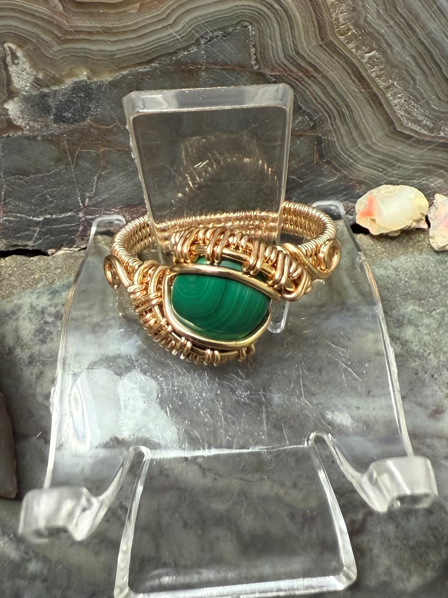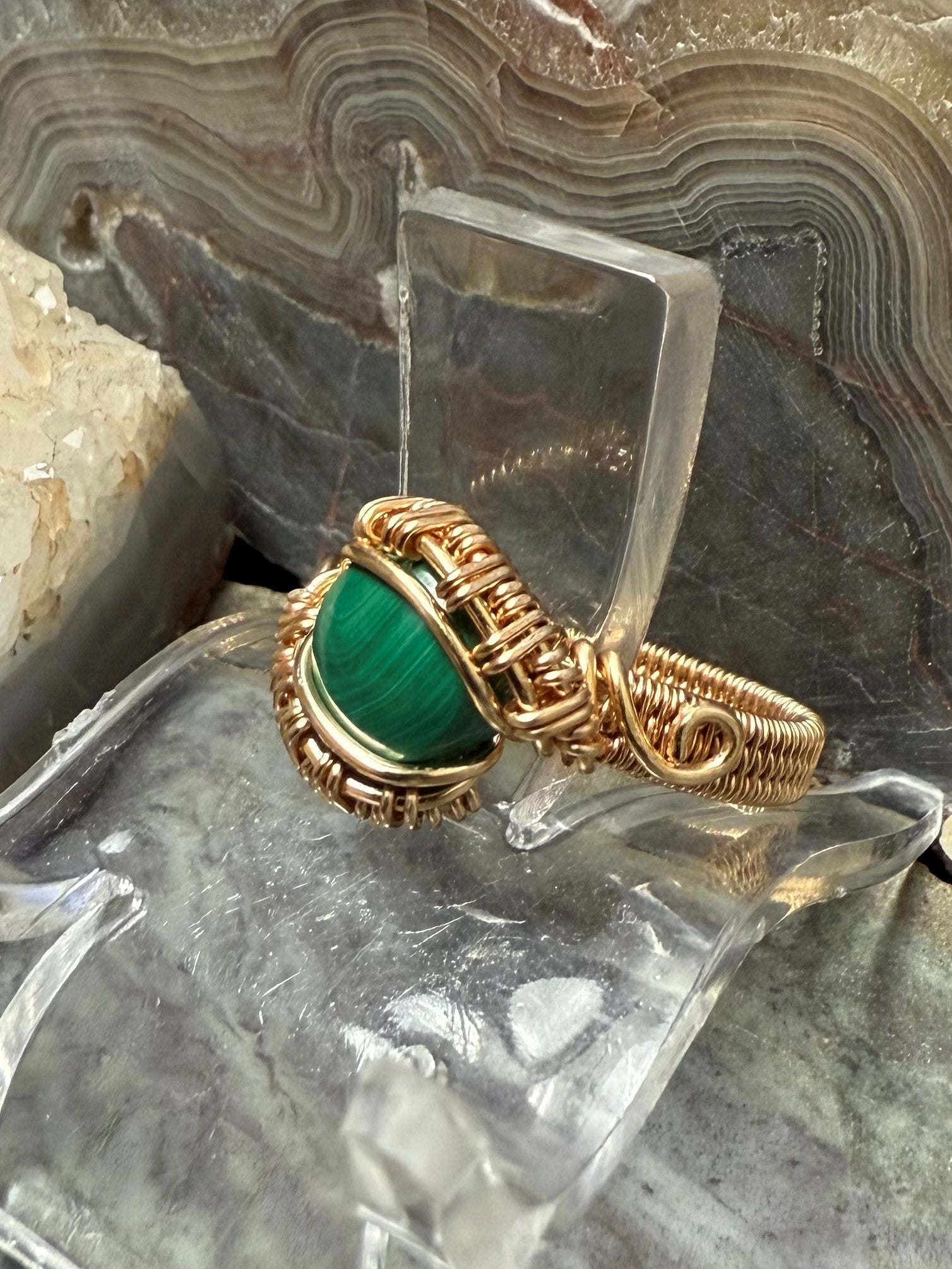 Von Hand geformter und polierter, natürlicher und wunderschöner grüner Malachit. Dieser Ring ist mit einem goldfarbenen Kupferdraht umwickelt, der so konzipiert und beschichtet ist, dass er schneller Oxidation widersteht.