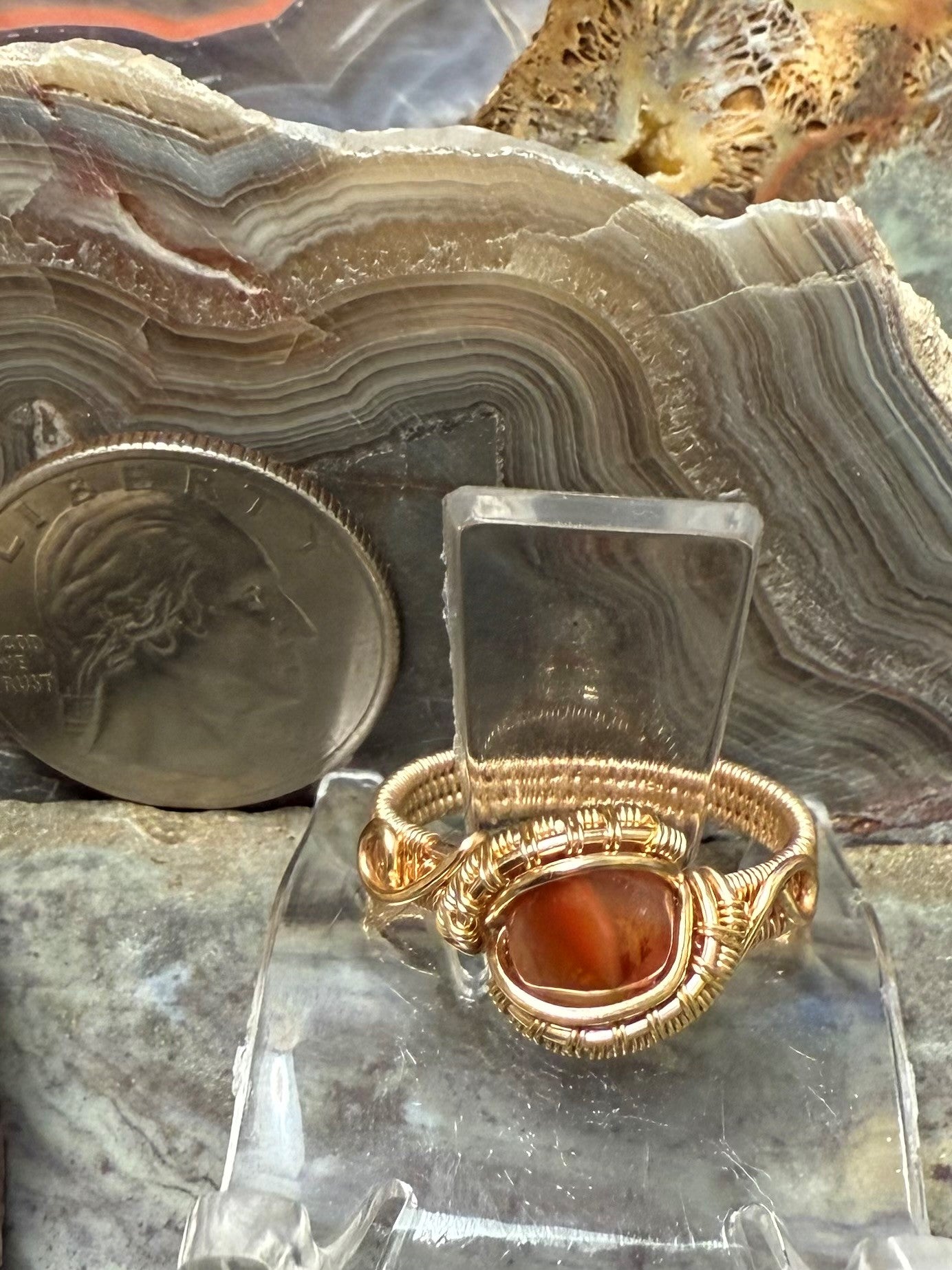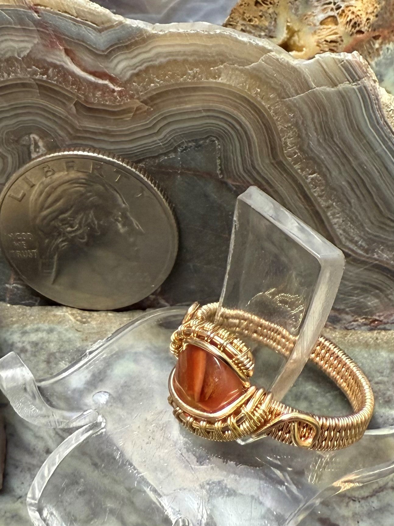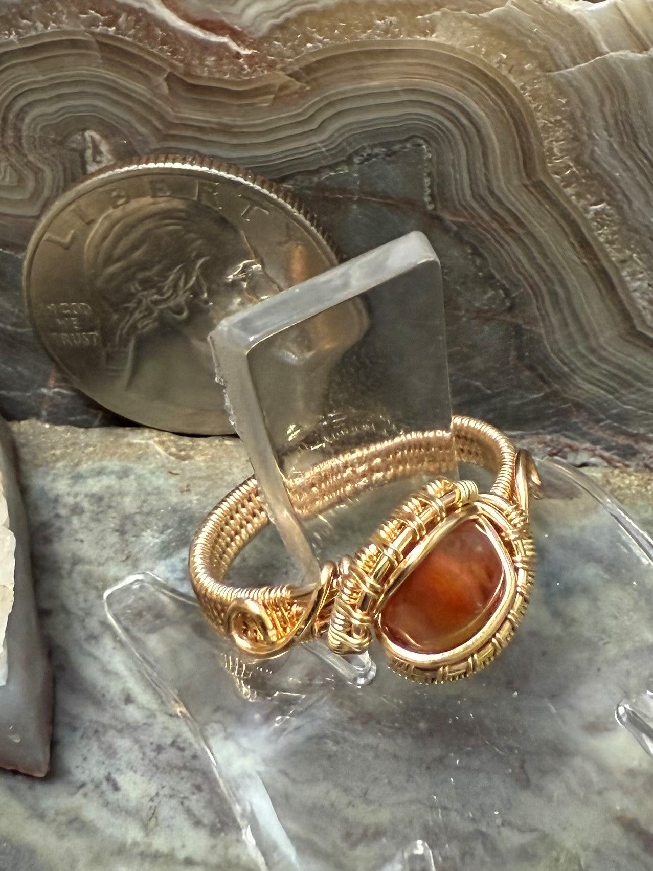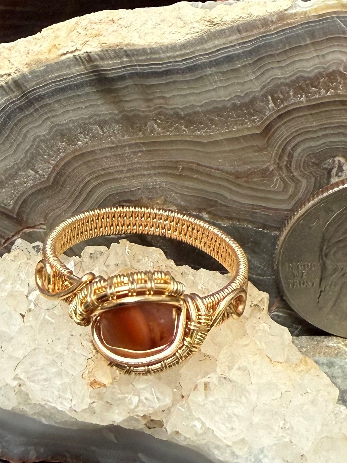 Handgeformter und polierter, wunderschöner Ring aus Malawi-Achat. Dieser Ring ist mit einem goldfarbenen Kupferdraht umwickelt, der so konzipiert und beschichtet ist, dass er schneller Oxidation widersteht.