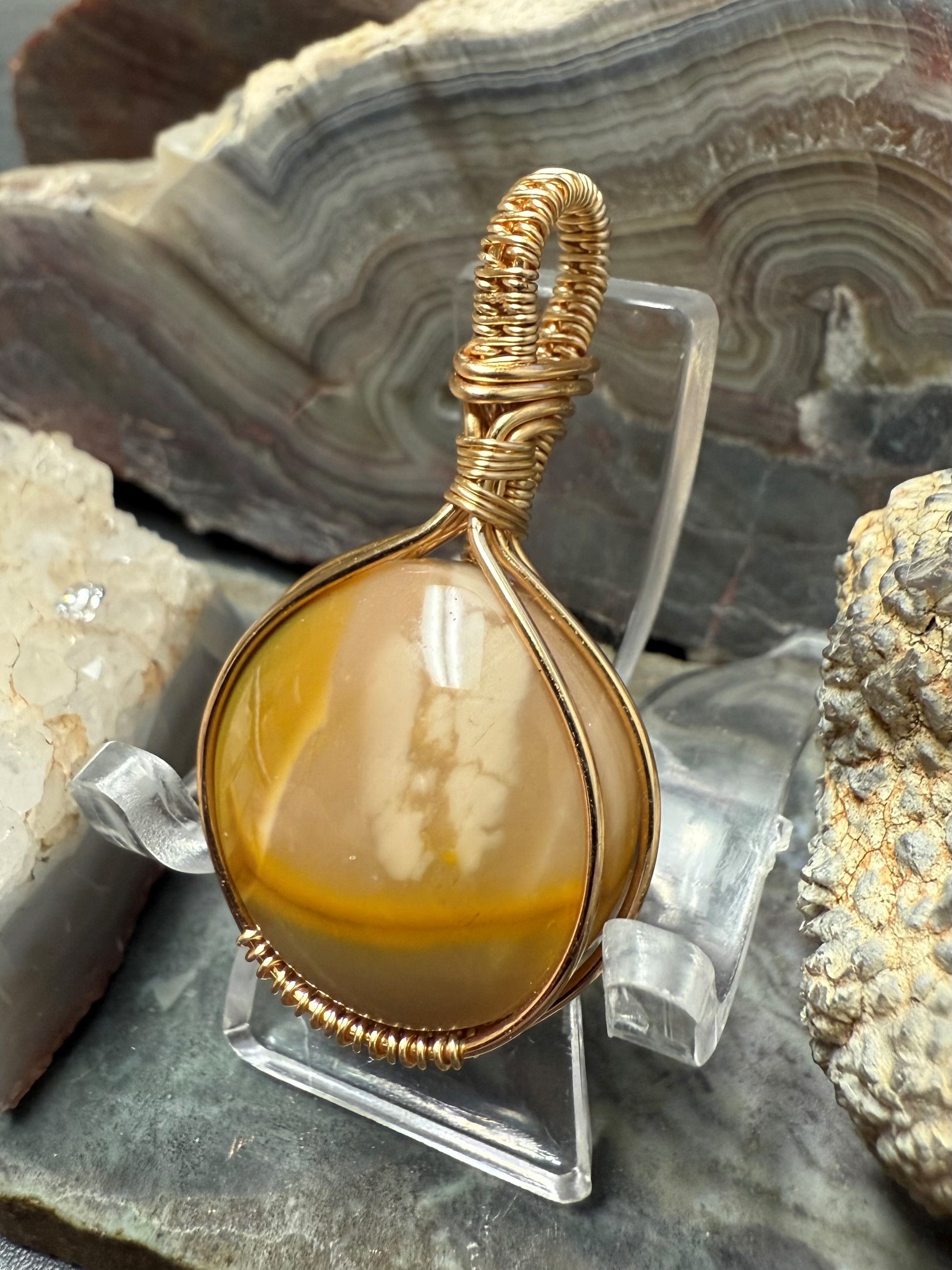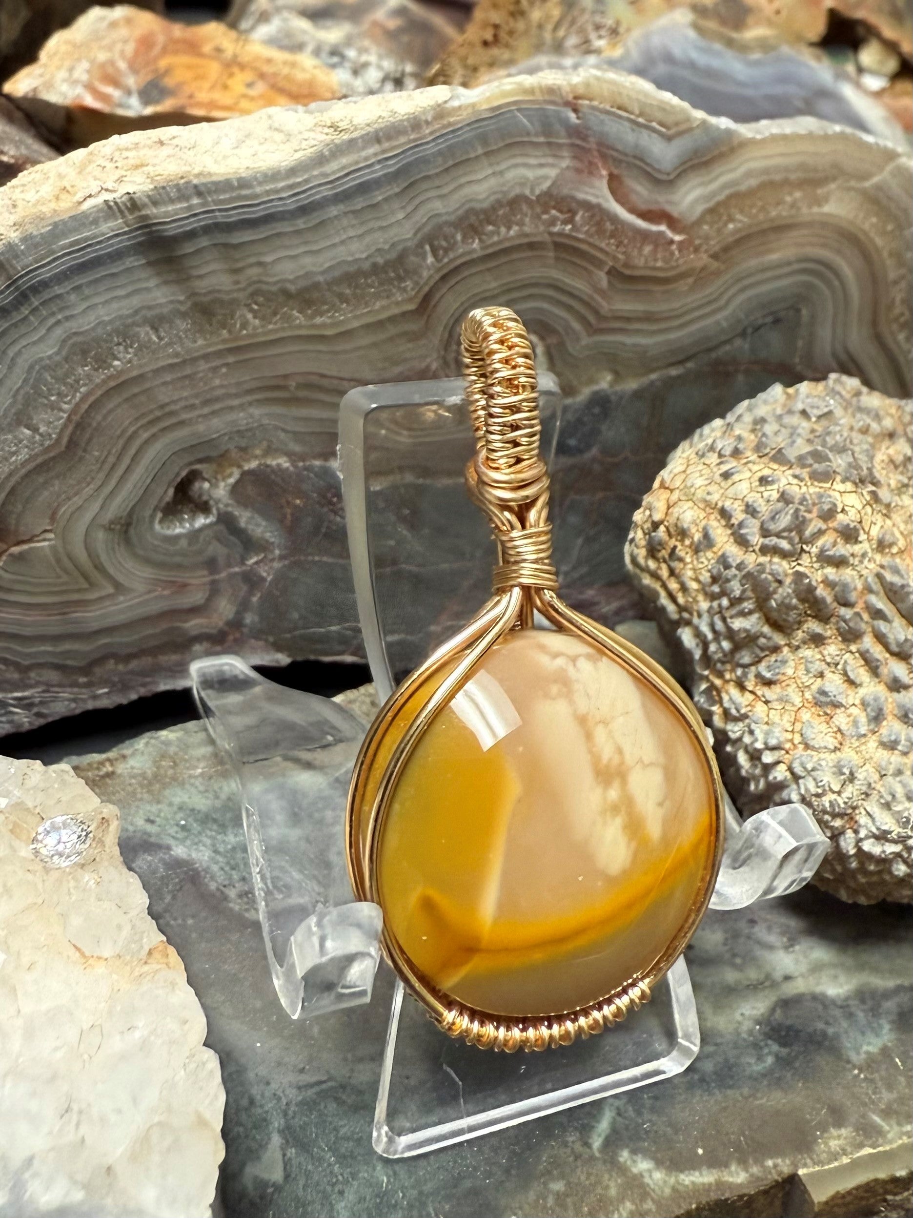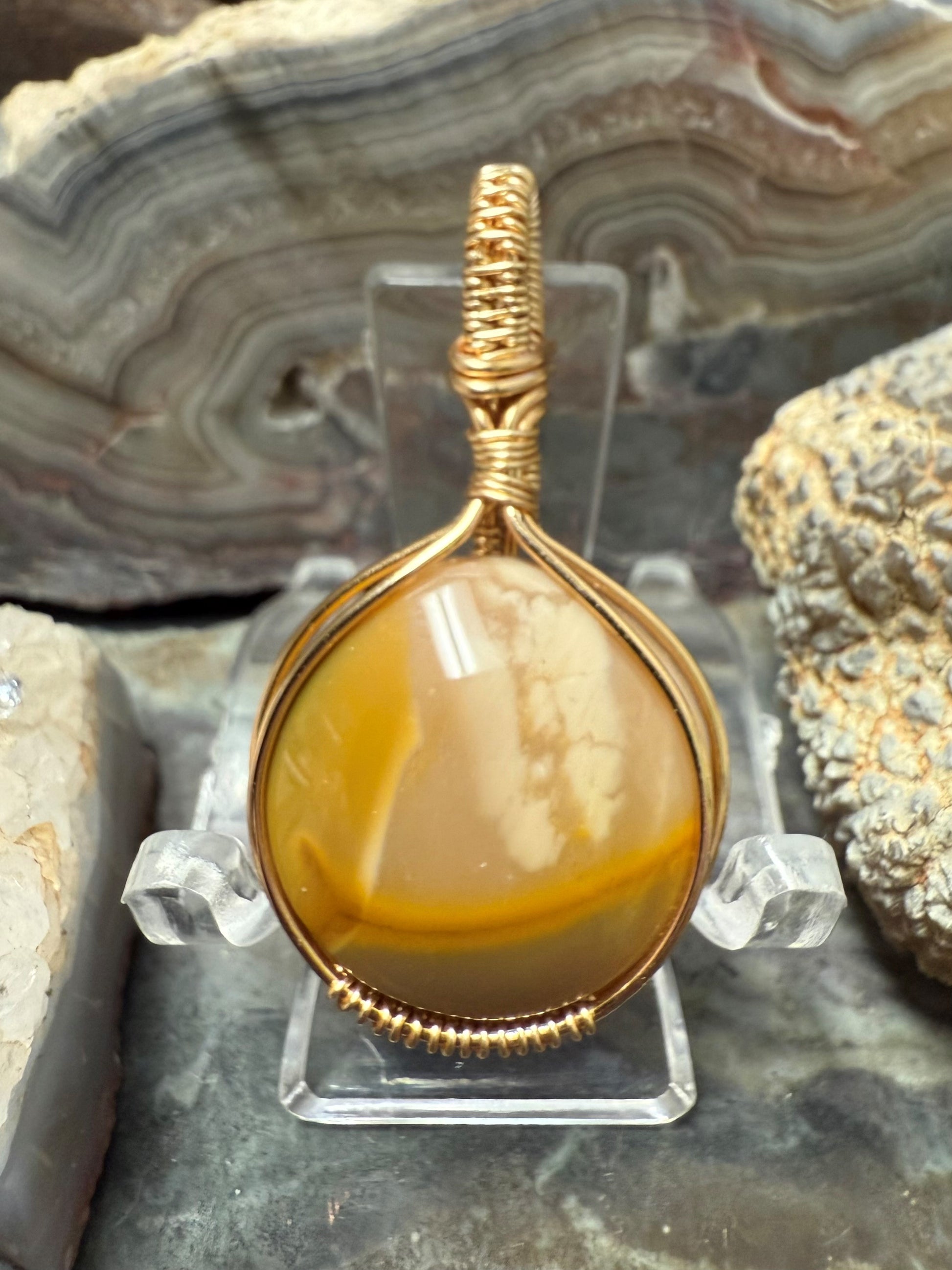 Hand shaped and polished, natural and beautiful, Australian Mookaite necklace. This pendant is wrapped with a gold-colored copper wire that is designed and coated to resist rapid oxidation.