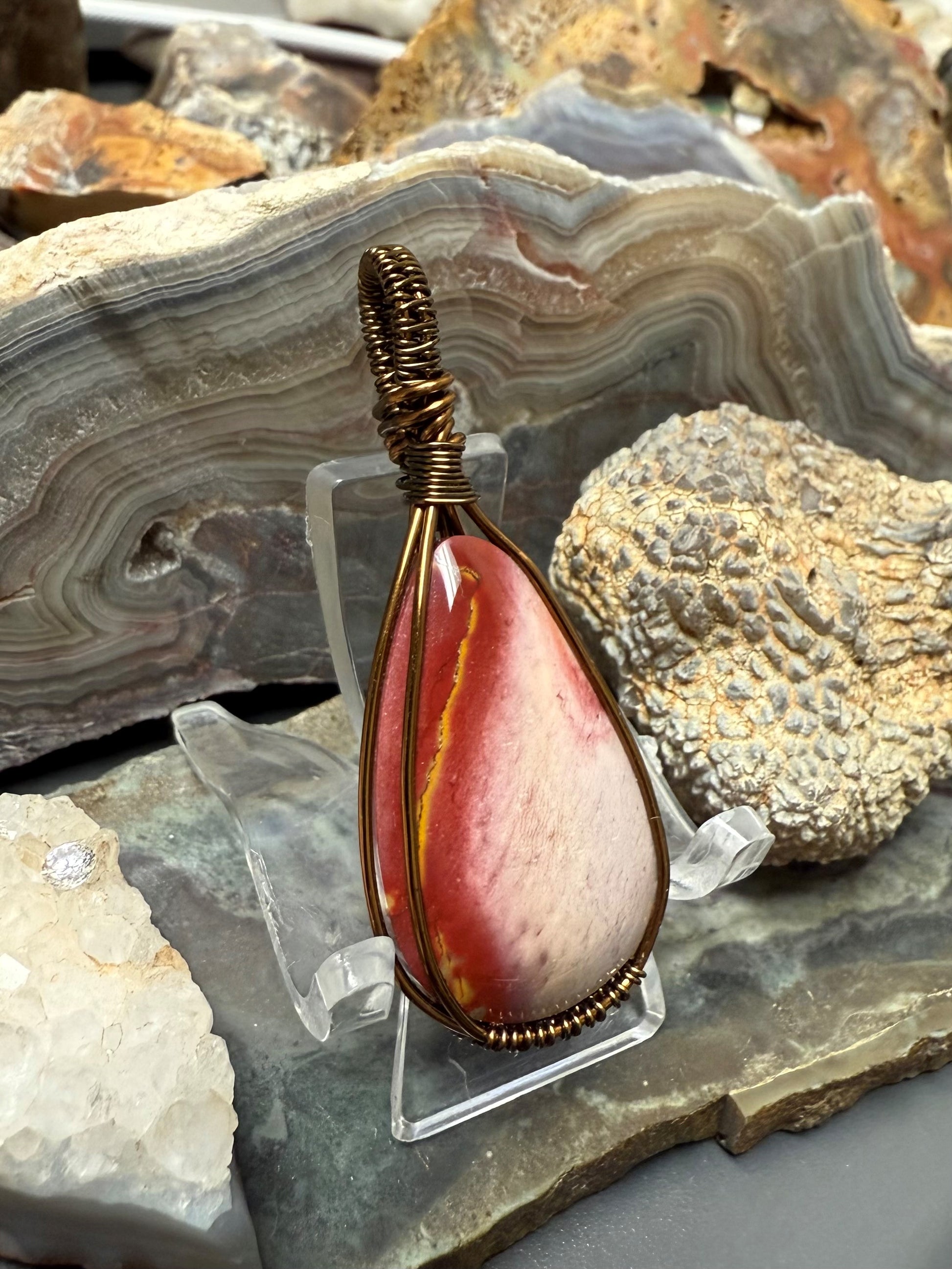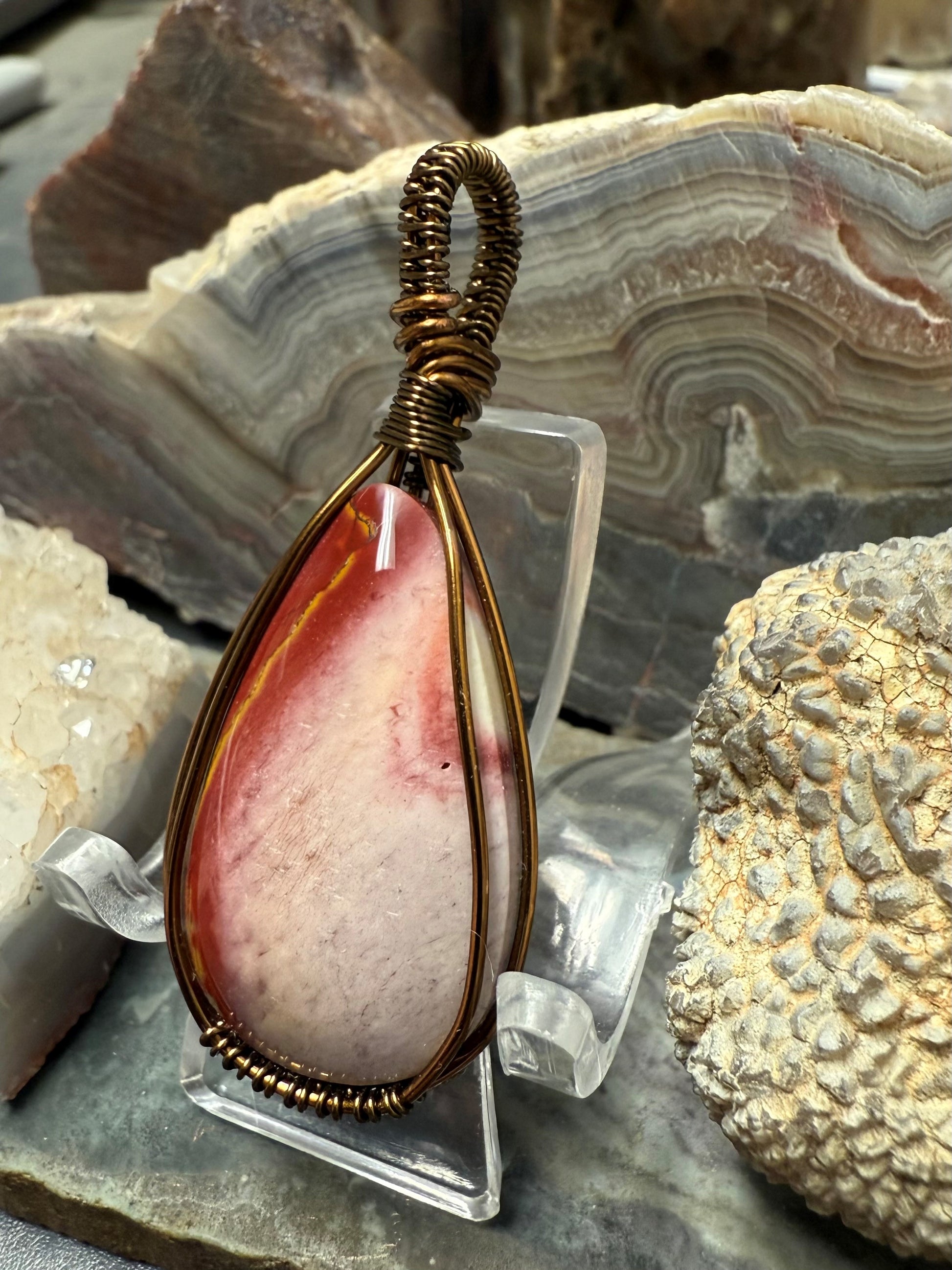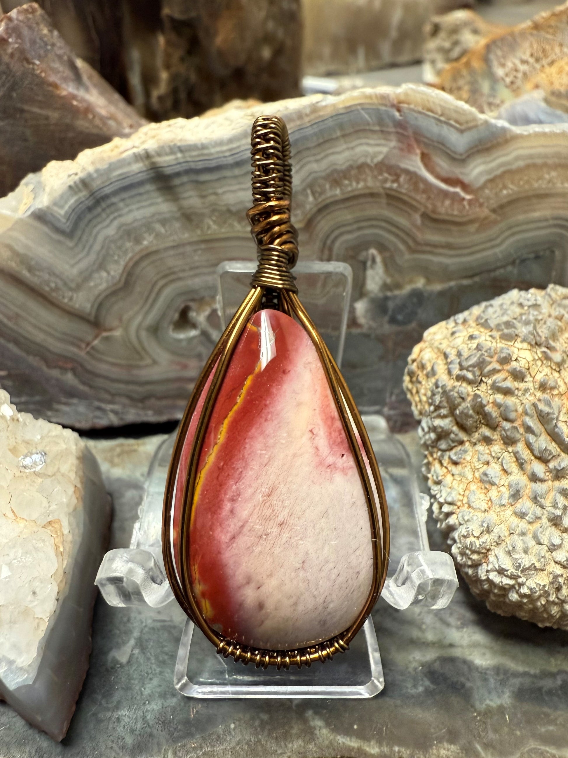 Hand shaped and polished, natural and beautiful, Australian Mookaite necklace. This pendant is wrapped with a bronze-colored copper wire that is designed and coated to resist rapid oxidation.
