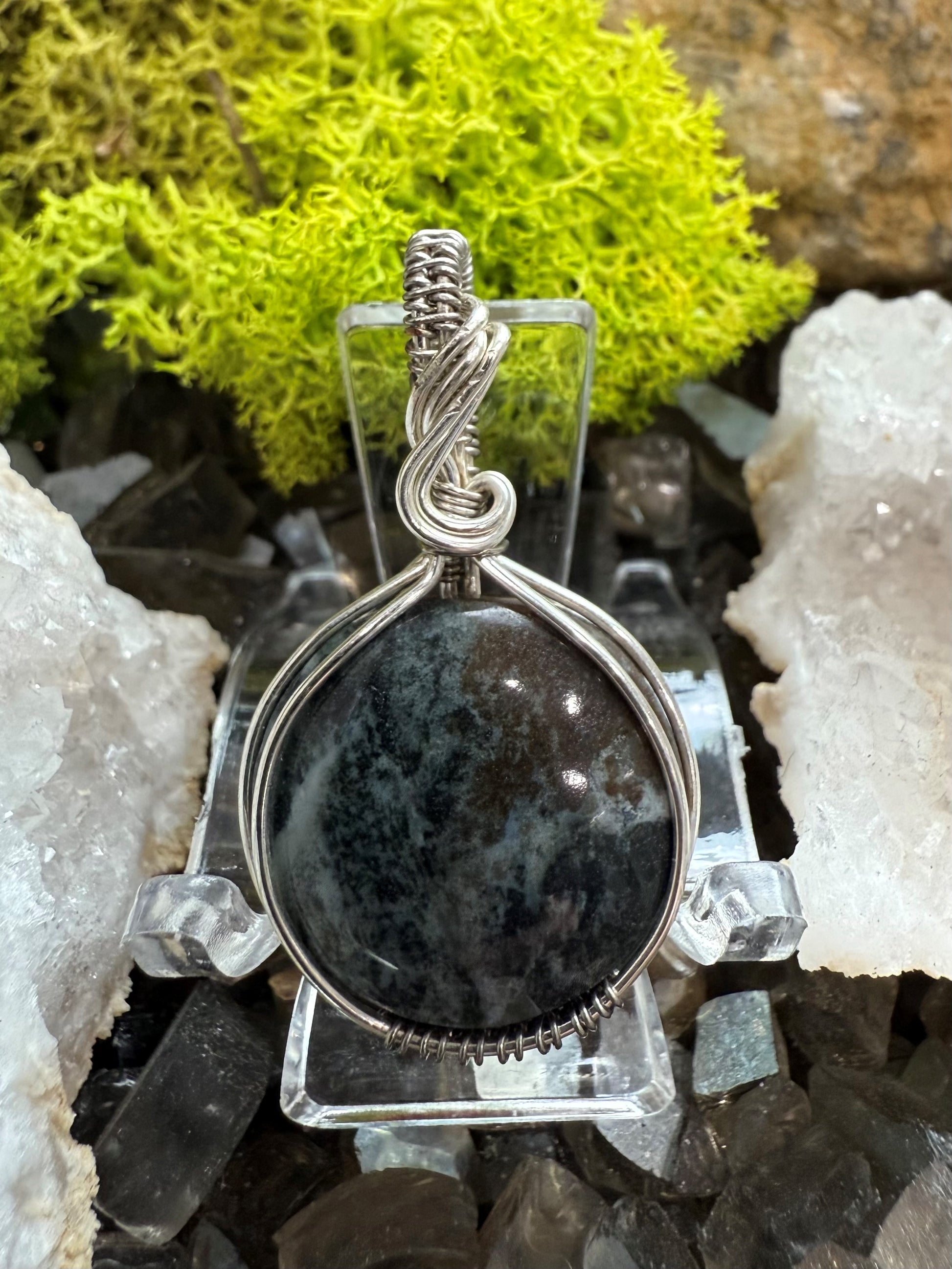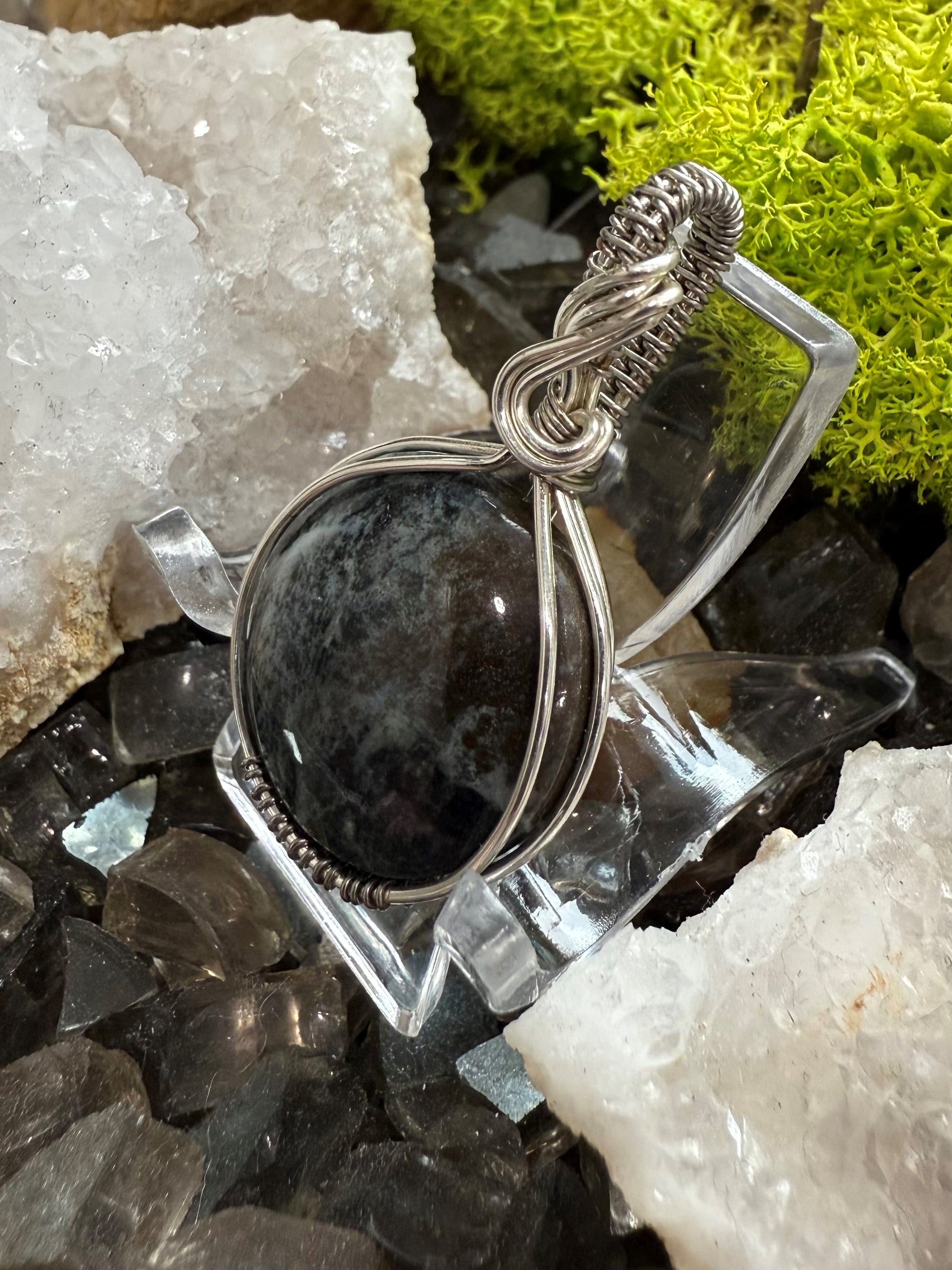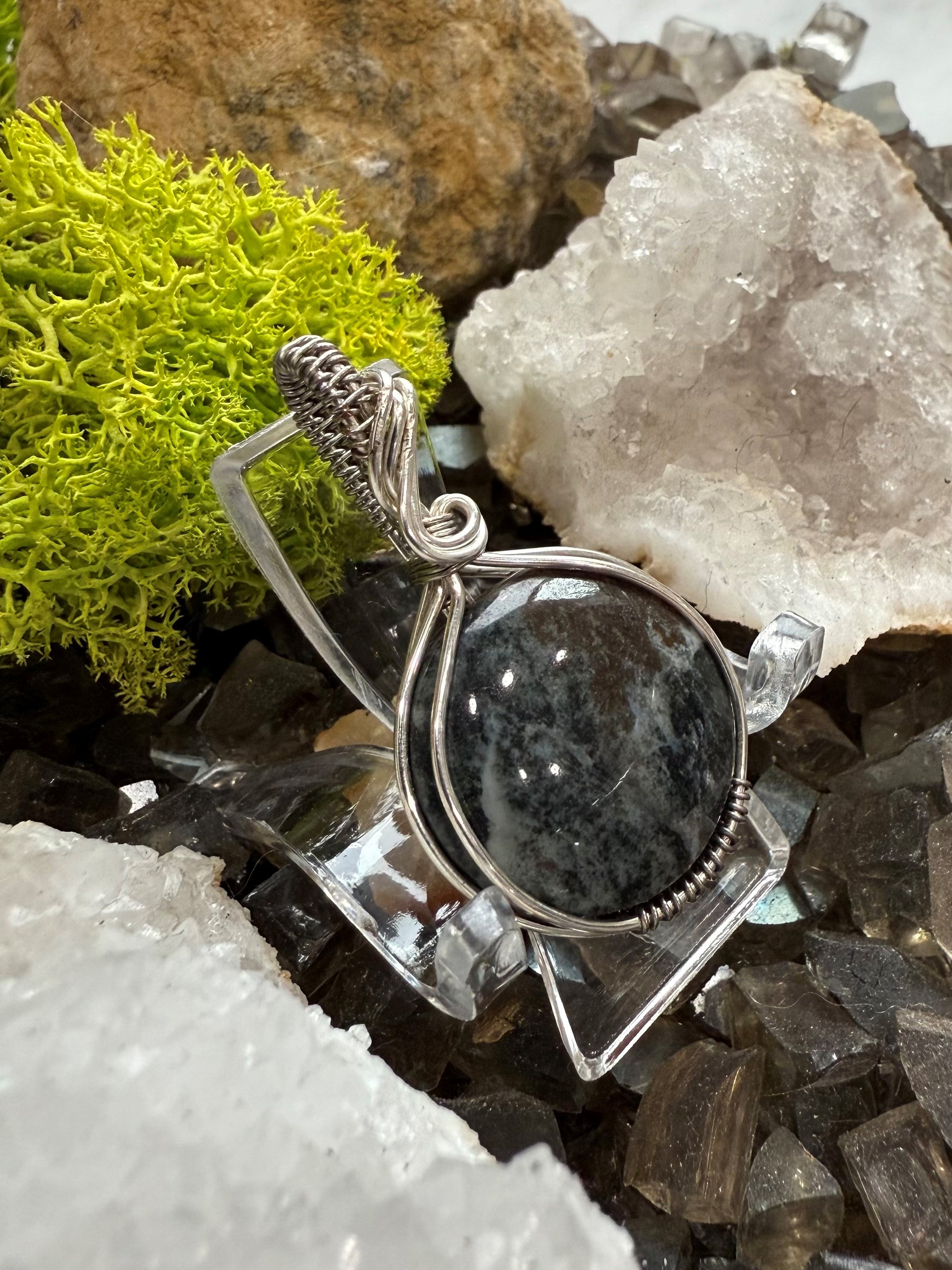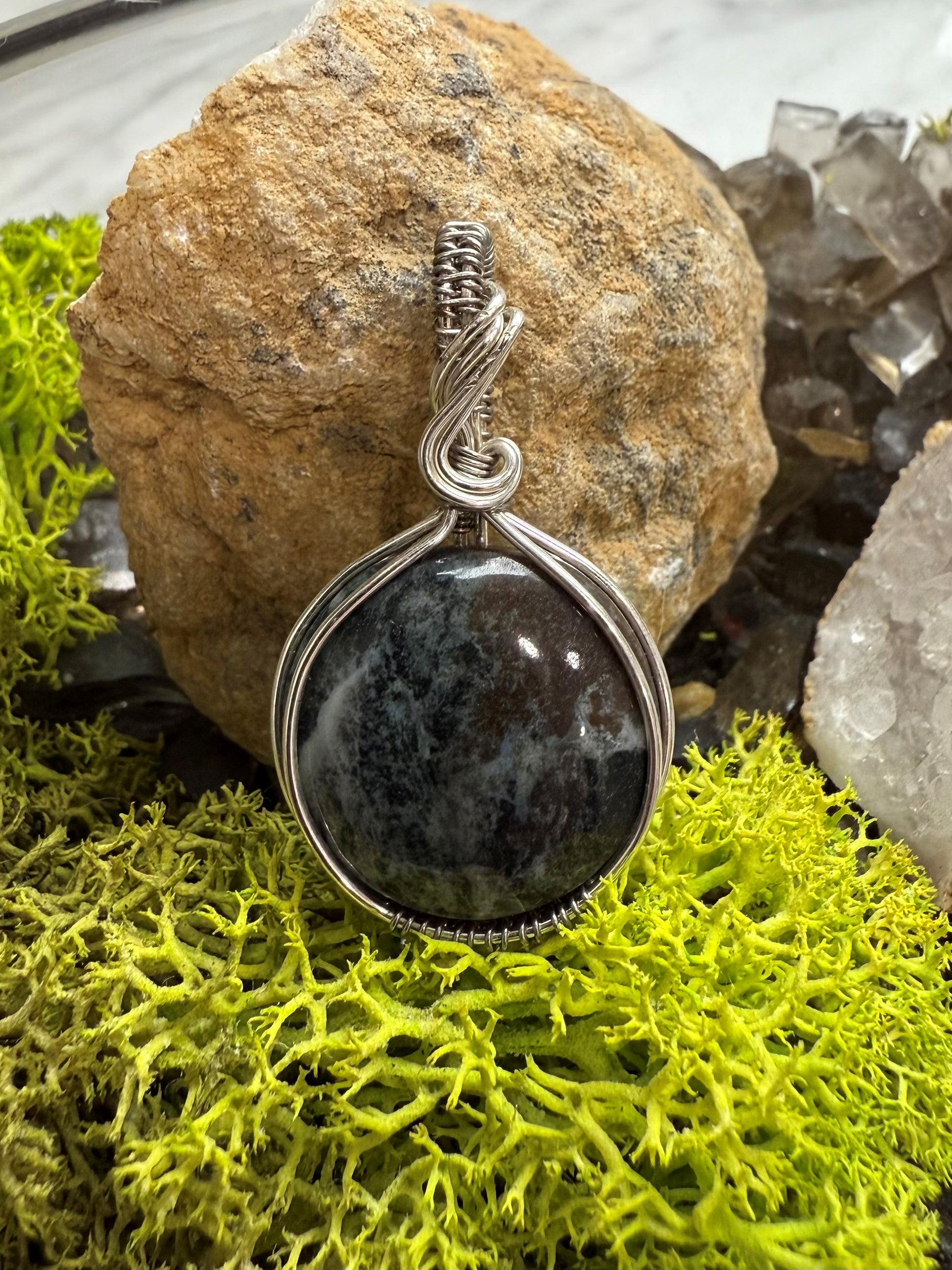 Von Hand geformter und polierter, natürlicher und wunderschöner Oregon-Jaspis. Dieser Anhänger ist mit einem silberfarbenen Kupferdraht umwickelt, der so konzipiert und beschichtet ist, dass er schneller Oxidation widersteht.