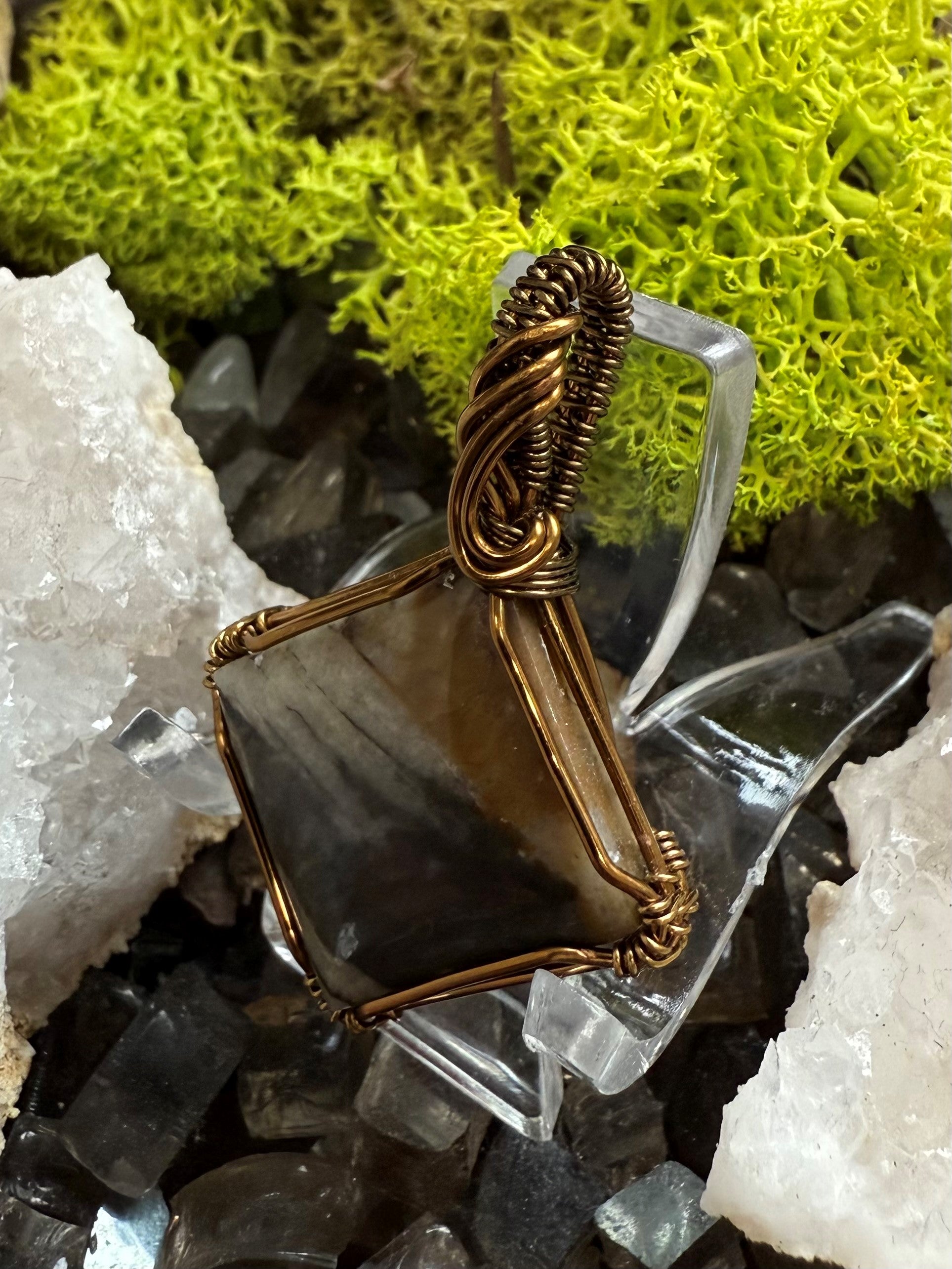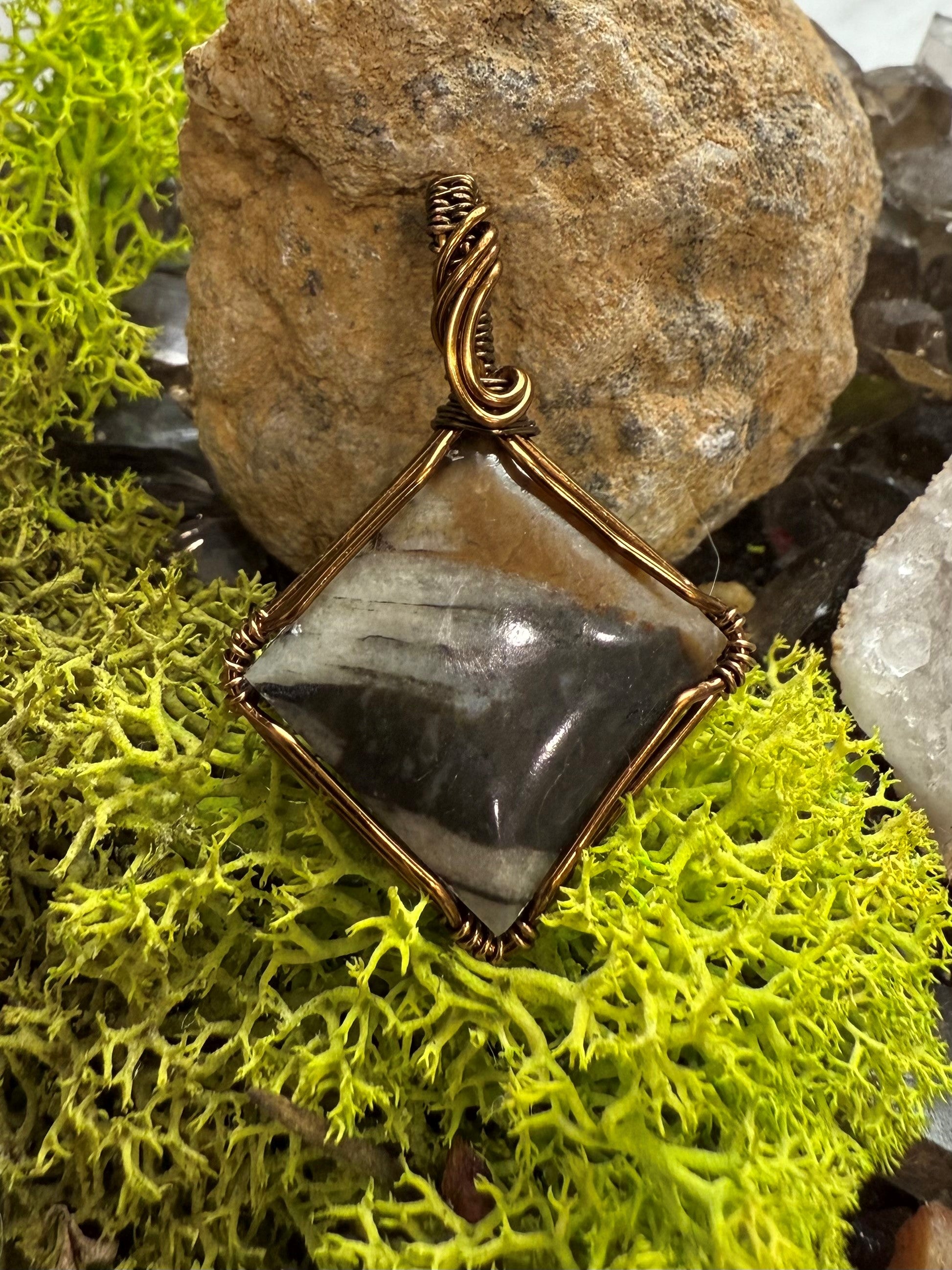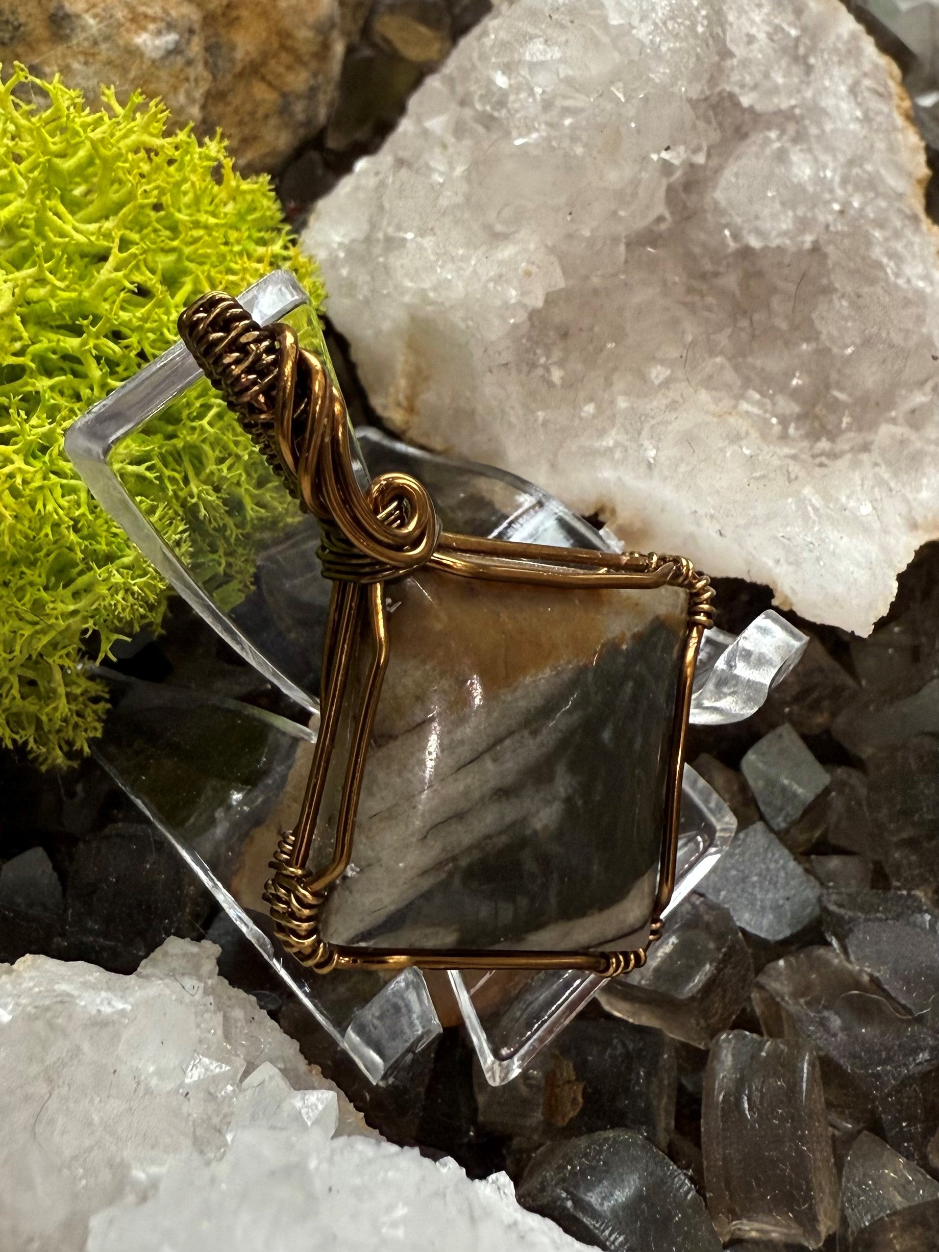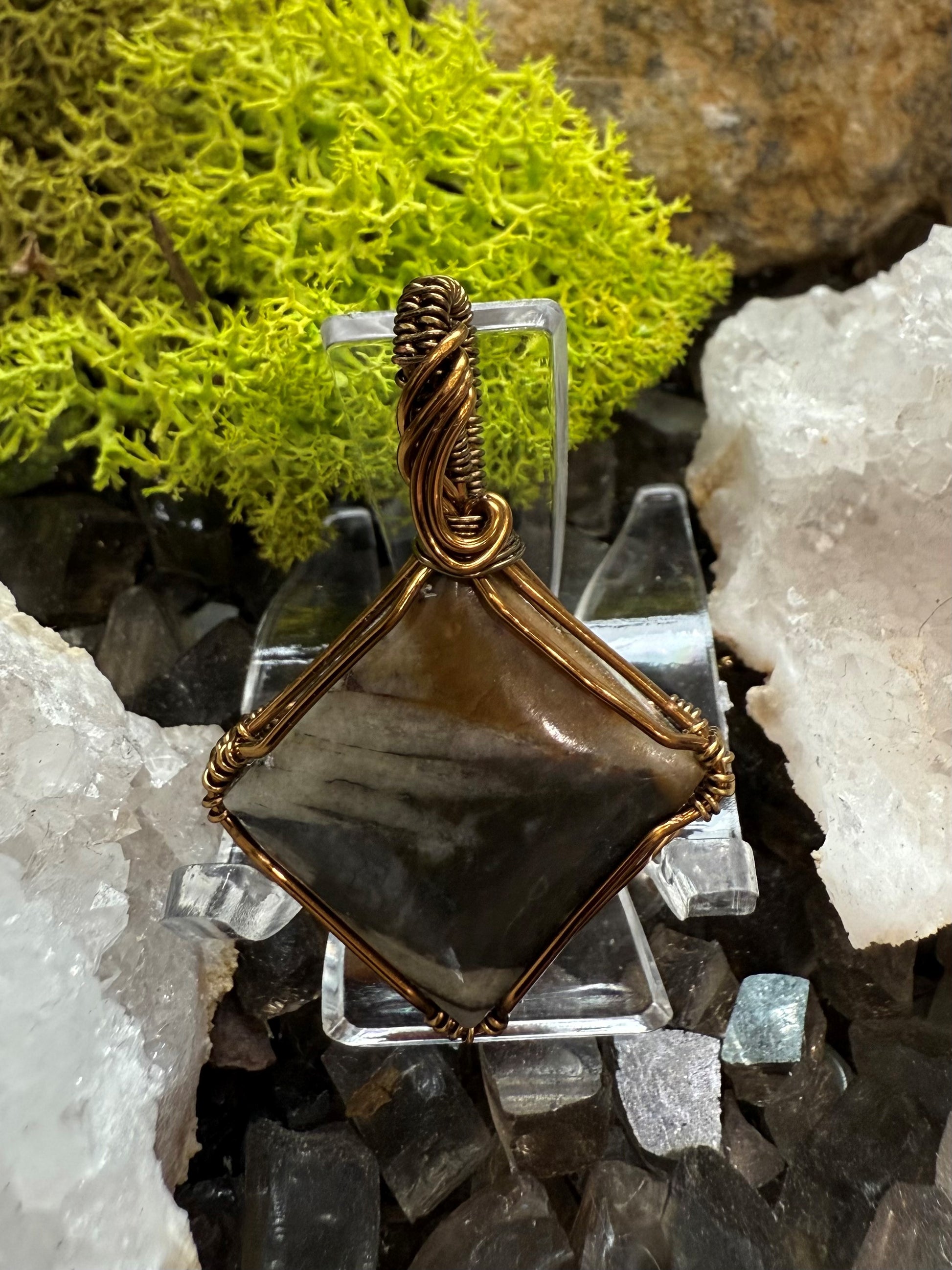 Von Hand geformter und polierter, natürlicher und wunderschöner Oregon-Jaspis. Dieser Anhänger ist mit einem bronzefarbenen Kupferdraht umwickelt, der so konzipiert und beschichtet ist, dass er schneller Oxidation widersteht.