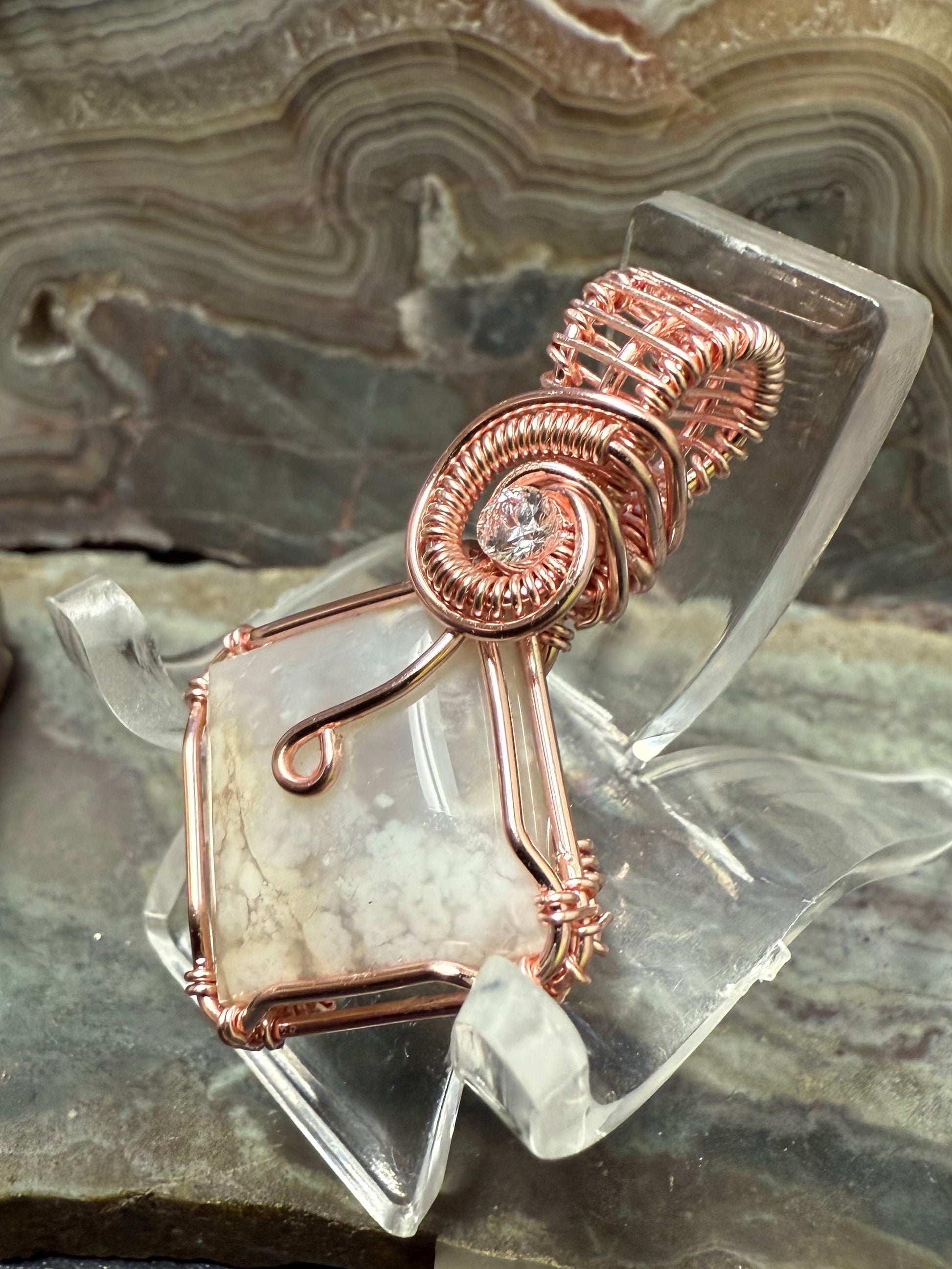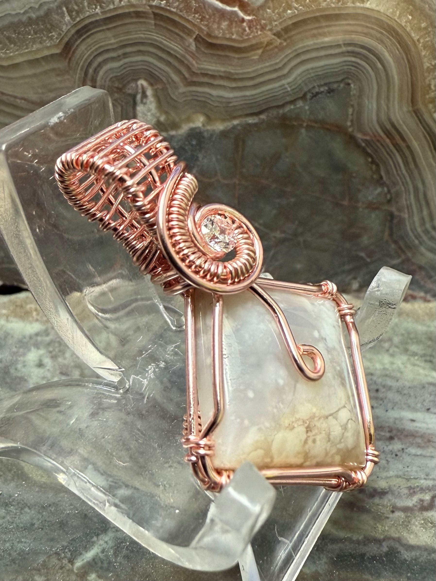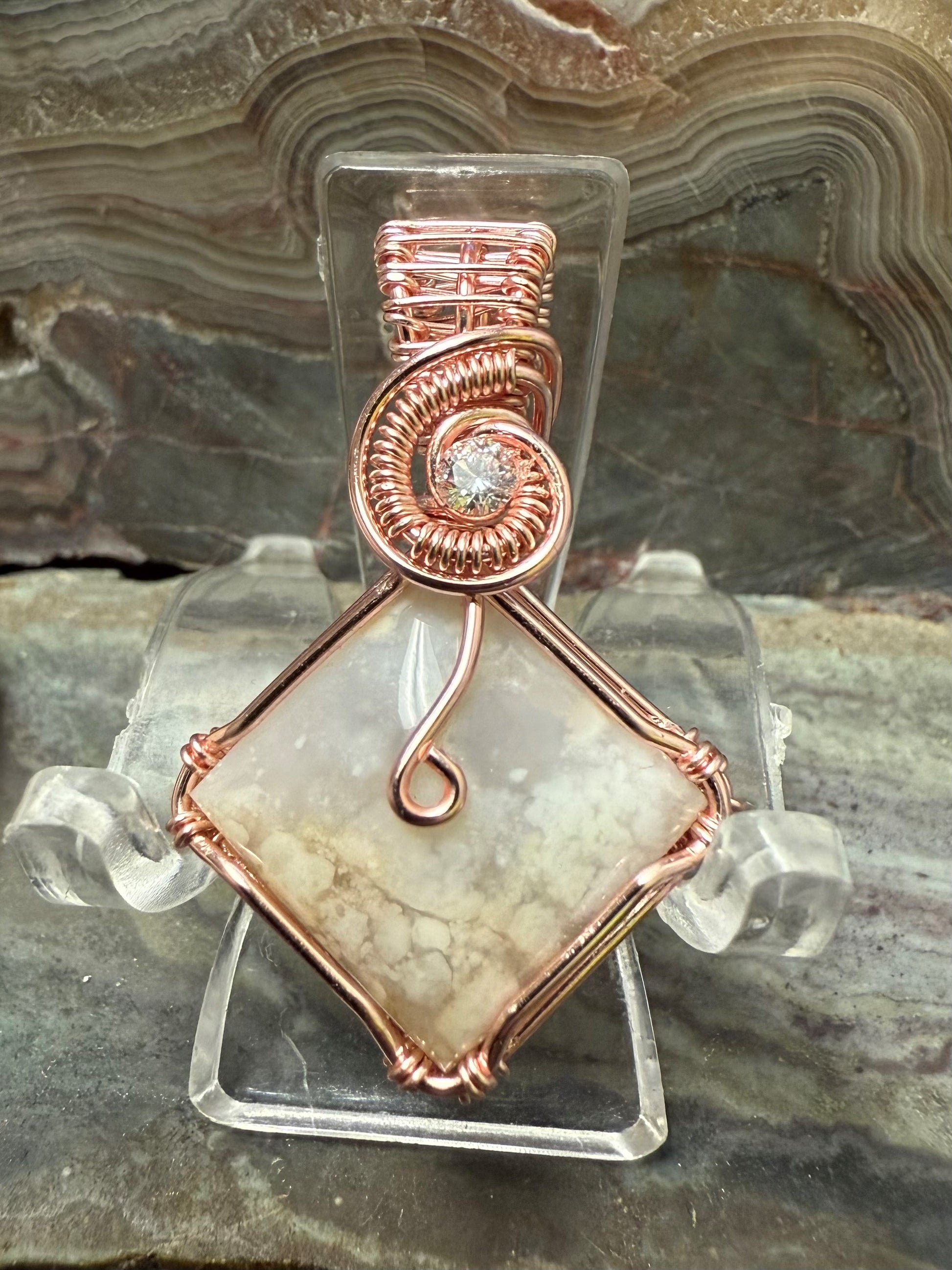 Hand shaped and polished, beautiful white and translucent Oregon Plume Agate. This pendant is wrapped with a Rose-colored copper wire that is designed and coated to resist rapid oxidation. This pendant also includes one (1), 3 mm cubic zirconia stones to set this piece apart from the field.