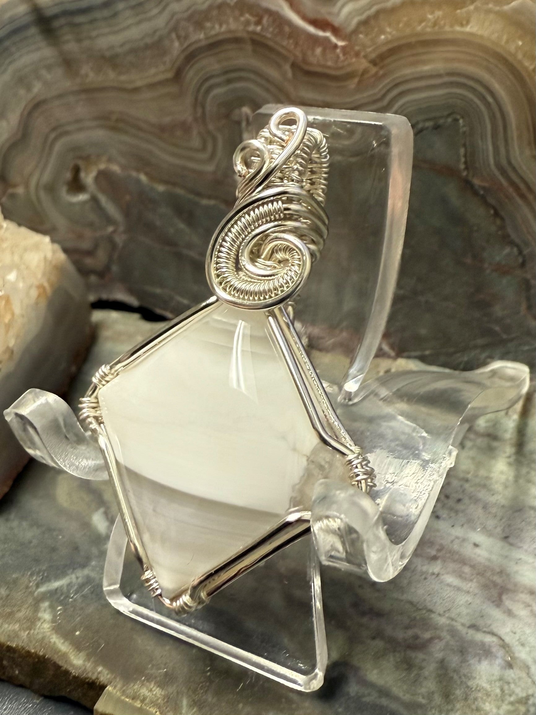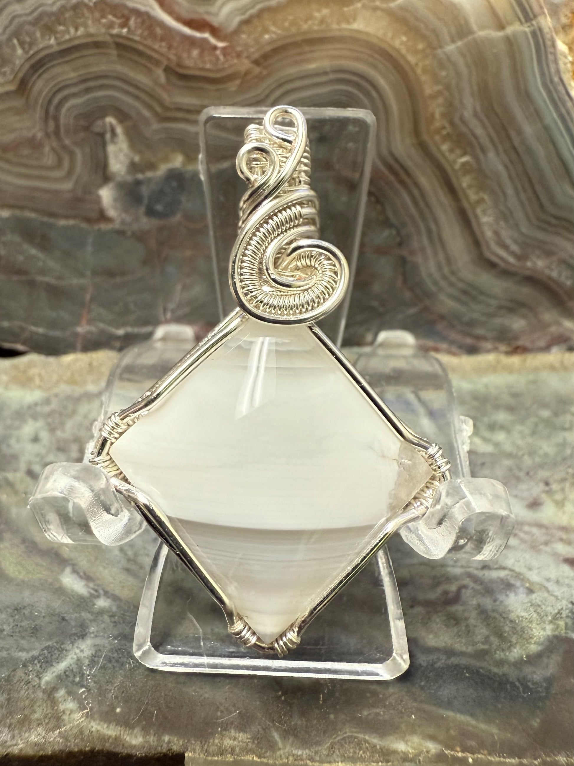 Hand shaped and polished, natural and beautiful, Oregon Waterline Agate necklace. This pendant is wrapped with a silver-colored copper wire that is designed and coated to resist rapid oxidation.