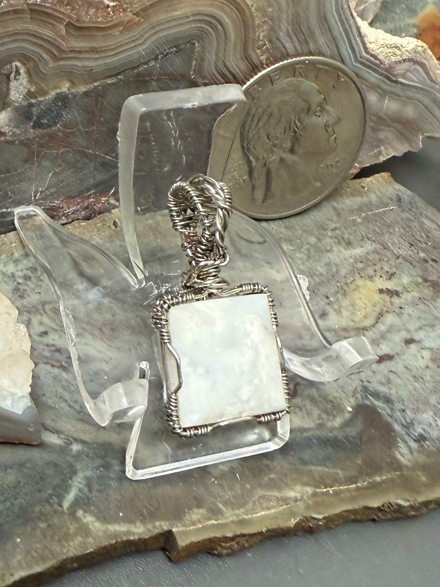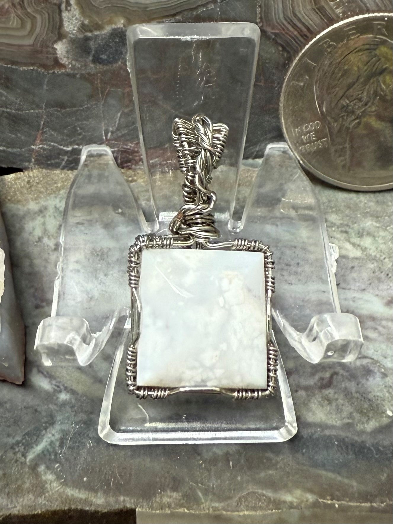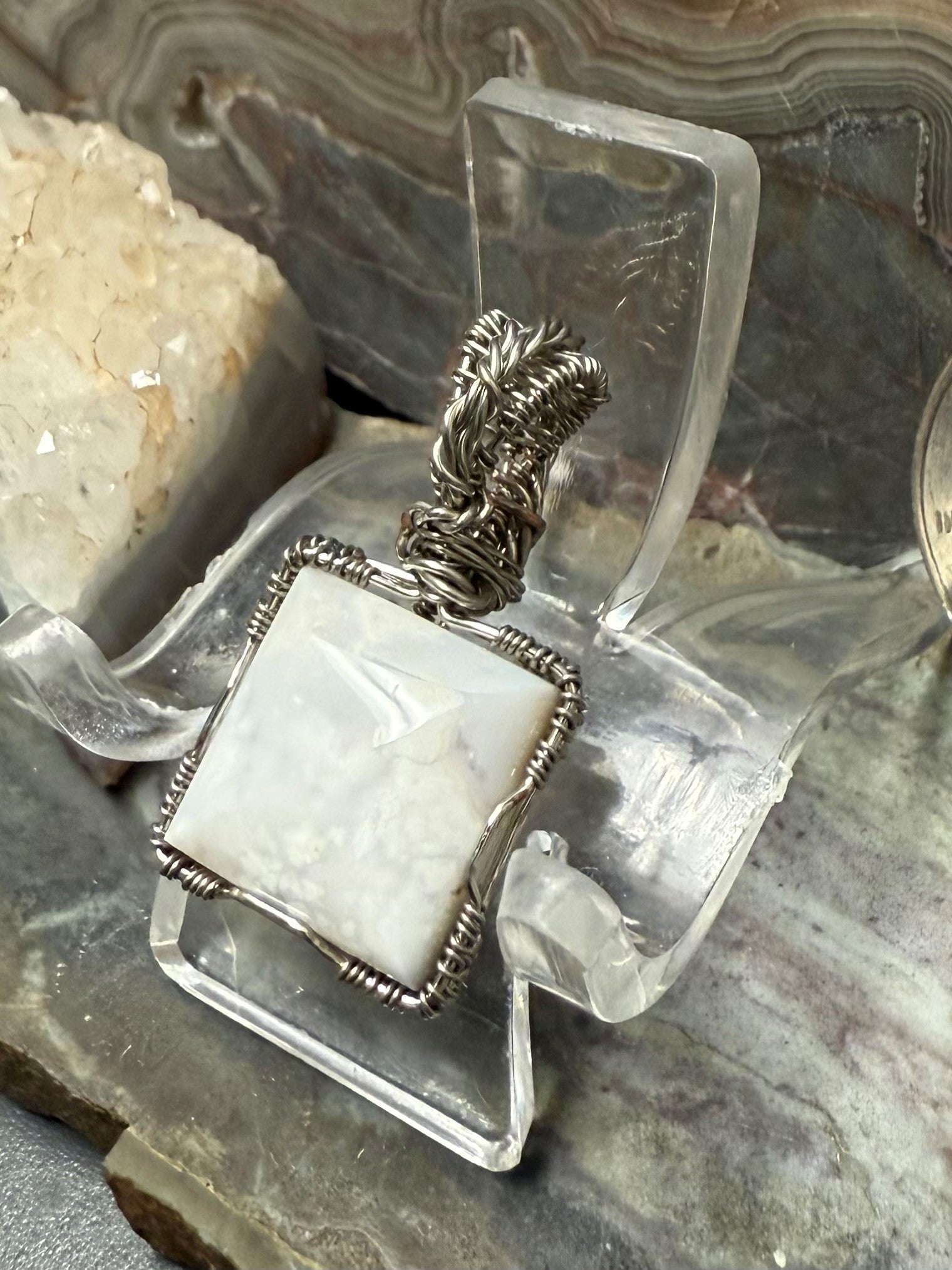 Handgeformt und poliert, natürlich und wunderschön, Oregon Plume Achat. Dieser Anhänger ist mit einem silberfarbenen Kupferdraht umwickelt, der so konzipiert und beschichtet ist, dass er schneller Oxidation widersteht. Dieser Anhänger ist Teil der „Mini“-Kollektion.