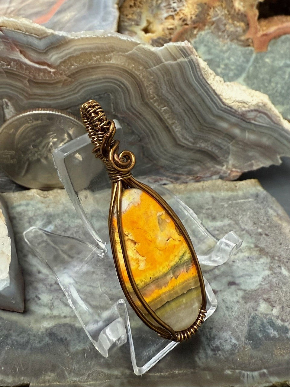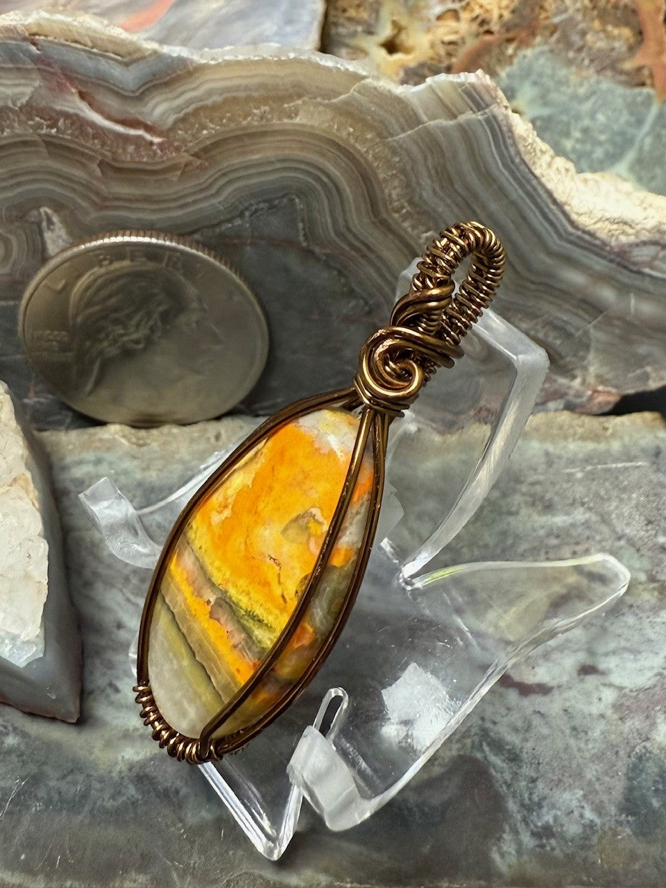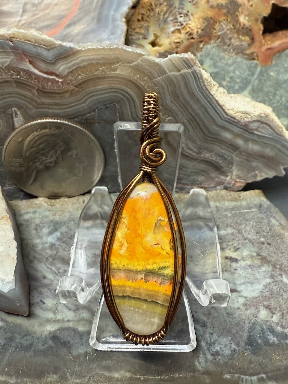 Handgeformter und polierter, natürlicher und schöner Hummeljaspis. Dieser Anhänger ist mit einem bronzefarbenen Kupferdraht umwickelt, der so konzipiert und beschichtet ist, dass er schneller Oxidation widersteht.
