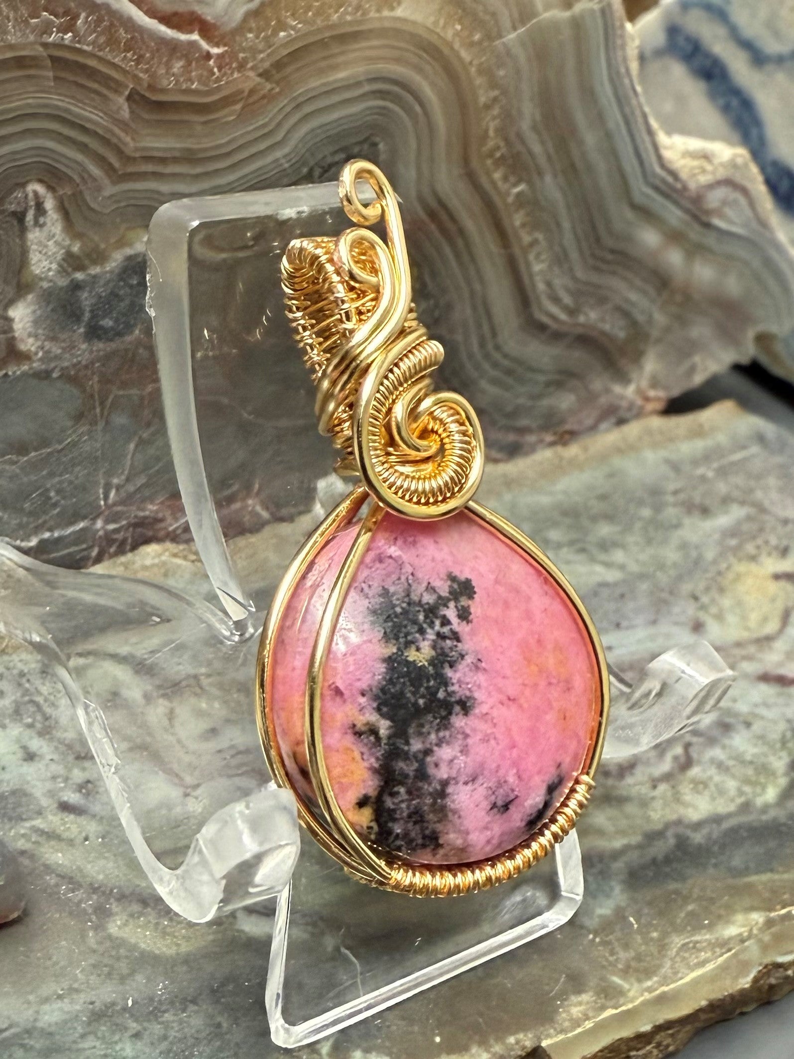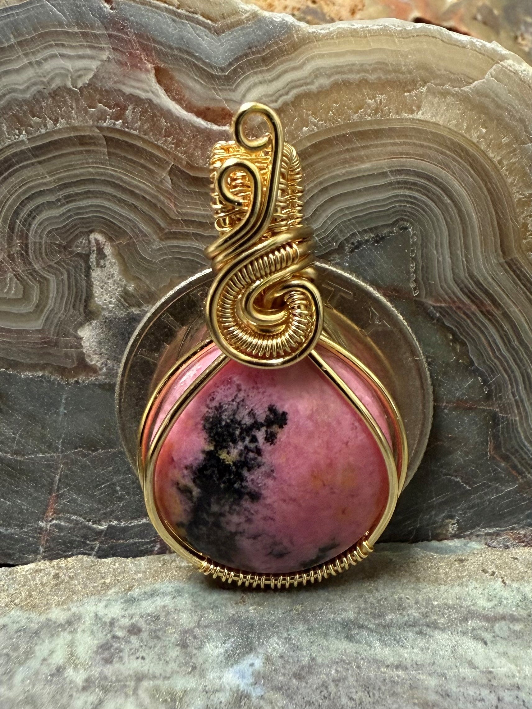 Hand shaped and polished, natural and beautiful, pink and black Rhodonite necklace. This pendant is wrapped with a gold-colored copper wire that is designed and coated to resist rapid oxidation.