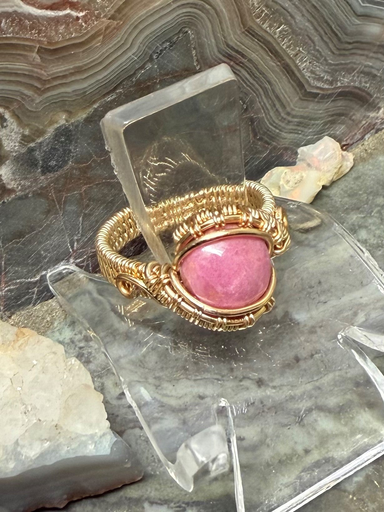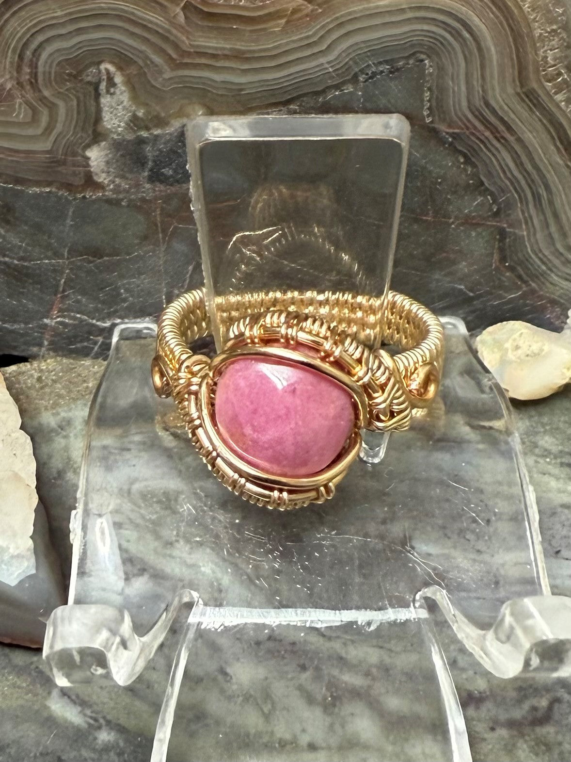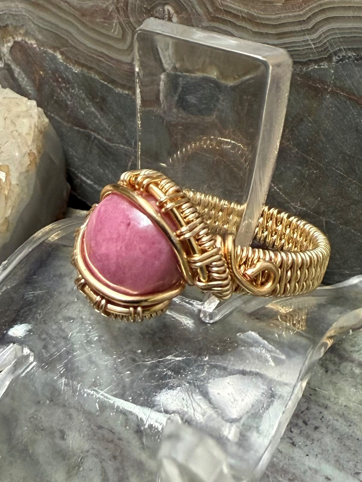 Von Hand geformter und polierter, natürlicher und wunderschöner rosa Rhodonit. Dieser Ring ist mit einem goldfarbenen Kupferdraht umwickelt, der so konzipiert und beschichtet ist, dass er schneller Oxidation widersteht.