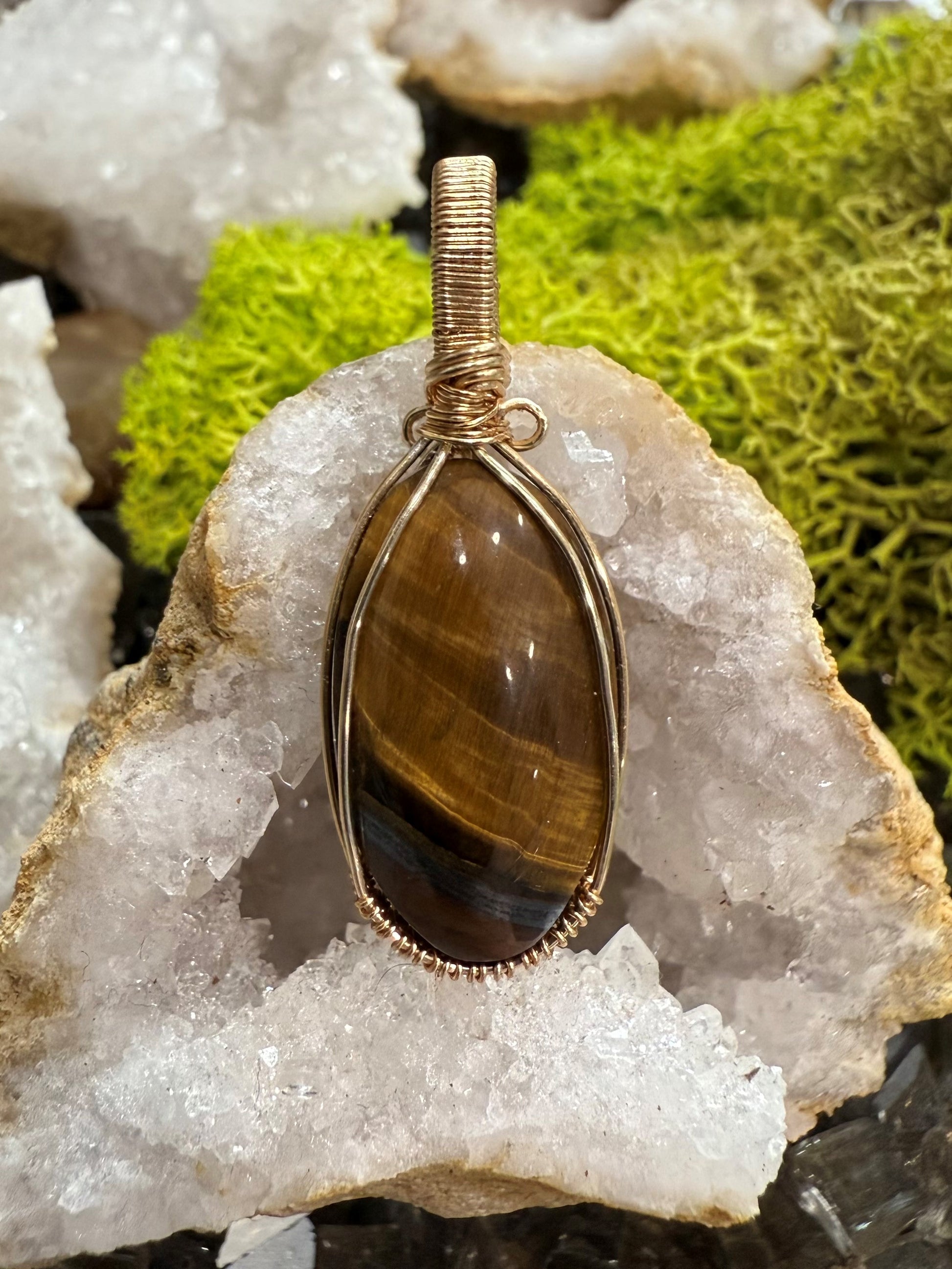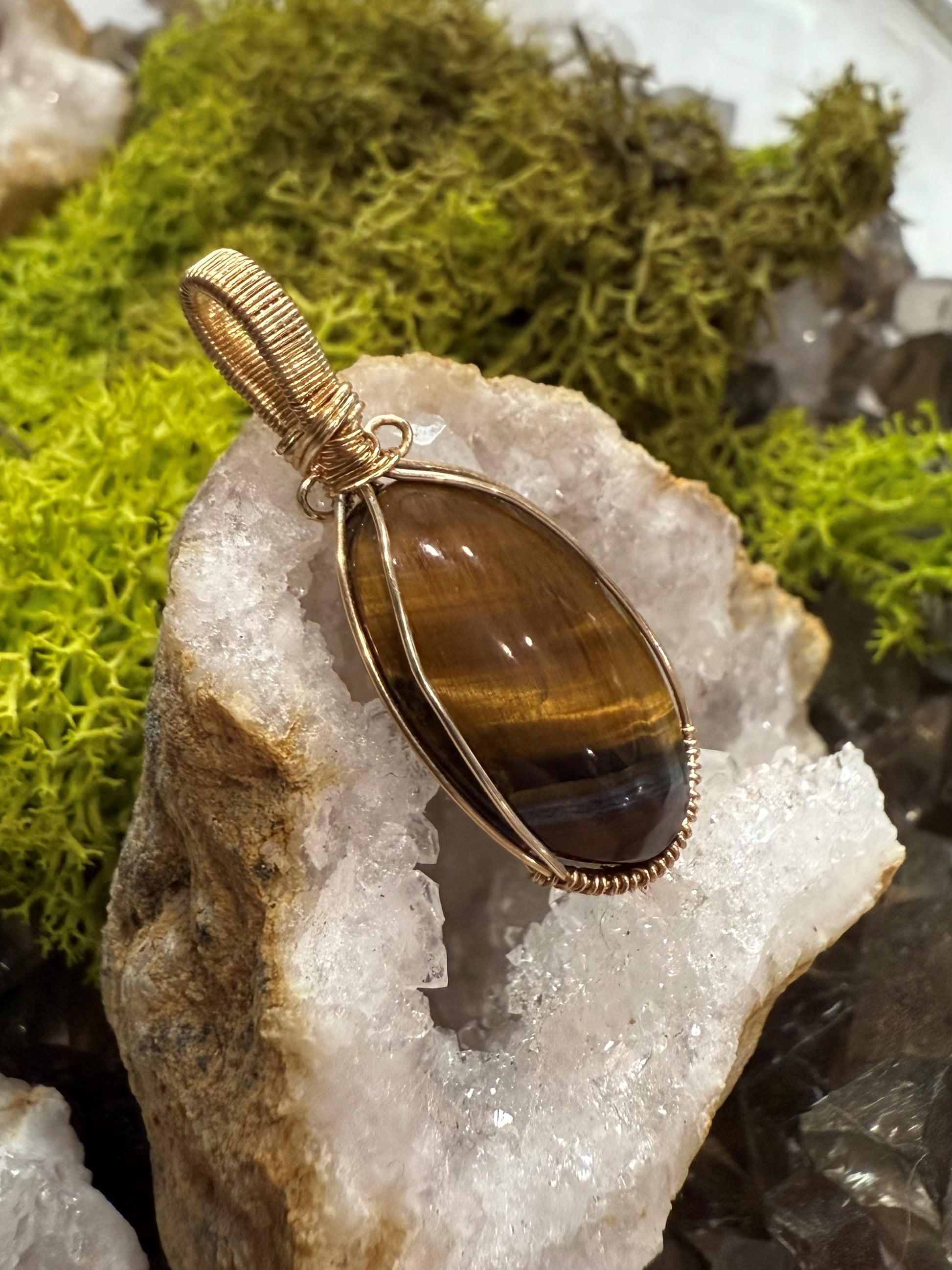 Von Hand geformtes und poliertes, natürliches und wunderschönes braunes Chatoyant-Tigerauge. Dieser Anhänger ist mit einem goldfarbenen Kupferdraht umwickelt, der so konzipiert und beschichtet ist, dass er einer schnellen Oxidation widersteht.