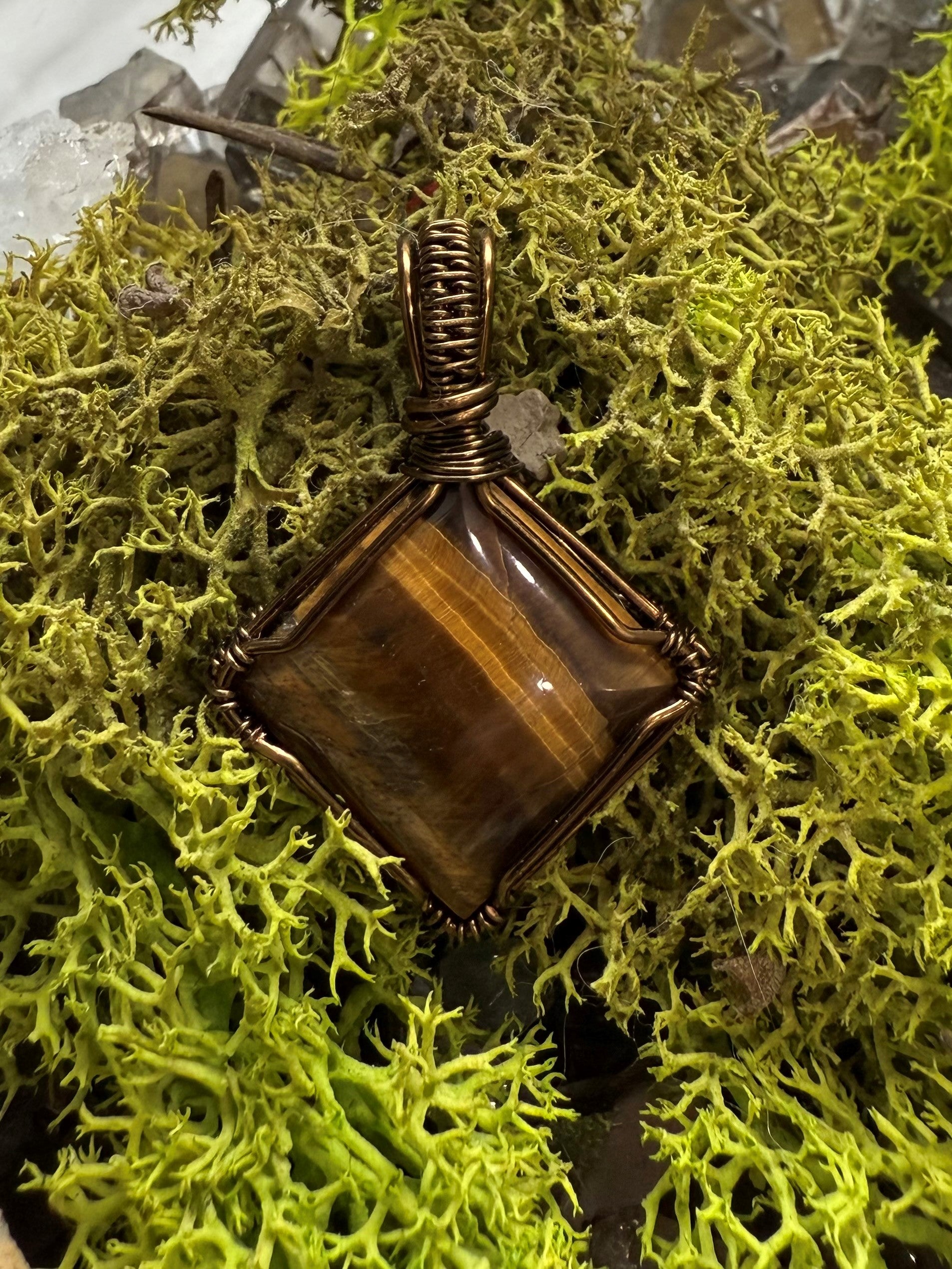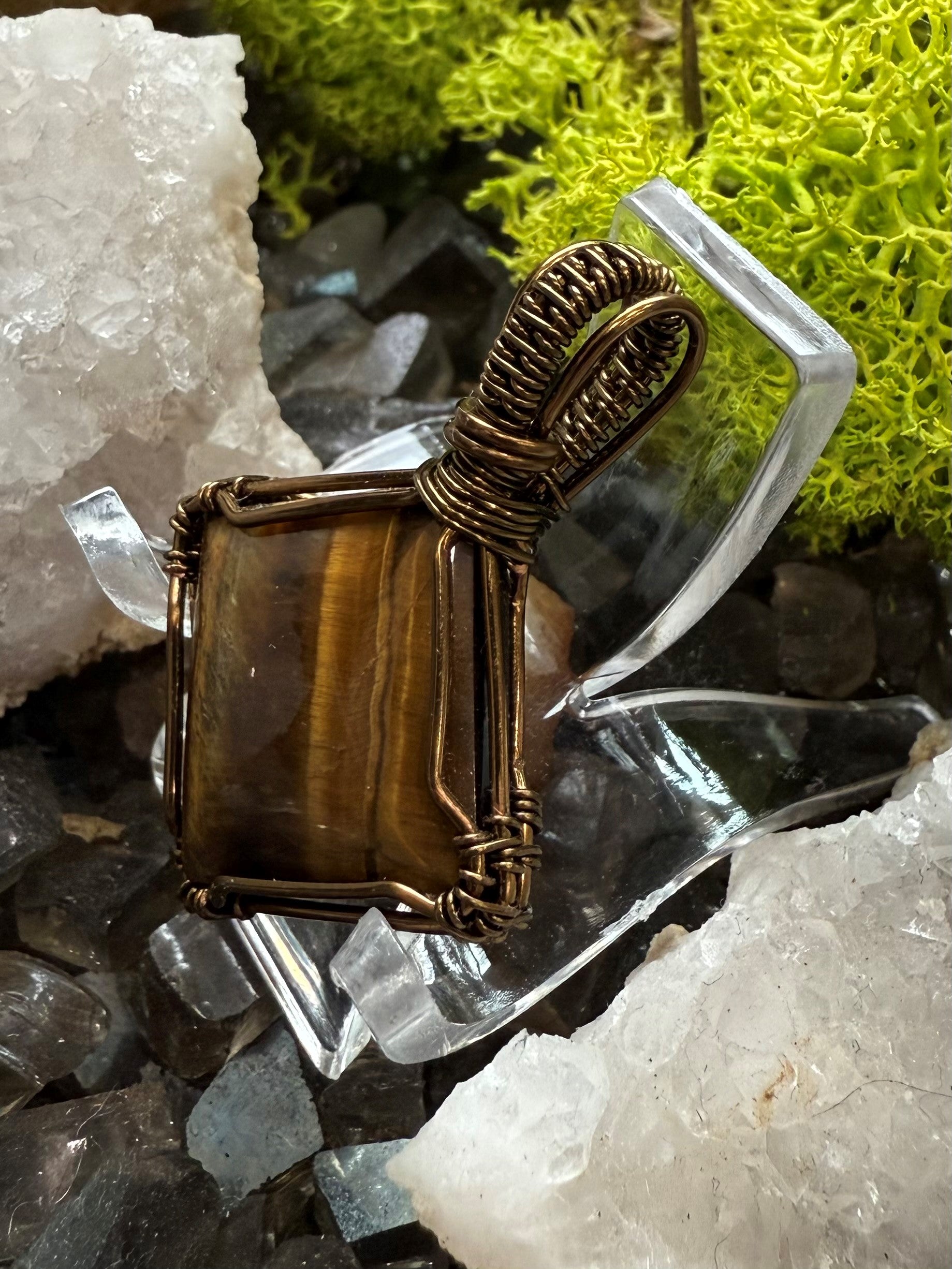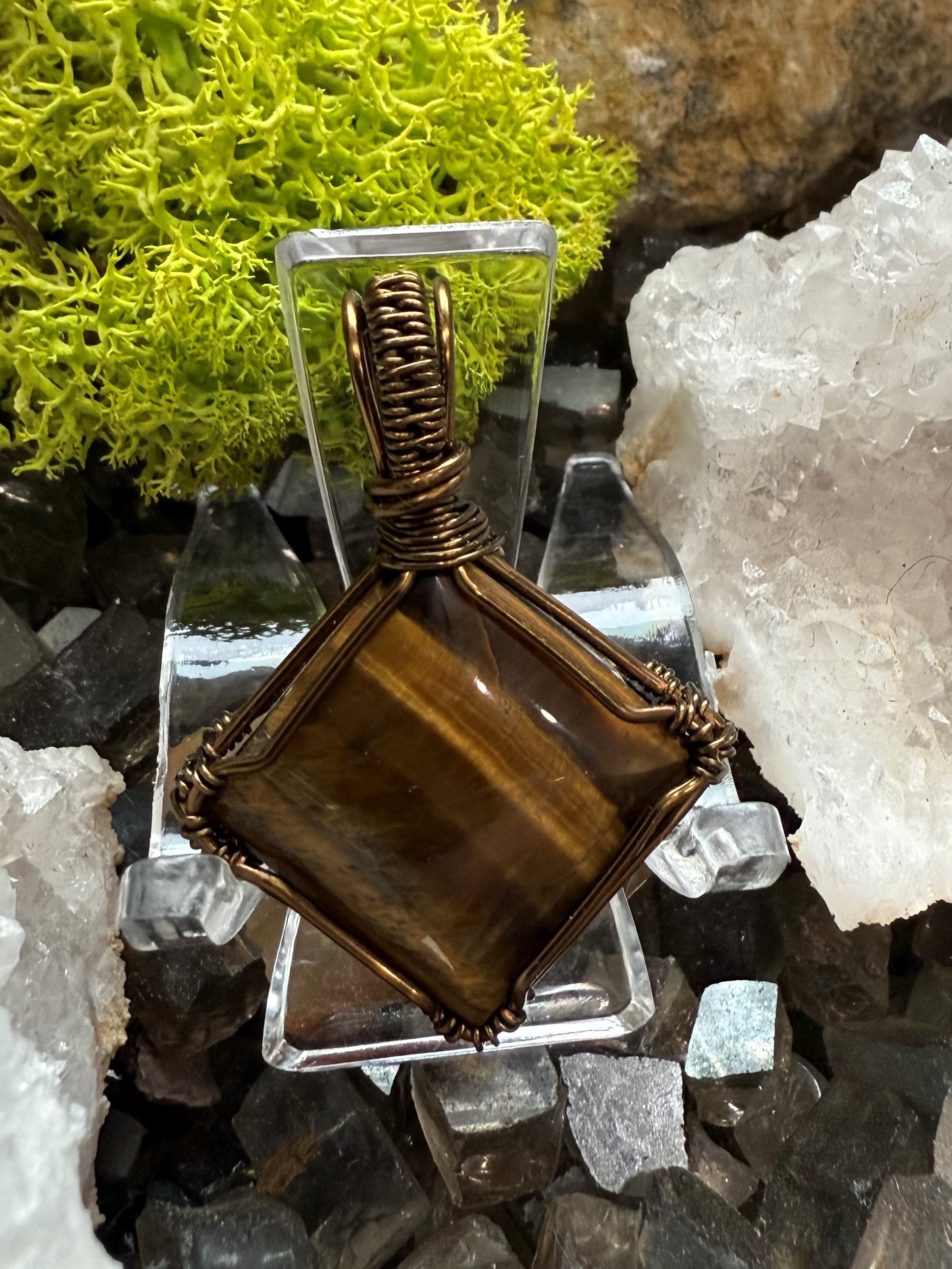 Von Hand geformtes und poliertes, natürliches und wunderschönes Tigerauge. Dieser Anhänger ist mit einem bronzefarbenen Kupferdraht umwickelt, der so konzipiert und beschichtet ist, dass er einer schnellen Oxidation widersteht.
