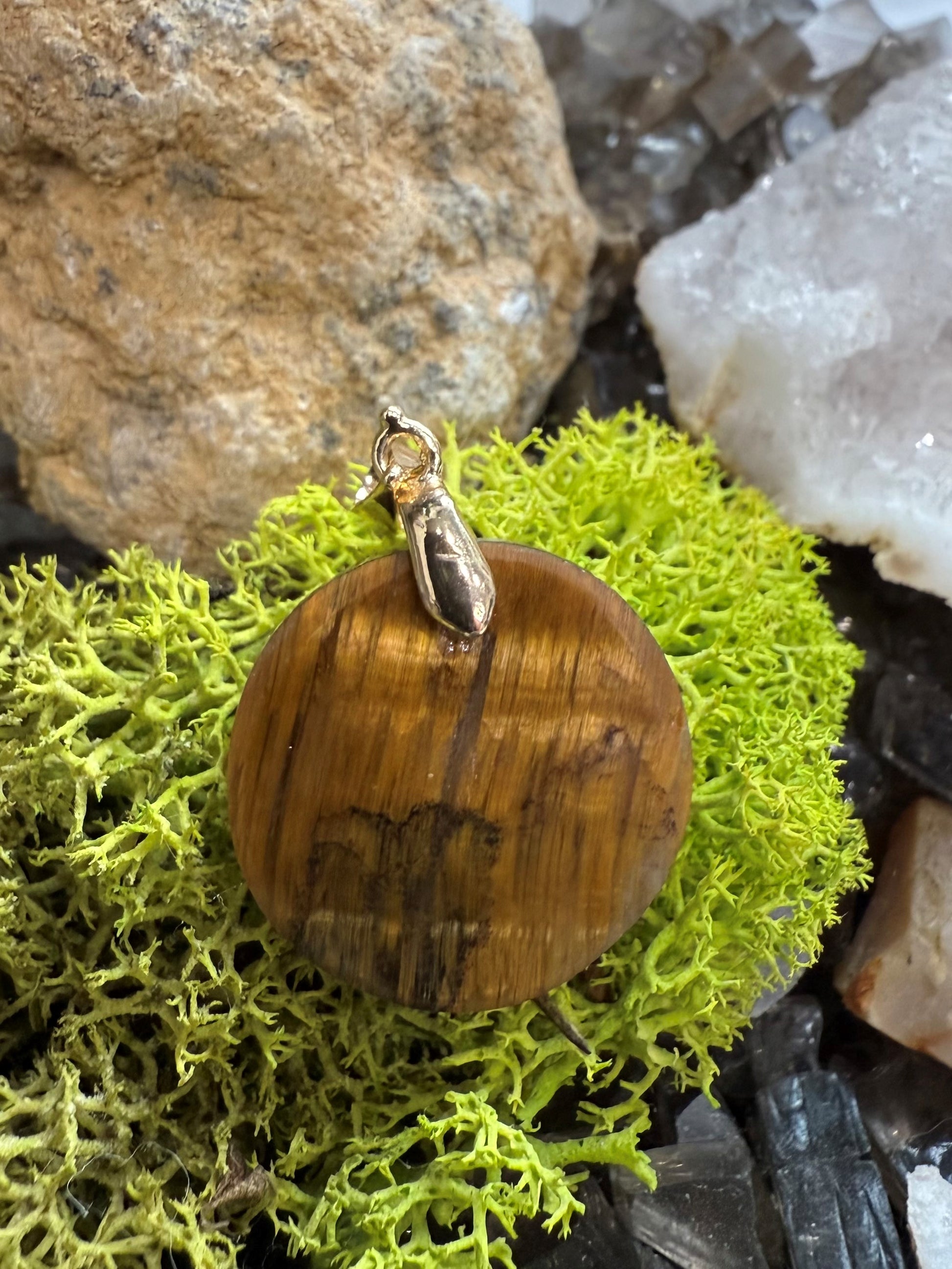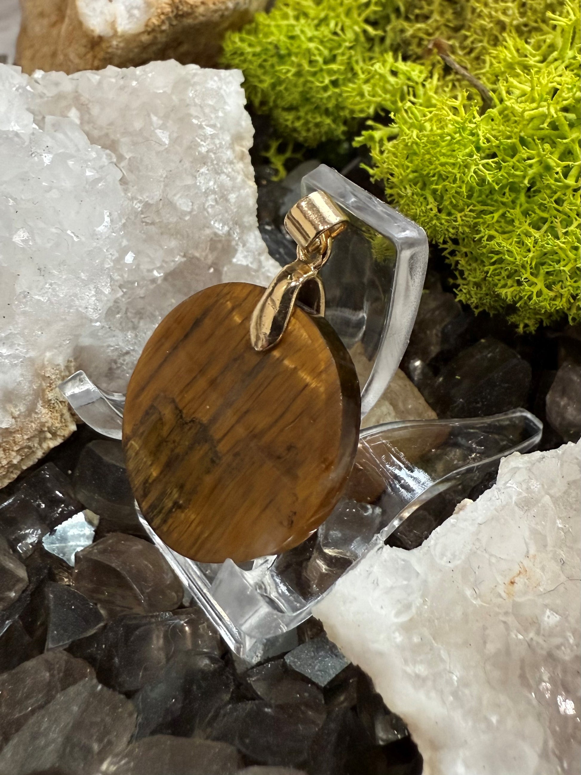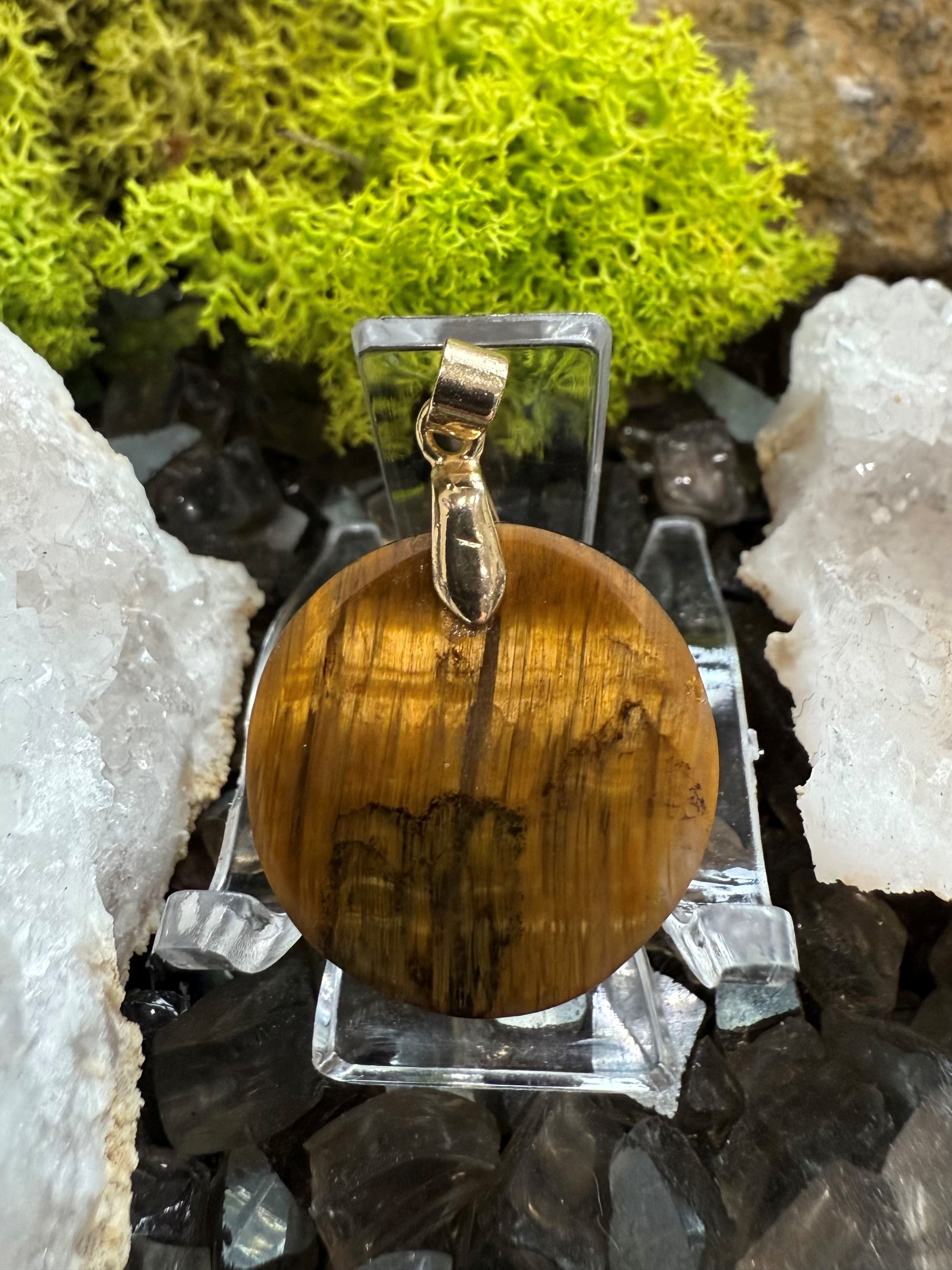 Von Hand geformtes und poliertes, natürliches und wunderschönes Tigerauge. Dieser Anhänger hat oben ein Loch und ist mit einer goldfarbenen Öse versehen.