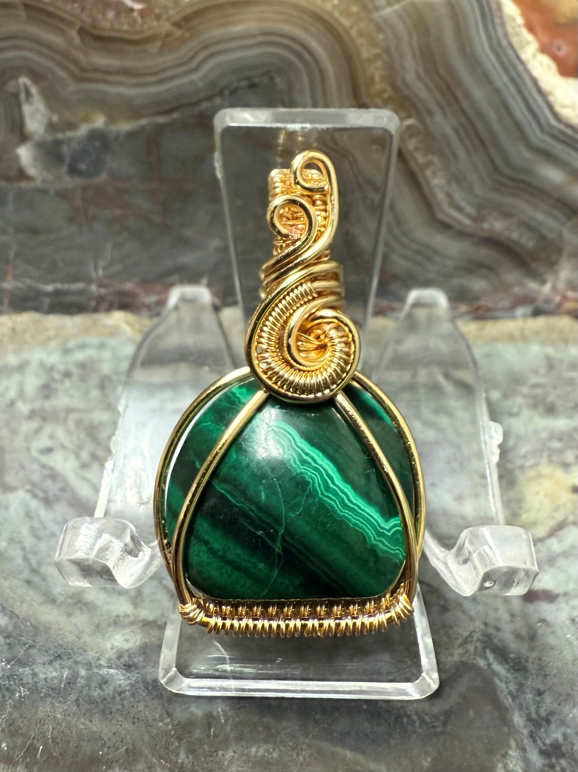 Hand shaped and polished, natural and beautiful, green Malachite necklace. This pendant is wrapped with a gold-colored copper wire that is designed and coated to resist rapid oxidation.