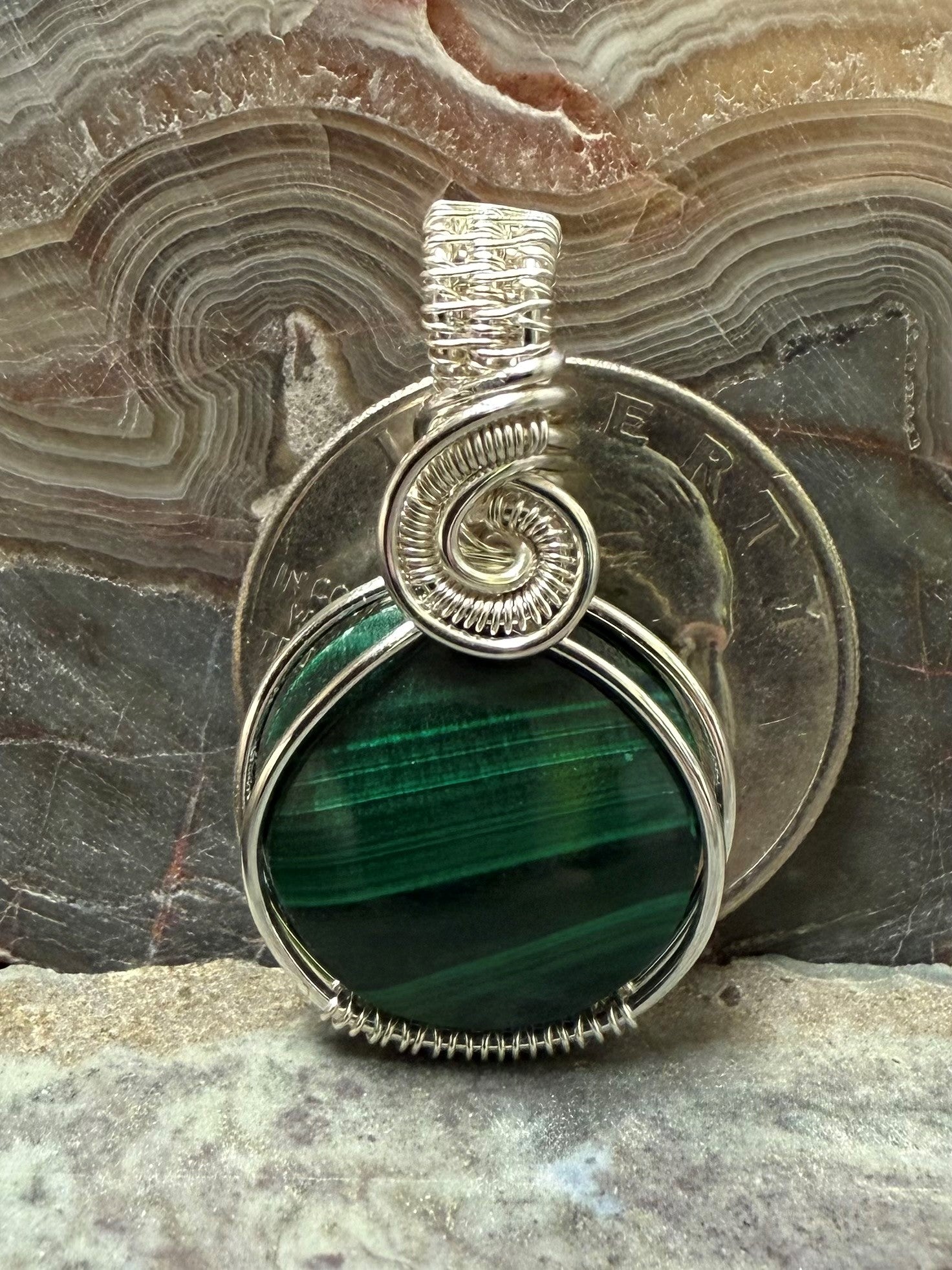 Hand shaped and polished, natural and beautiful, green Malachite necklace. This pendant is wrapped with a Silver-colored copper wire that is designed and coated to resist rapid oxidation.