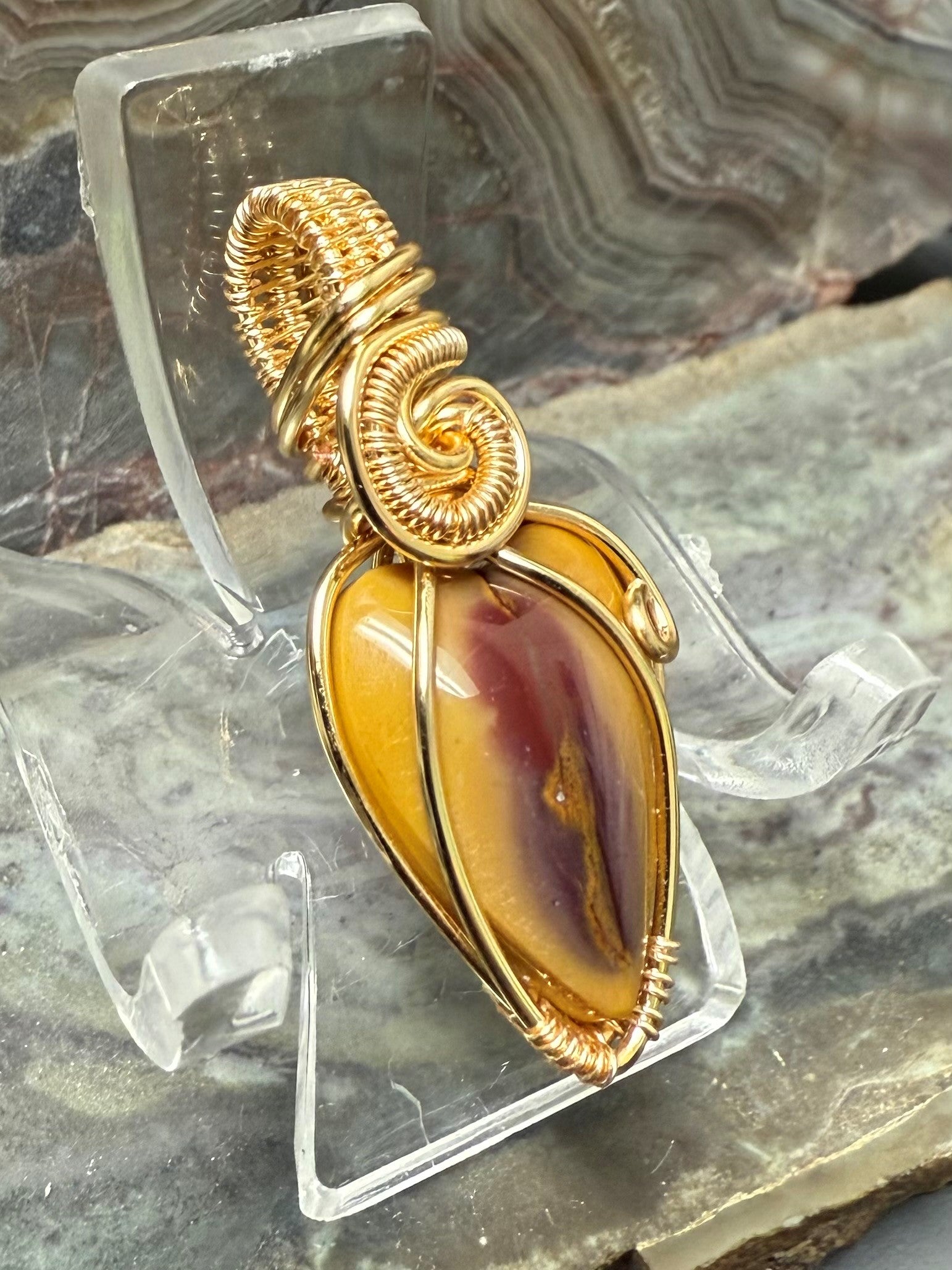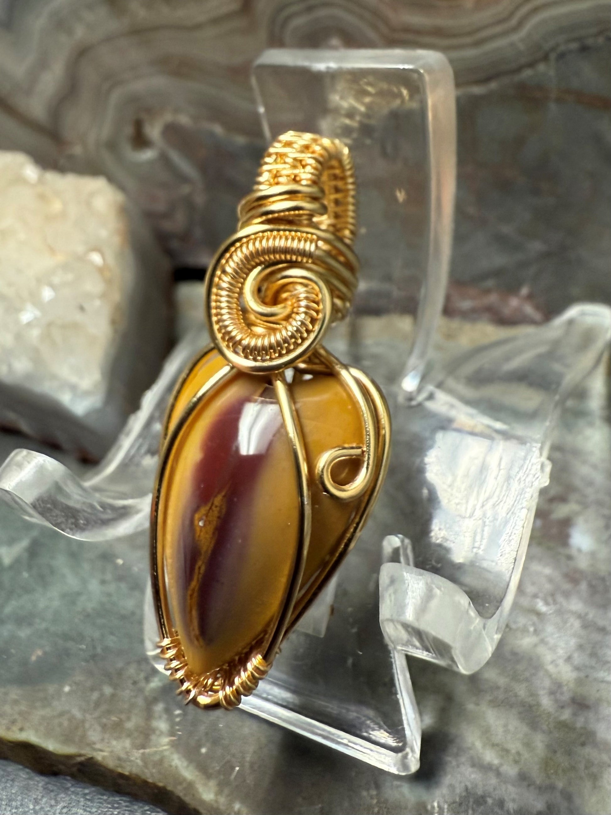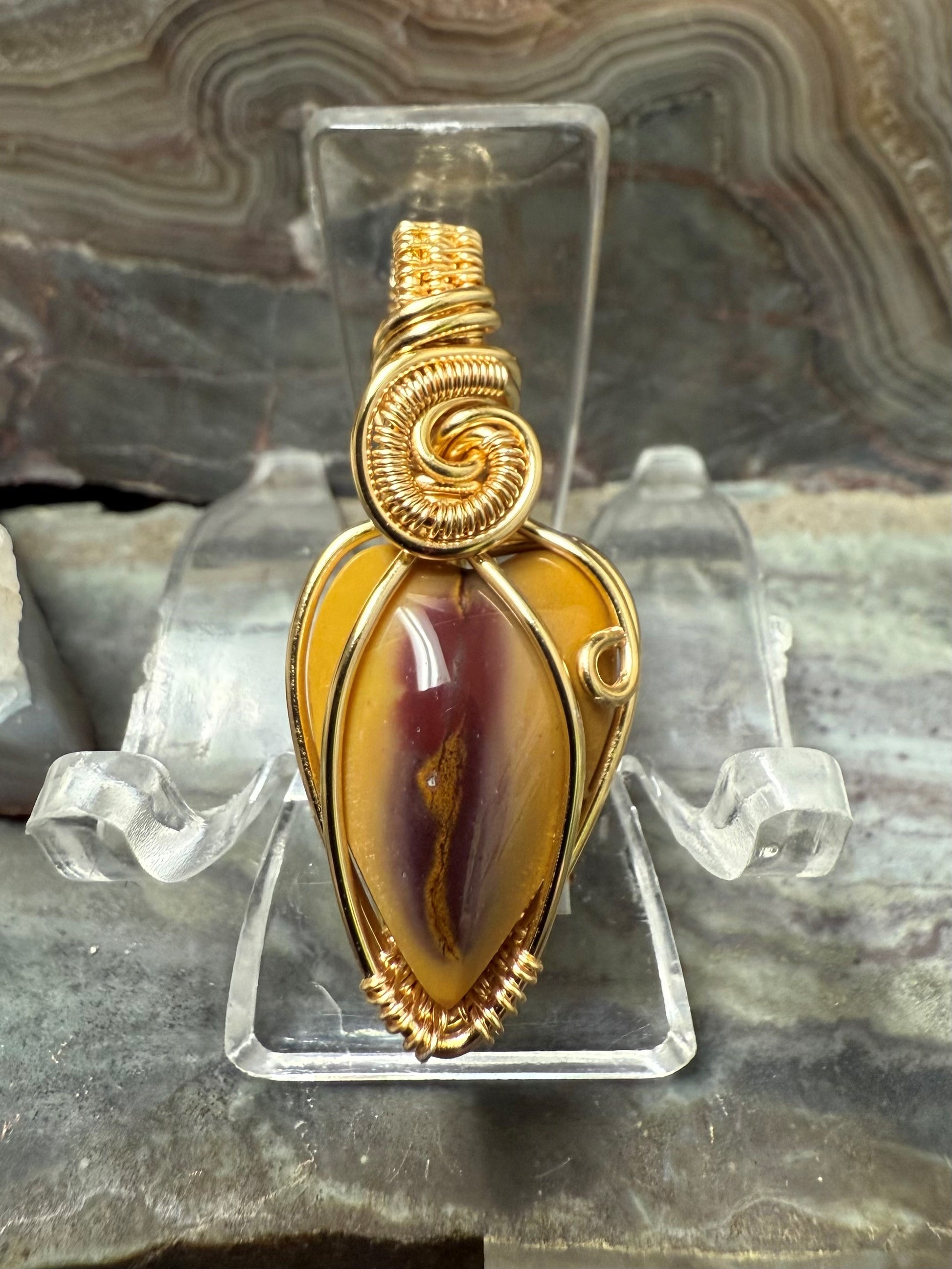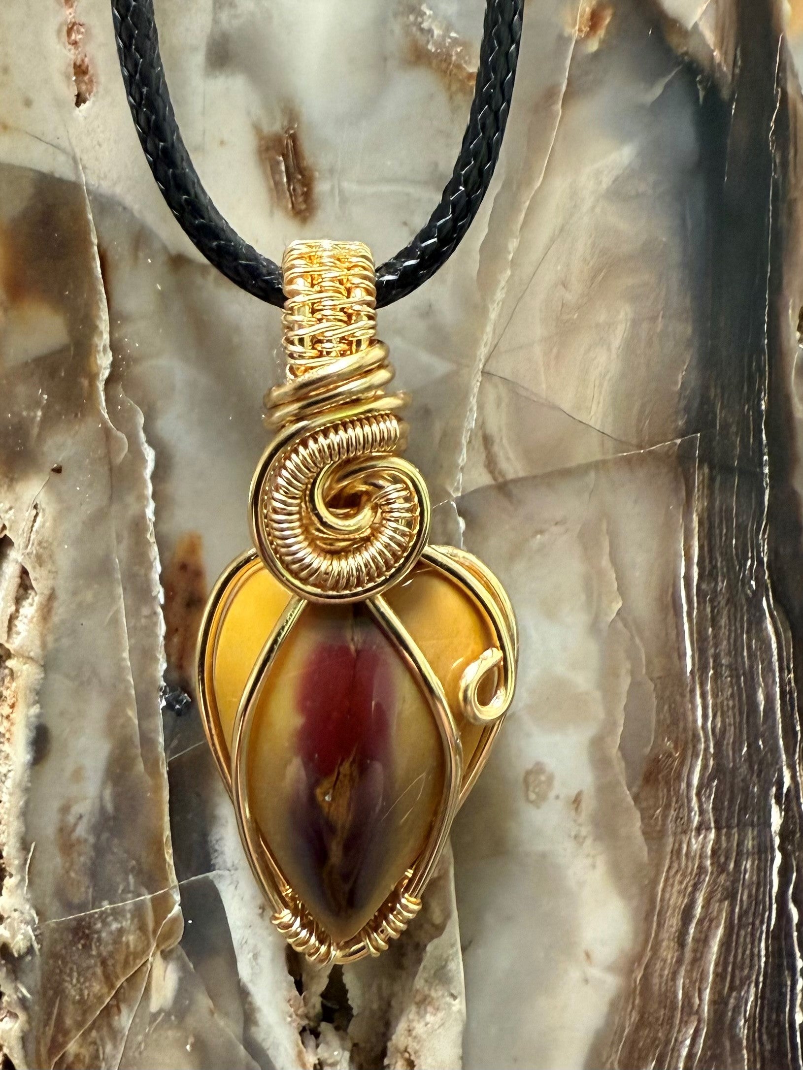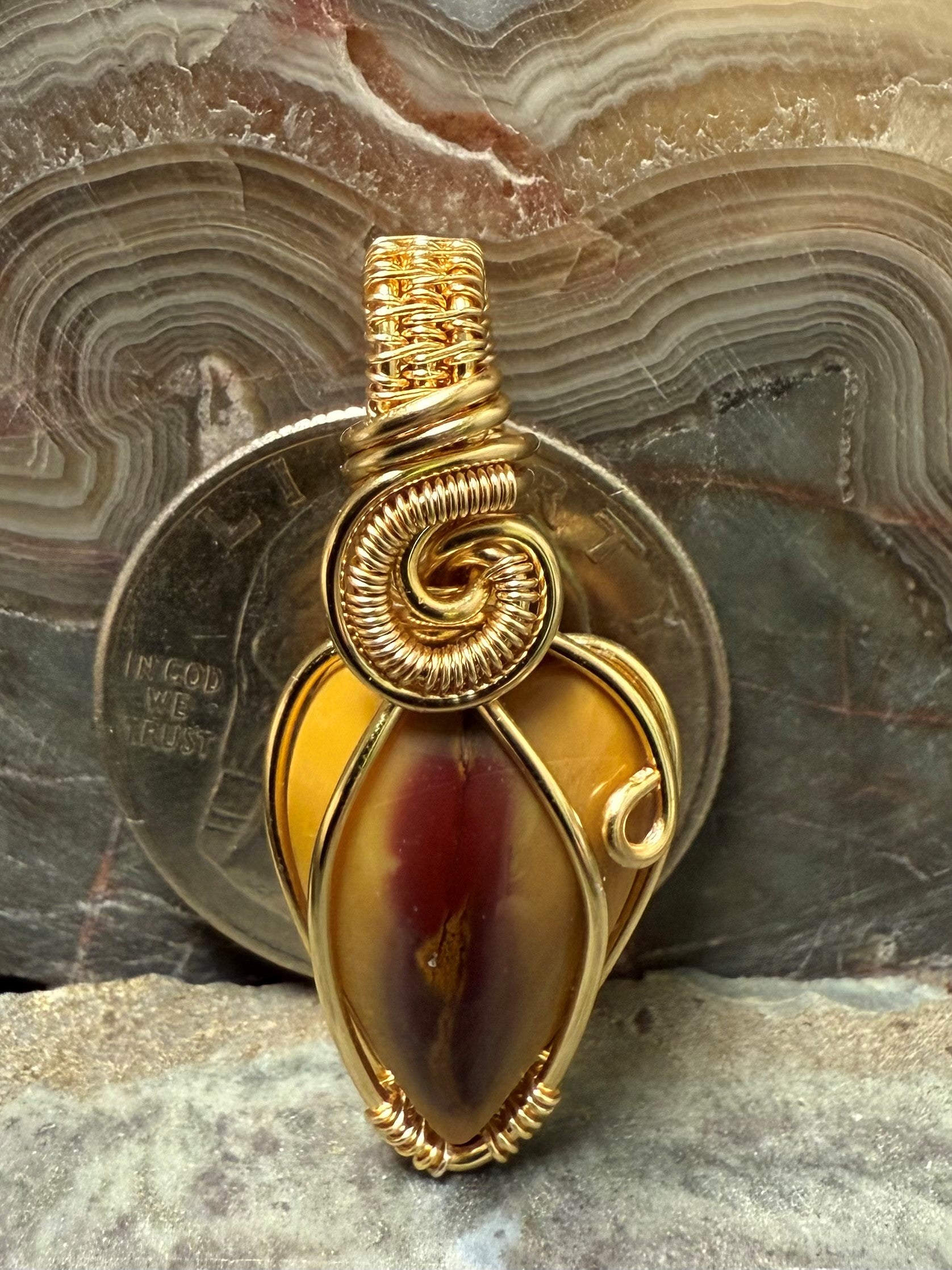 Hand shaped and polished, natural and beautiful, Australian Mookaite necklace. This pendant is wrapped with a gold-colored copper wire that is designed and coated to resist rapid oxidation.